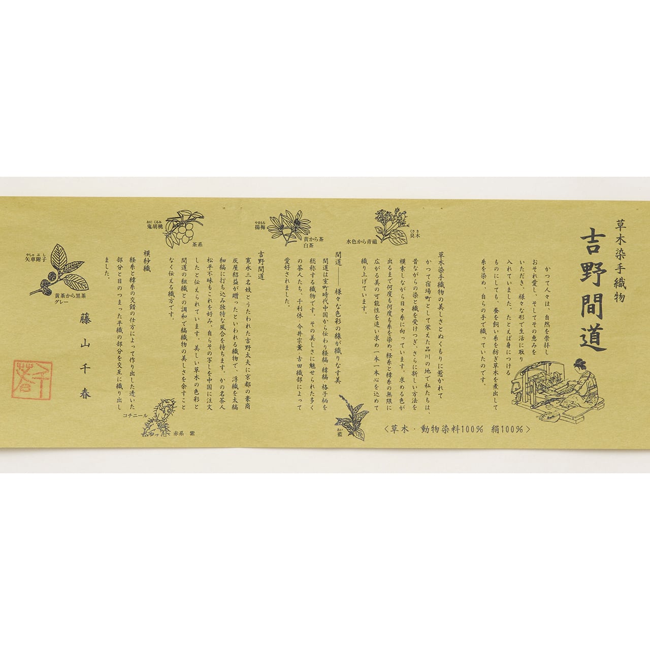草木染による洗練された色使いと、繊細な糸を巧みに使いこなし、香り立つような美しい布を織り続け、多くのファンを魅了する、藤山千春さんの吉野間道の九寸名古屋帯をご紹介させていただきます。