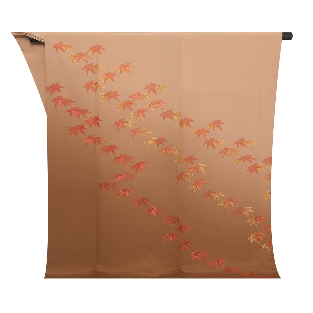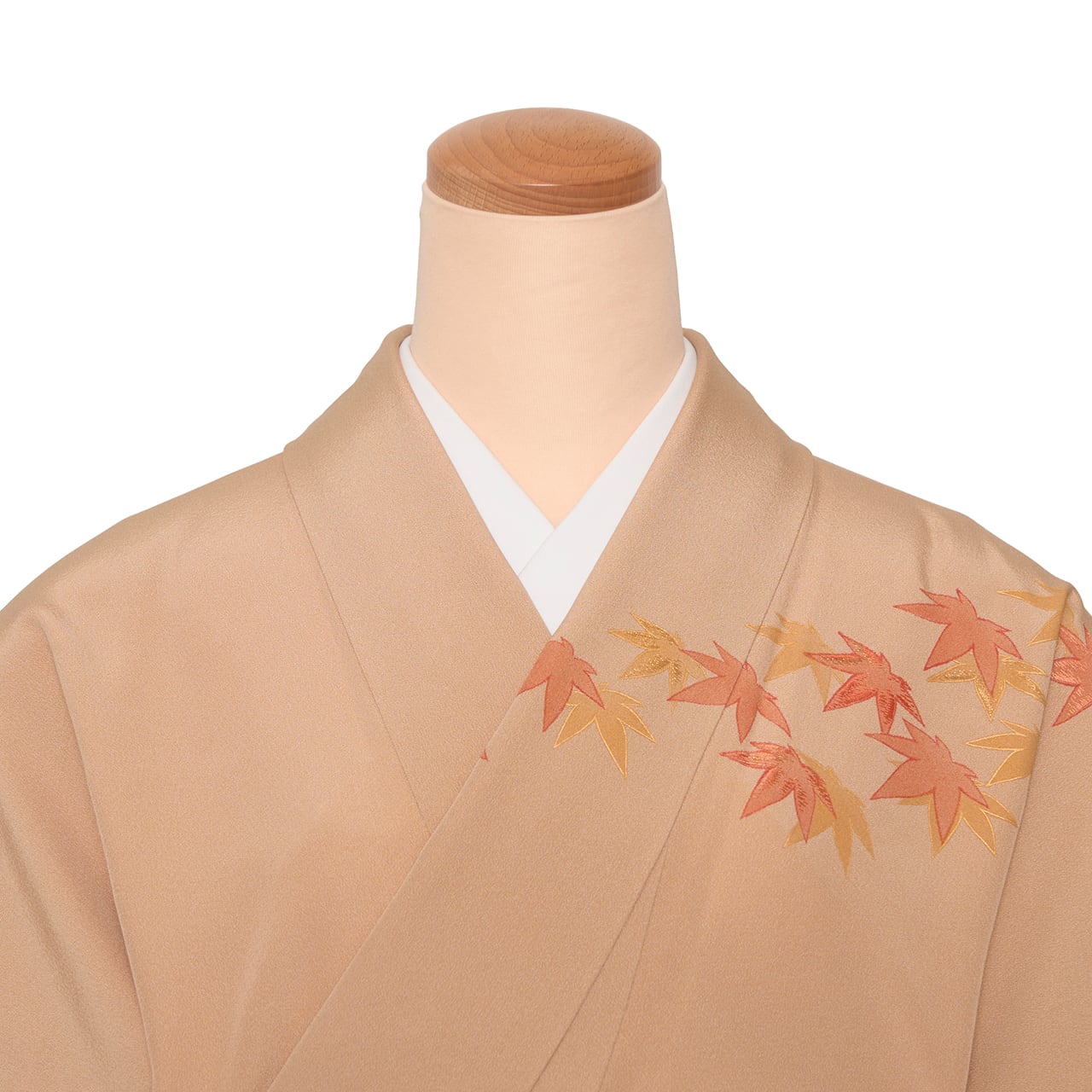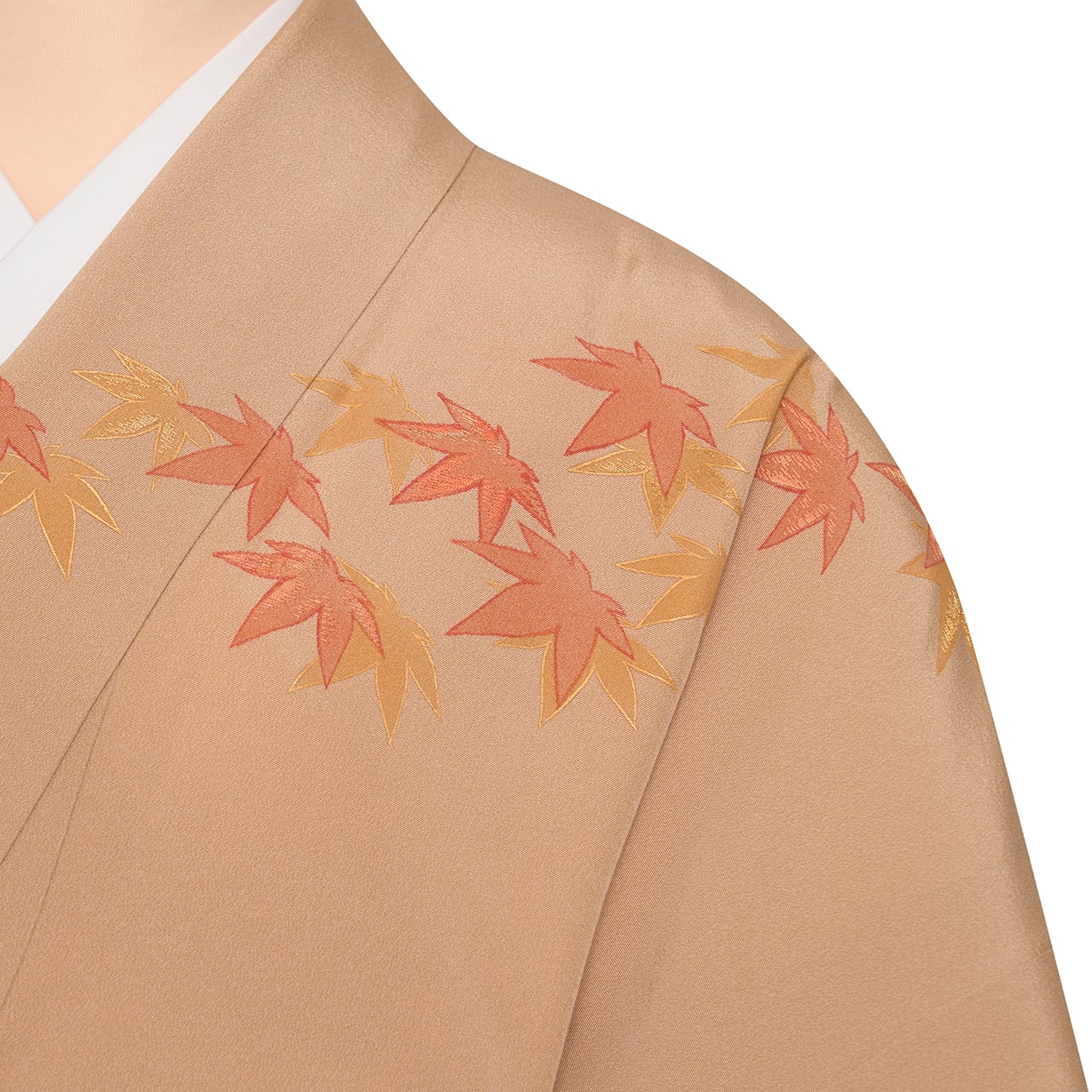 こちらは、まったりとした綺麗な薄茶・赤白橡の地に、裾からは煎茶色の濃い焦げ茶の暈しが入れられ、上前から下前に向かって、そして肩口や袖にとても綺麗な赤丹色と金色の紅葉が見事な刺繍で表された素晴らしい訪問着のお着物です。