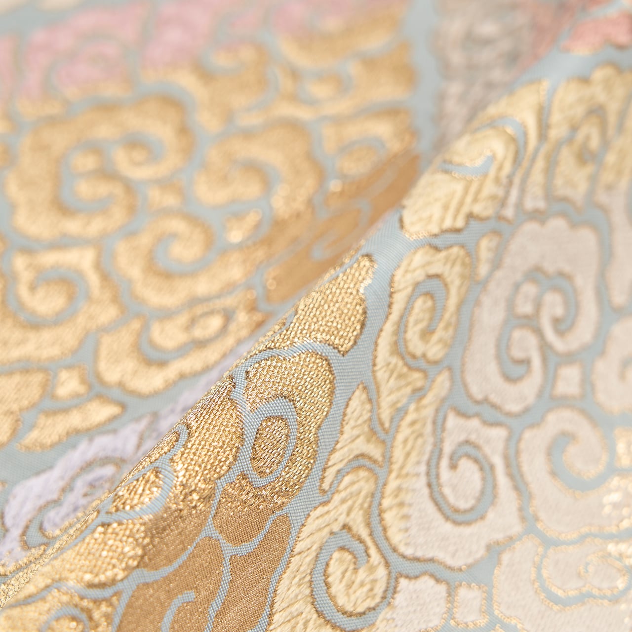 少し青味のある淡いグレー・灰青色のシャリっとした細い糸をたくさん使って織られた地に、帯幅に2つ並ぶくらいの大きさの菱の形が取られ、その中には雲を形どった模様が虹色と灰桜色、鳥の子色の黄色、白緑色、半色の薄紫などの淡い色合いの糸と金糸でグラデーションのように織られていますが、さらにそのグラデーションに合わせるかのように、唐織と錦織で強弱を付けて織り分けられ、立体感のある模様となった、とても素晴らしいとみやさんの袋帯です。