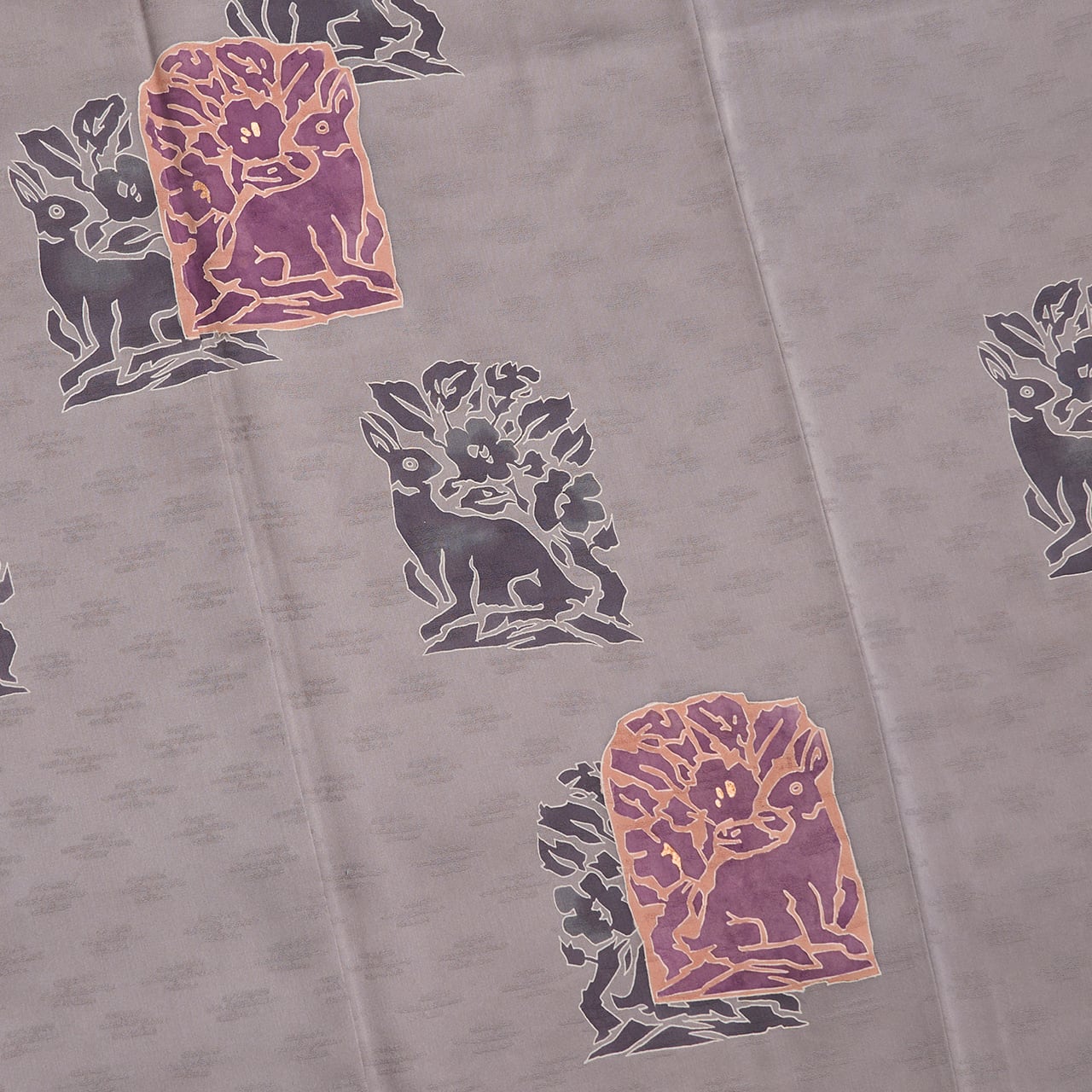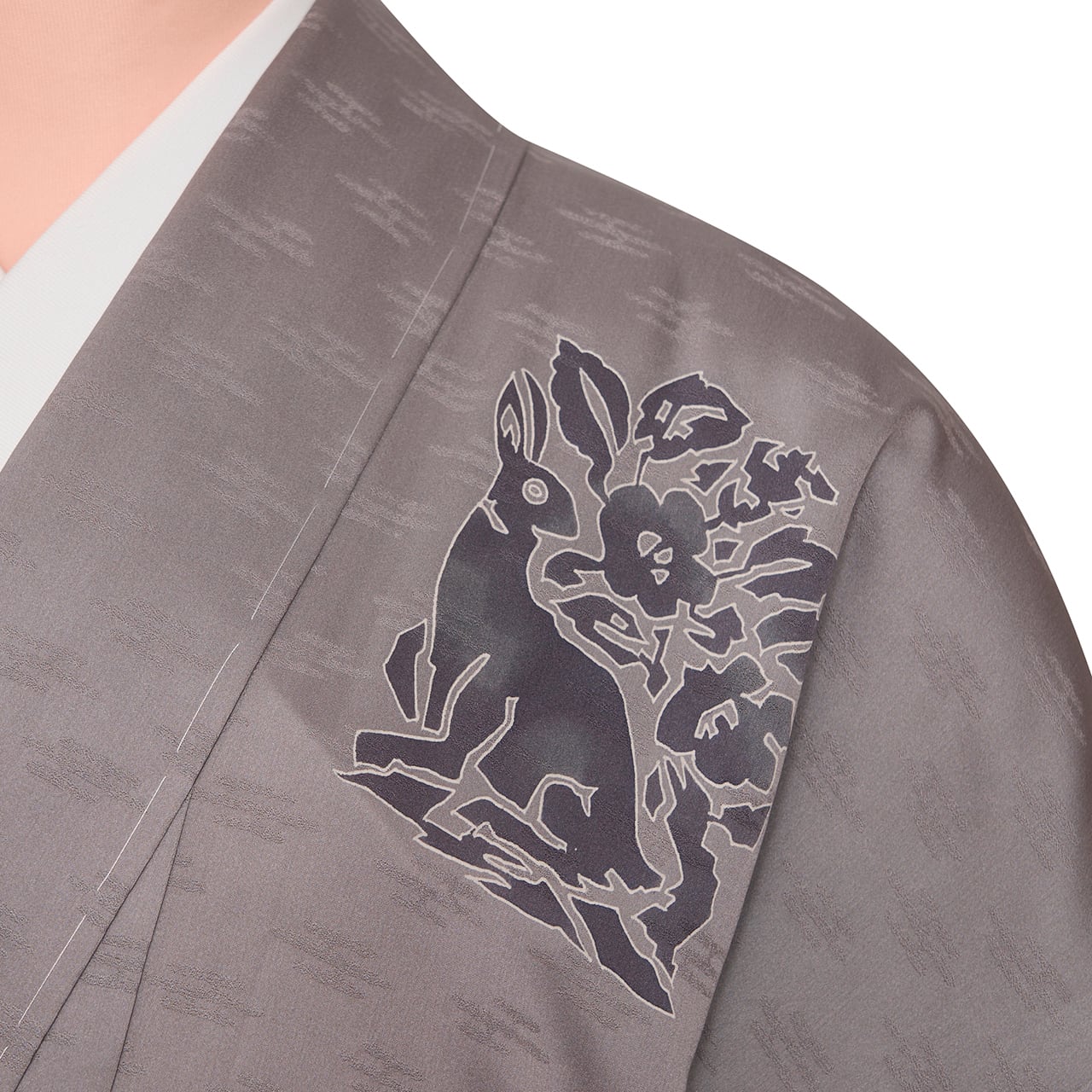 小さなエ霞の模様が織り込まれた上質な紋意匠の生地に、少しグレー味のある淡い薄紫・薄色が染められ、上前や肩や袖には大振りな花うさぎの模様が貝紫で染められた、お洒落な雰囲気の訪問着のお着物です。