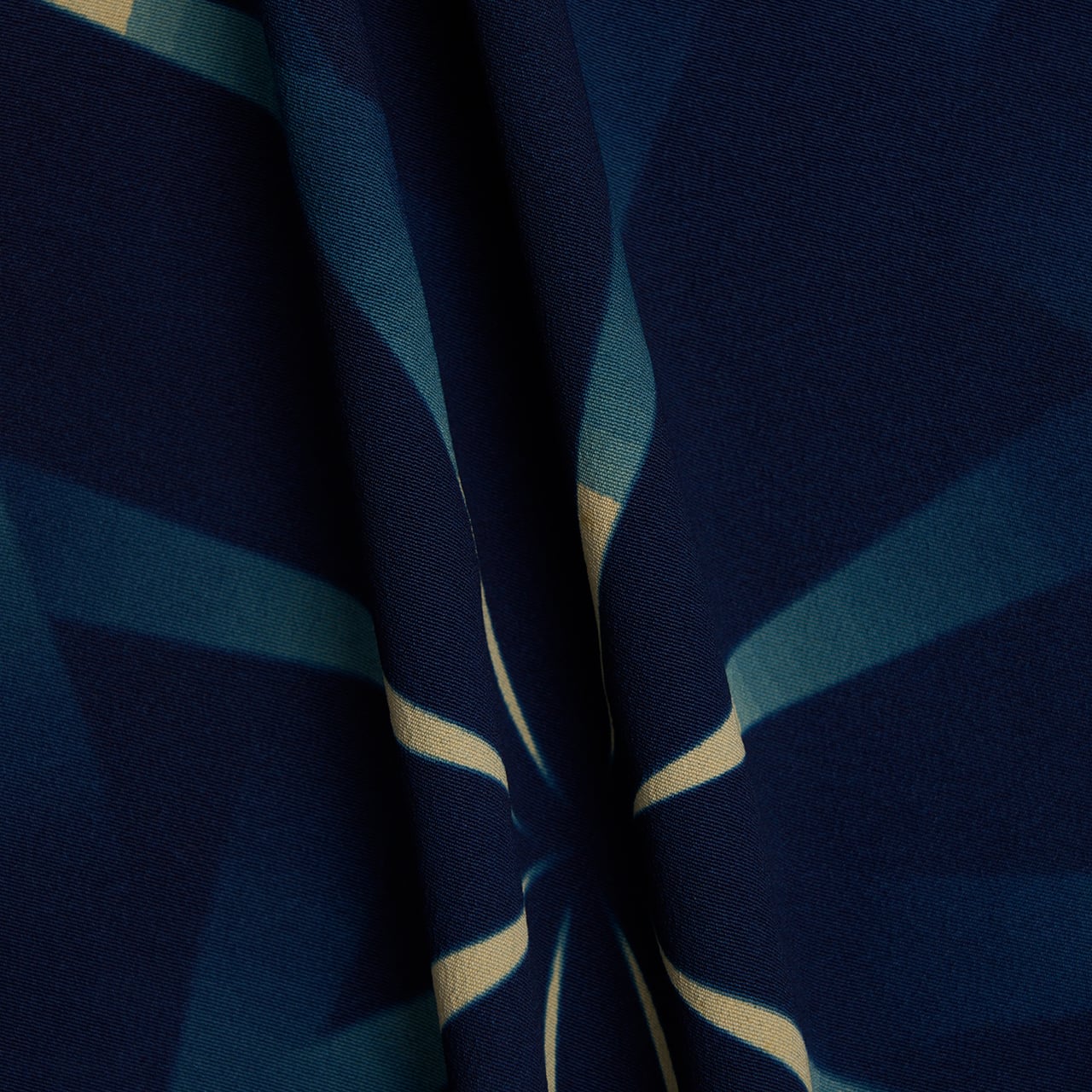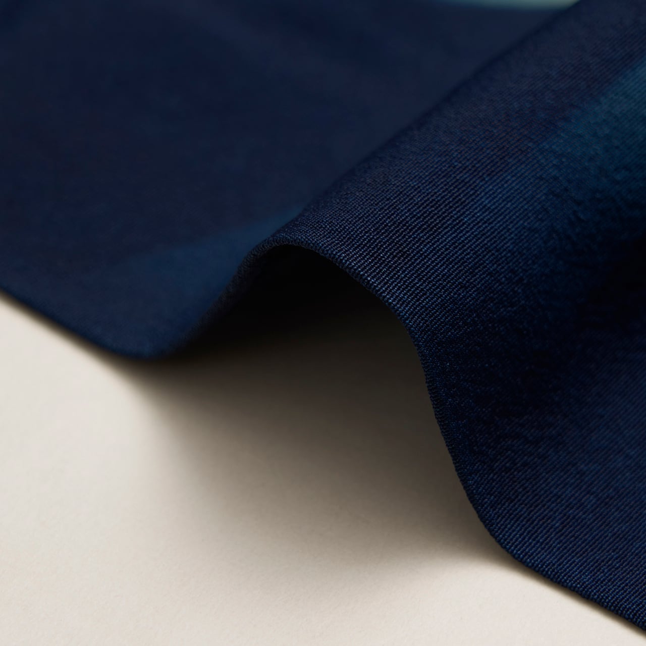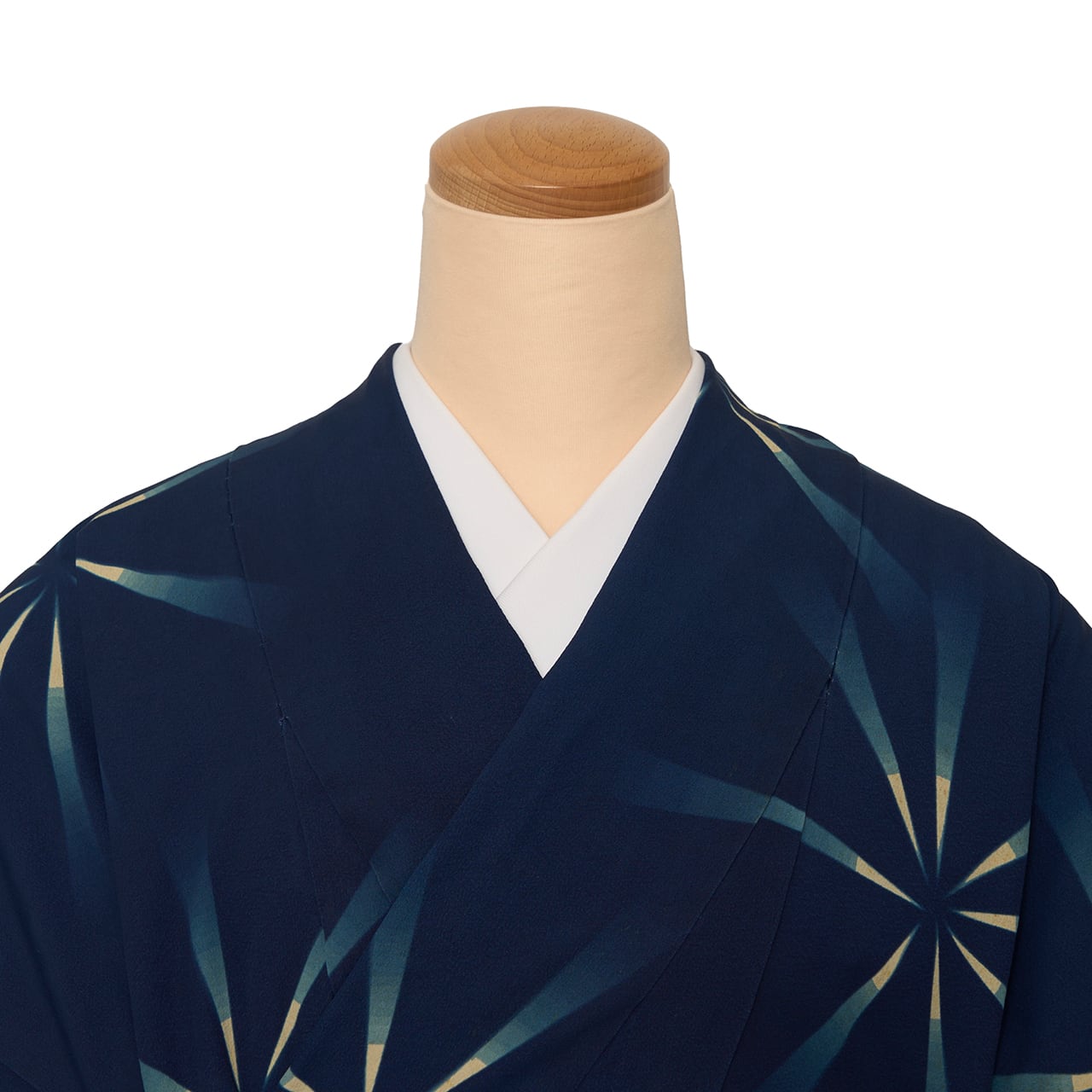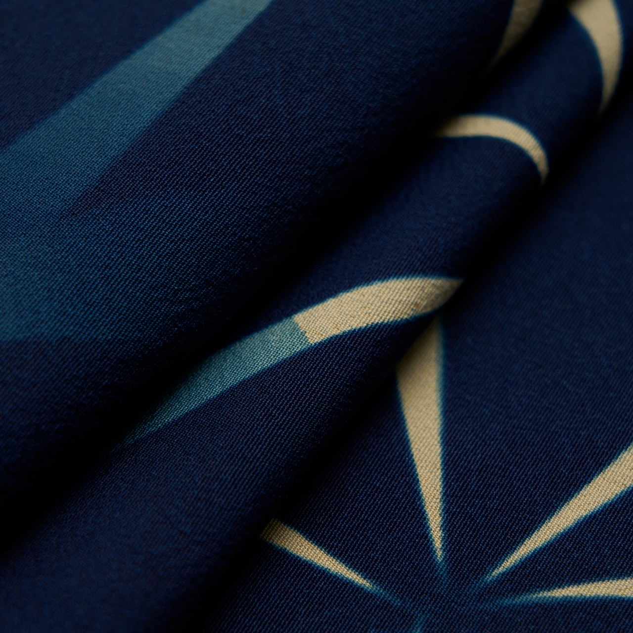 こちらは、上質な浜ちりめんの一越ちりめんの生地が、濃く深い藍色に染められたところに、細い三角の形が放射線状に広がって、お花のような、花火のような模様が染め抜かれ、綺麗なグラデーションを描いた、素晴らしいお着物です。