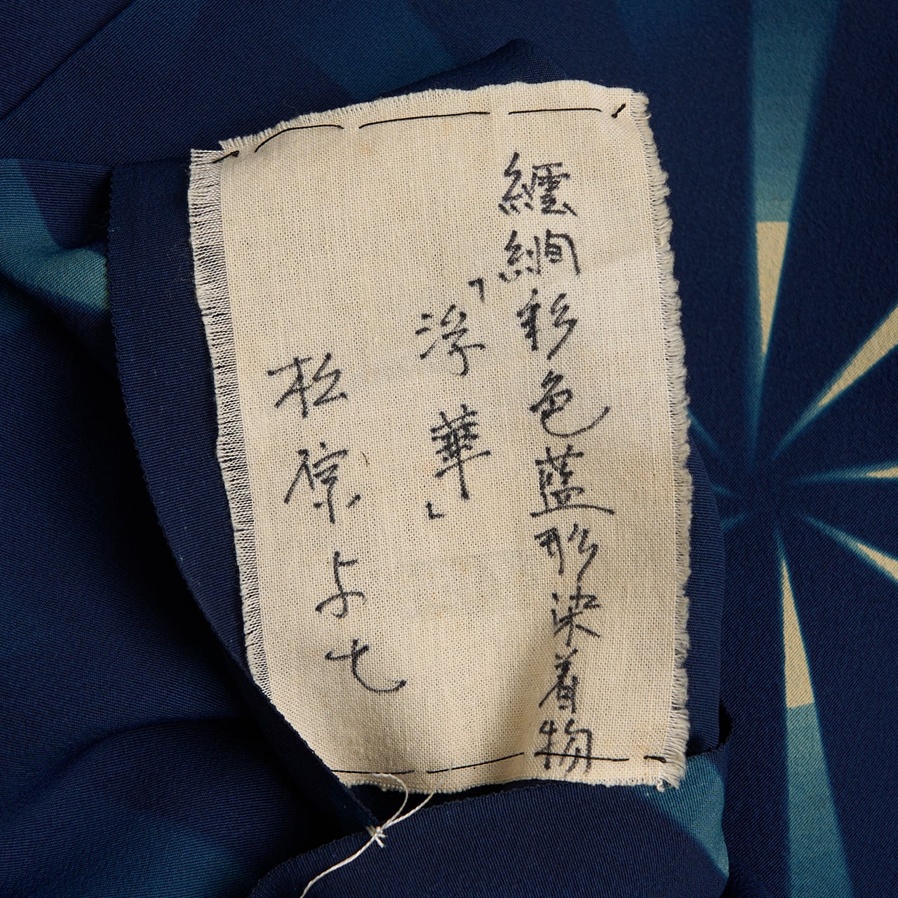 長板中形染に長年取り組まれ、他の追随を許さないような完成度の高い優れたデザインの作品を多く残された松原與七さんですが、その創作活動の中でもひとつのライフワークとされていた、「繧繝彩色藍形染」のお着物地の作品を今回ご紹介できることを大変嬉しく思います。