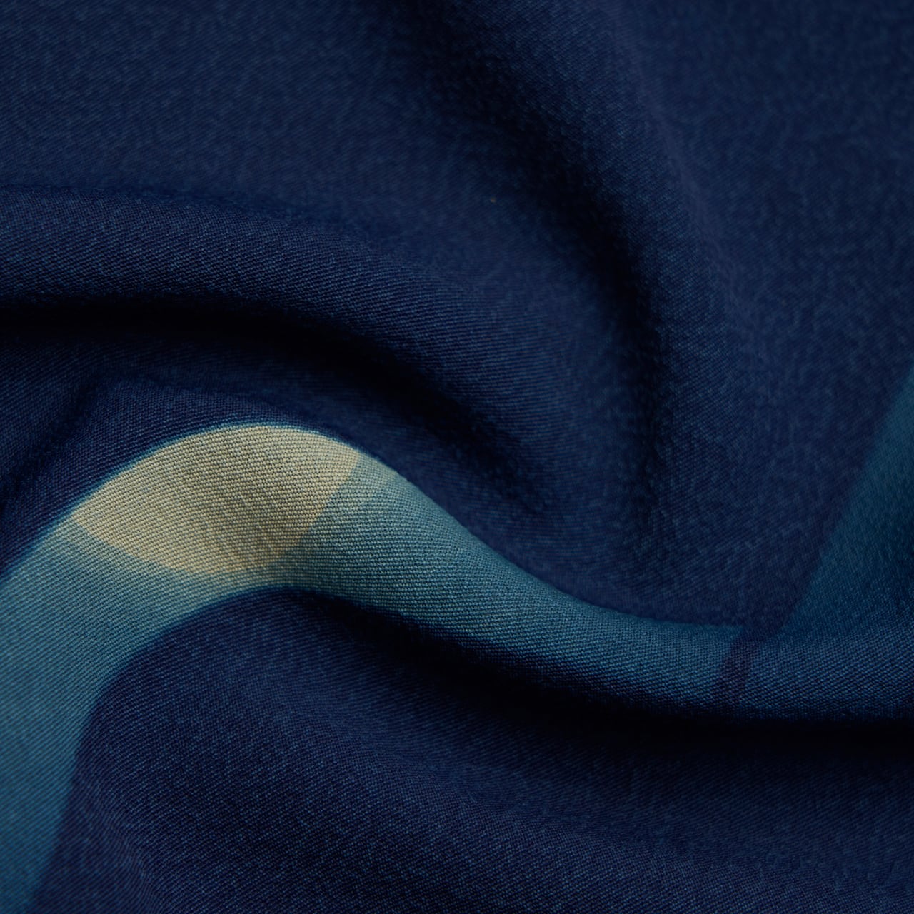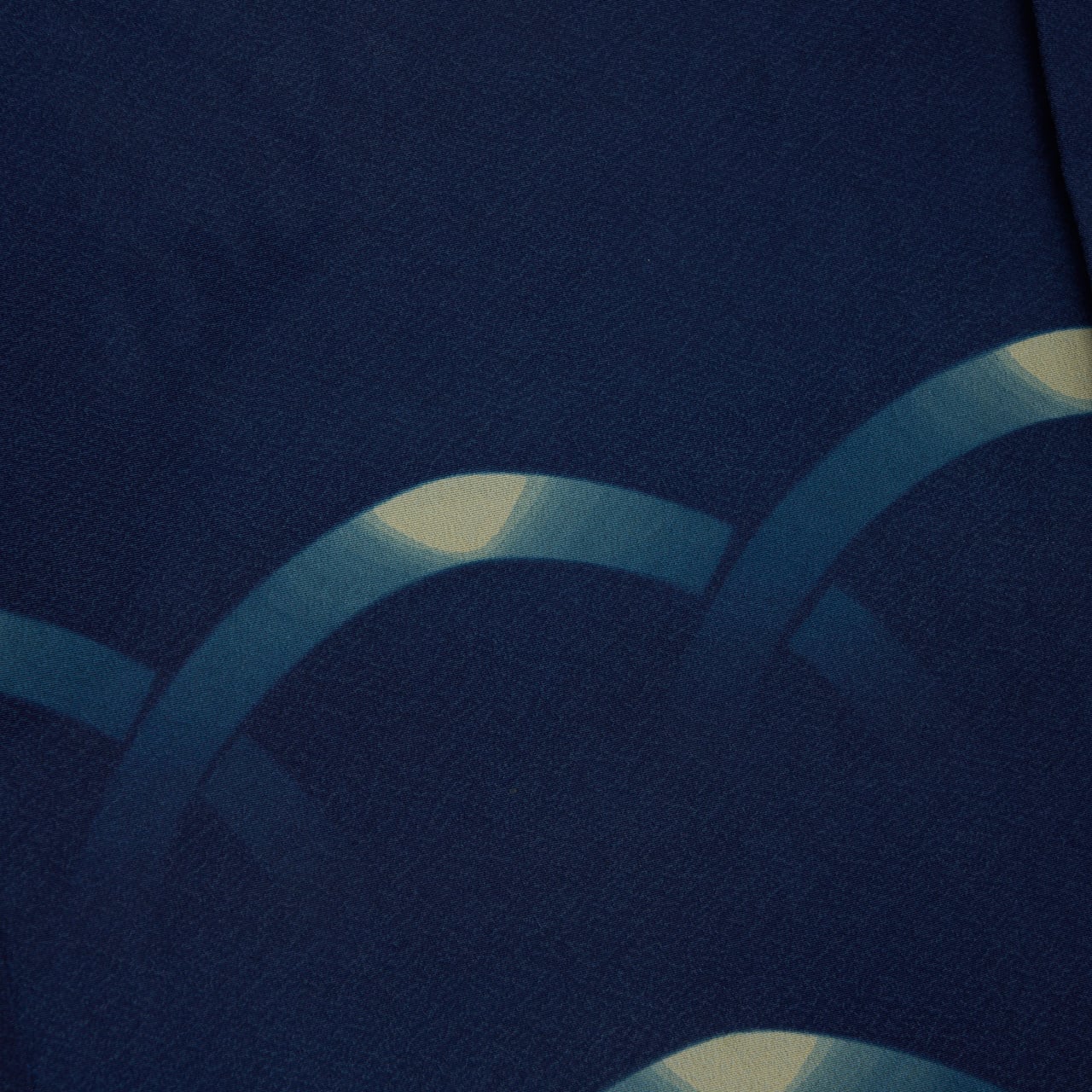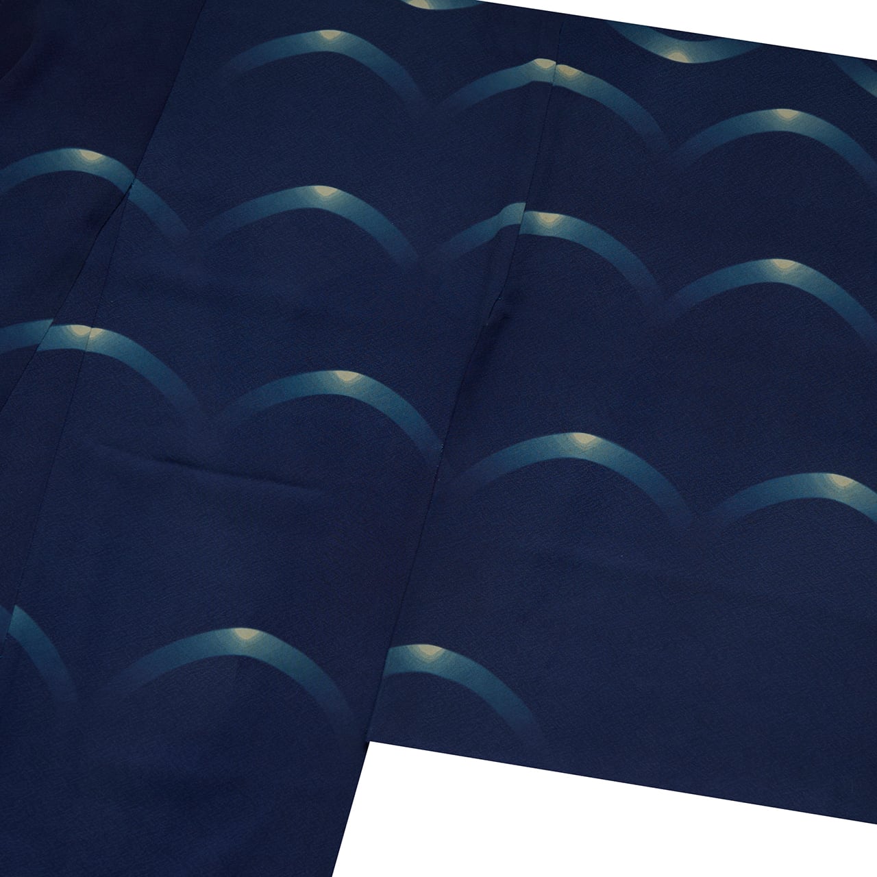 こちらは、上質な浜ちりめんの一越ちりめんの生地が濃い藍色に染められ、大きく弧を描く曲線が連なって並んだように描かれ、その中はその曲線とは反対の方向から暈しが入れられるという面白い手法で染められた、変化のある露芝のような動きの感じられる素敵な模様のお着物です。