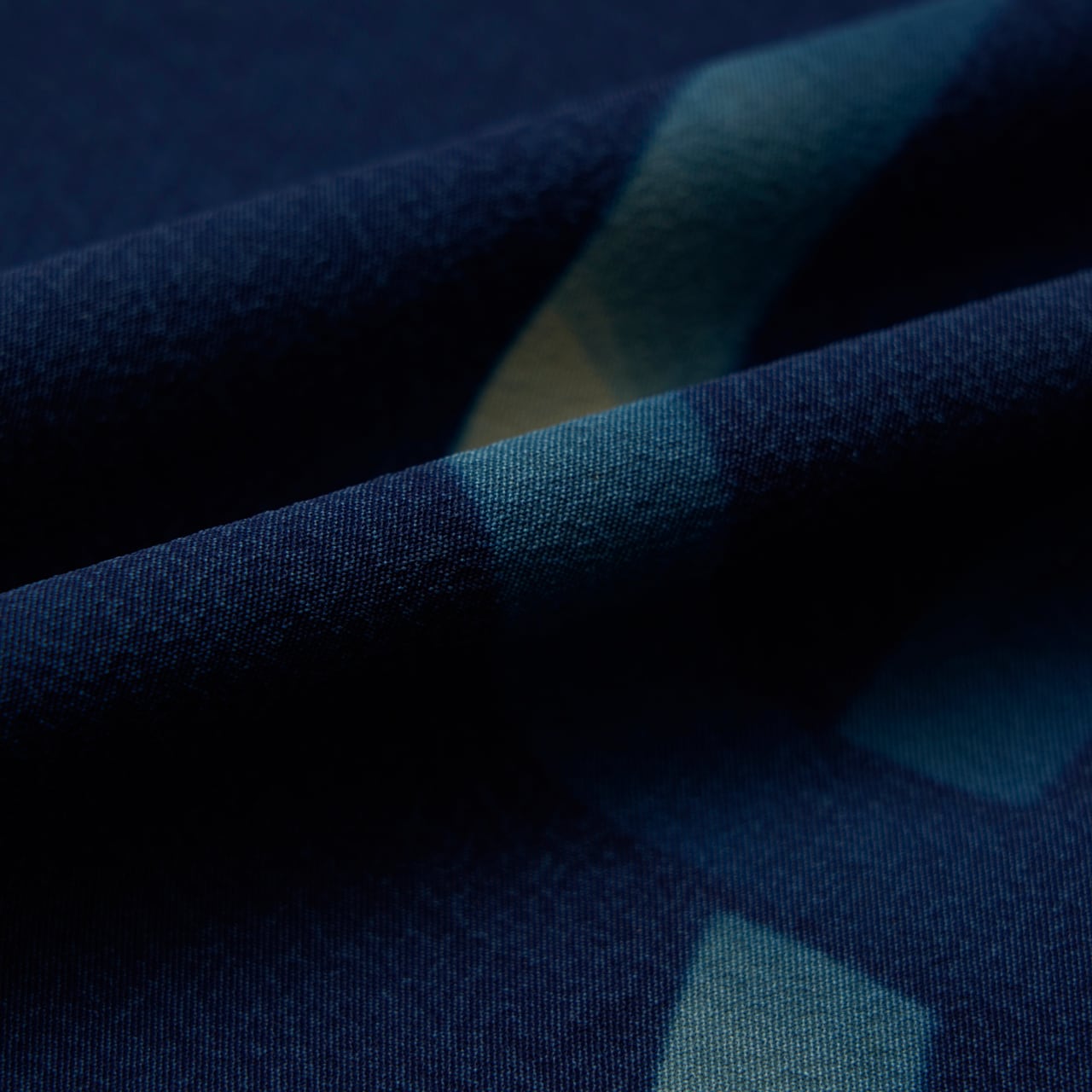 幾重にも重なる藍の濃淡が奏でる繧繝(うんげん)の染め色の妙味は素晴らしく、色相の数だけ型を取り換え、糊を置いては染めることを何十回も繰り返し生まれてくる模様ですが、染める生地に適した糊をつくることにも試行錯誤を繰り返され、染める濃度によって藍とやり取りをしながら発酵を調整され、非常に真剣に取り組まれたことが顕著にわかるような、素晴らしい作品群です。