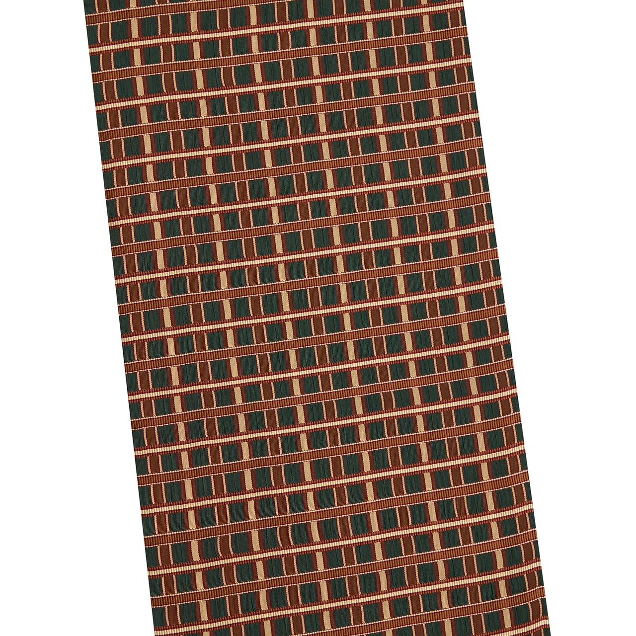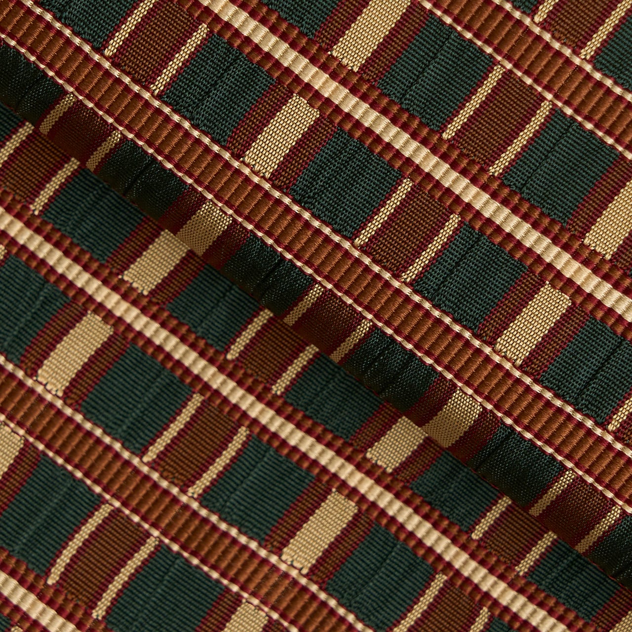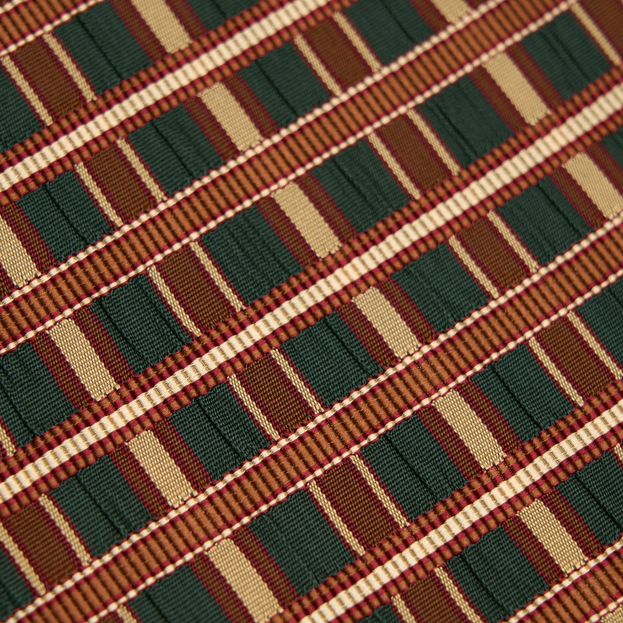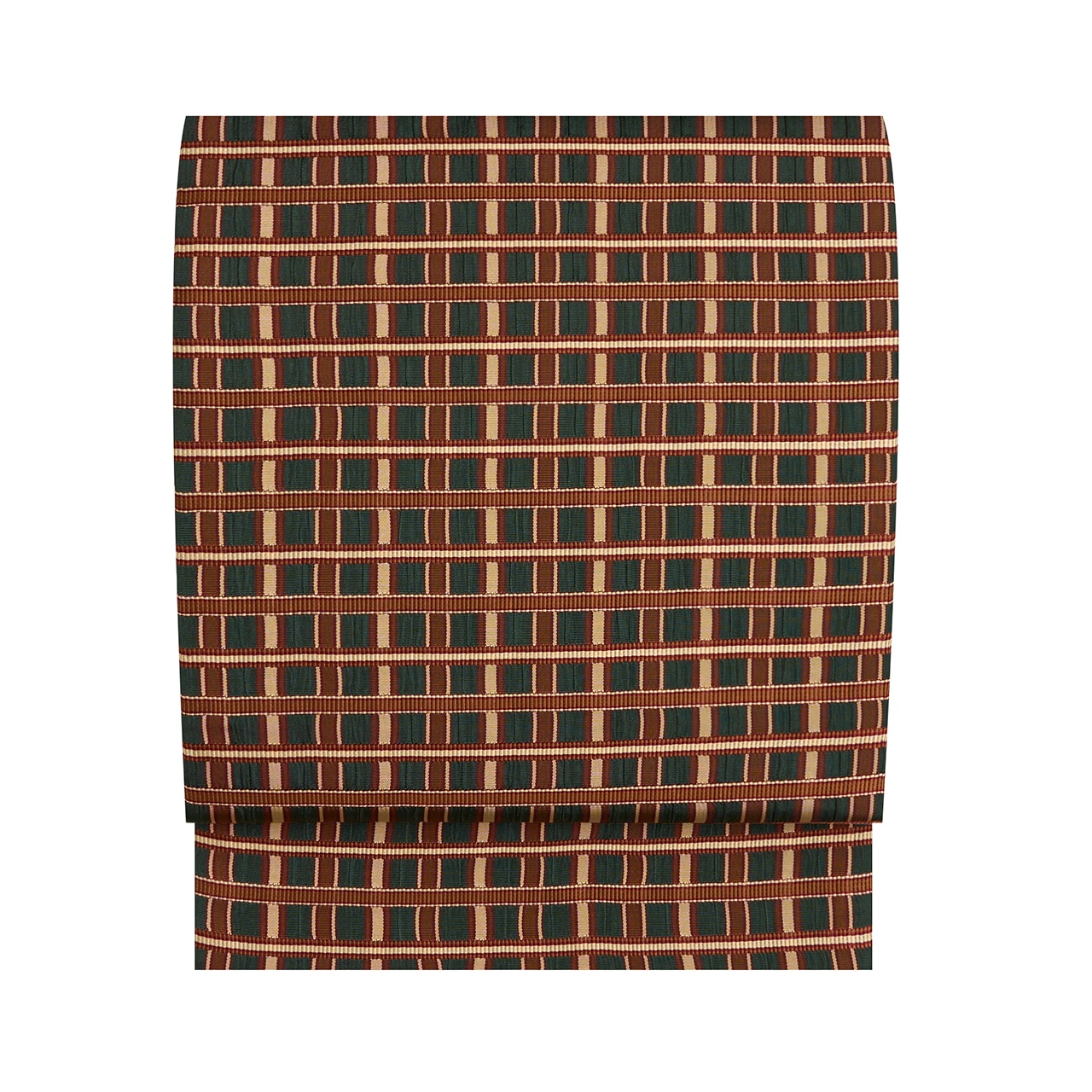 名物裂の代表的な文様のひとつで、濃い緑色に焦げ茶色の真田織の縞が縦と横に織り込まれた、オリジナルといわれるものに近い間道手の全通の袋帯です。