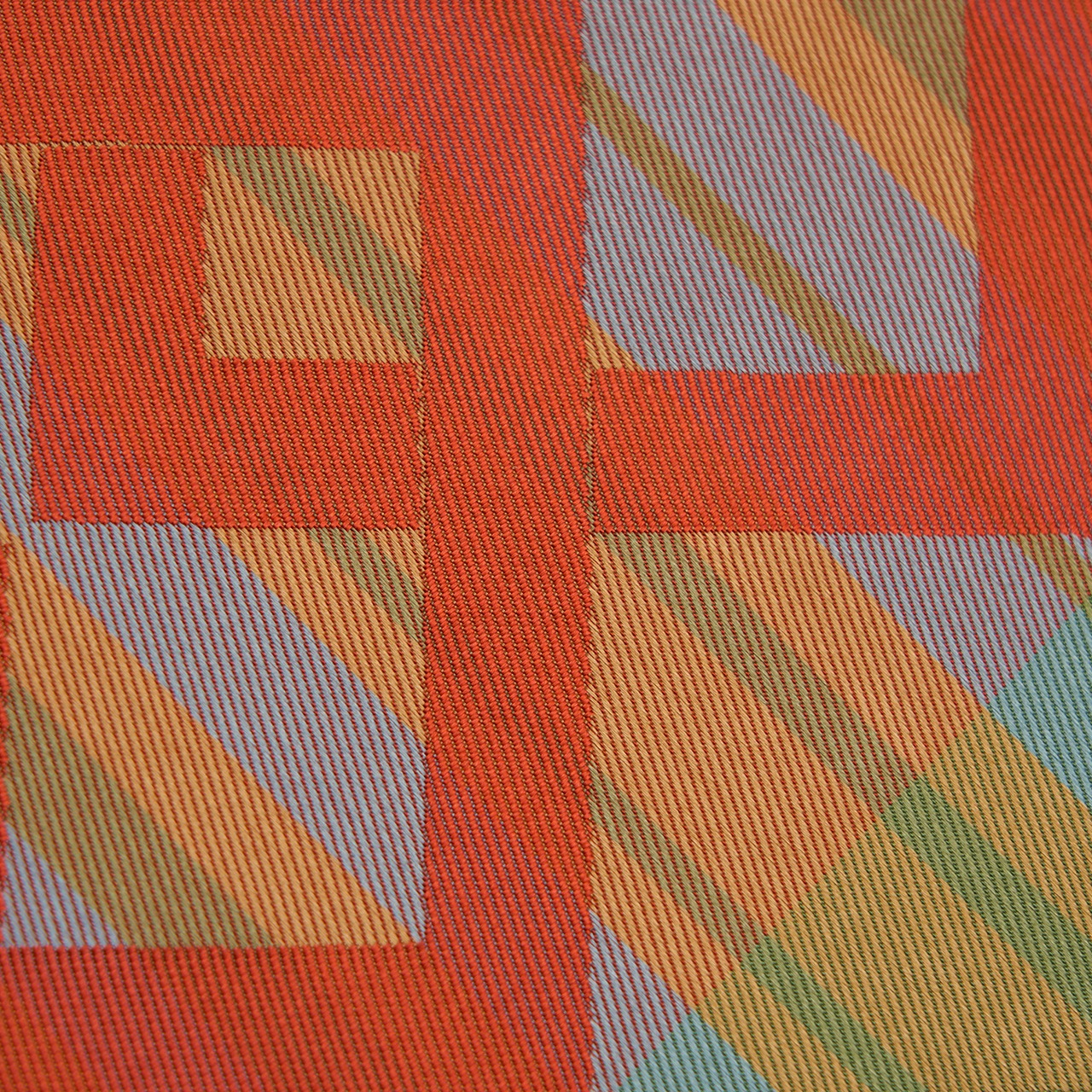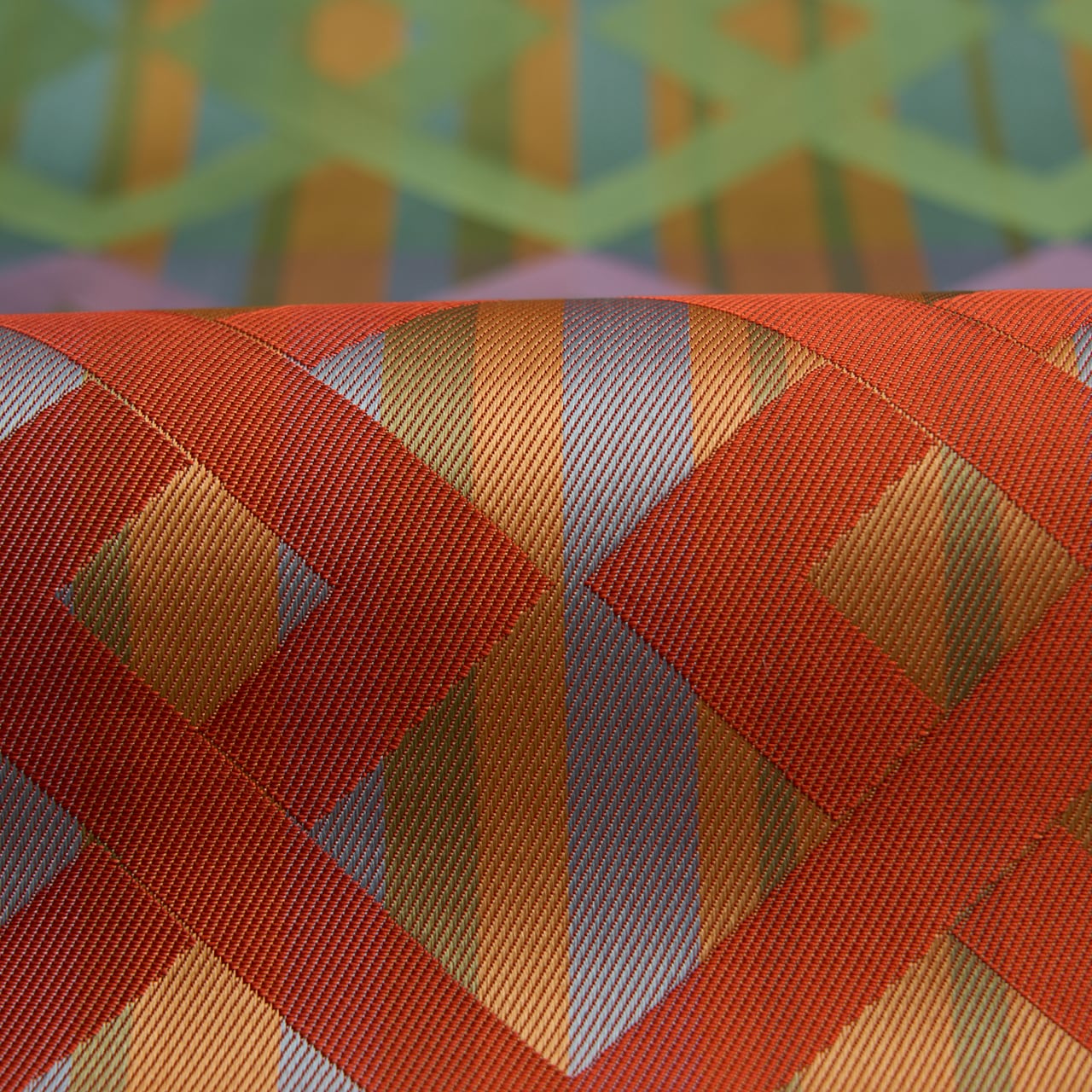 ランダムな幅の縦縞が織られ、それが水浅葱色や薄色、紺鼠色など緯糸の色を変えて段変わりになった地に、蘇芳色の赤、花緑青の緑、二藍色の紫の大きな四角が組み合わさって連なっているような模様が織り出された、大胆なデザインと色使いがとても格好良い印象の、喜多川俵二さんの作品としては少し珍しいタイプの九寸名古屋帯です。