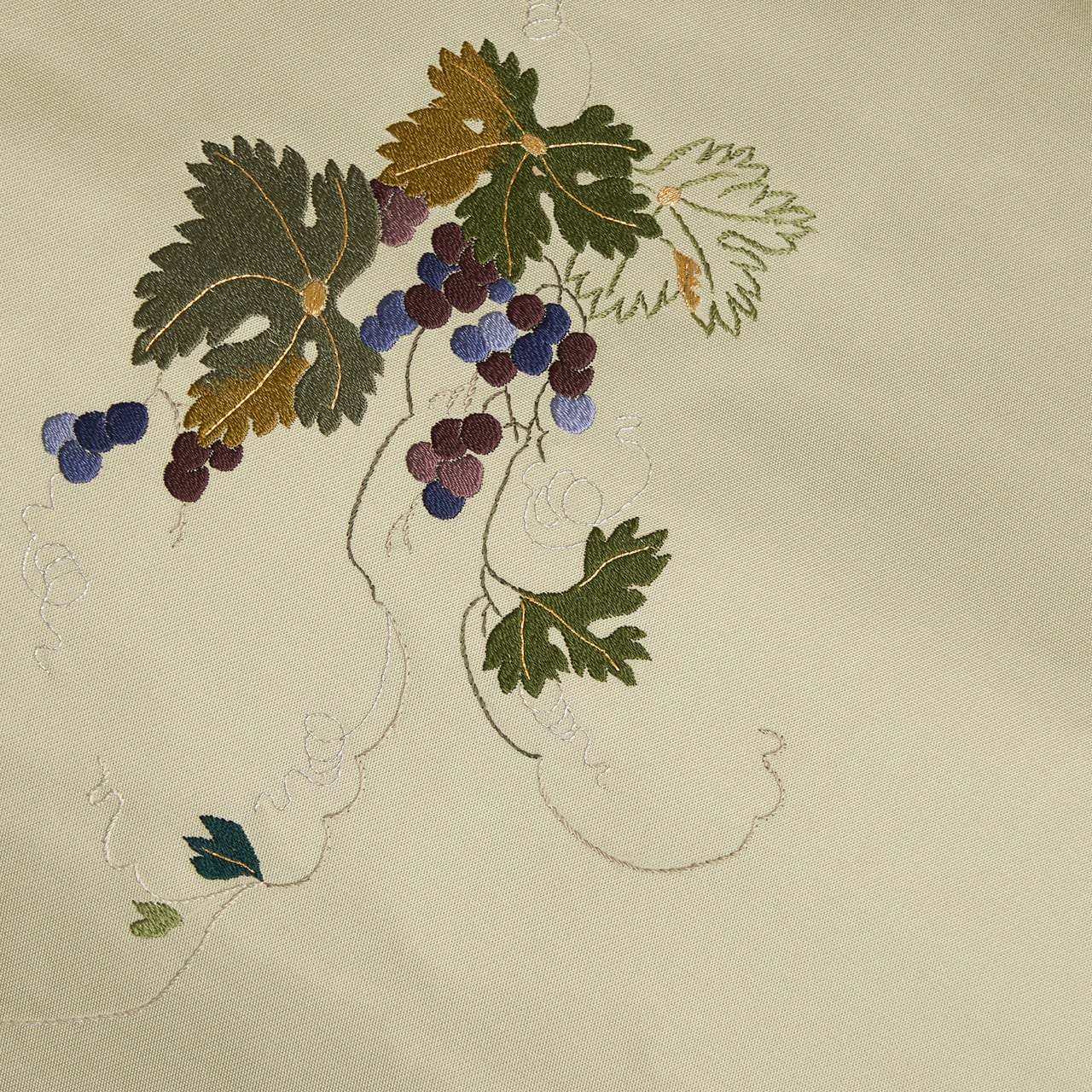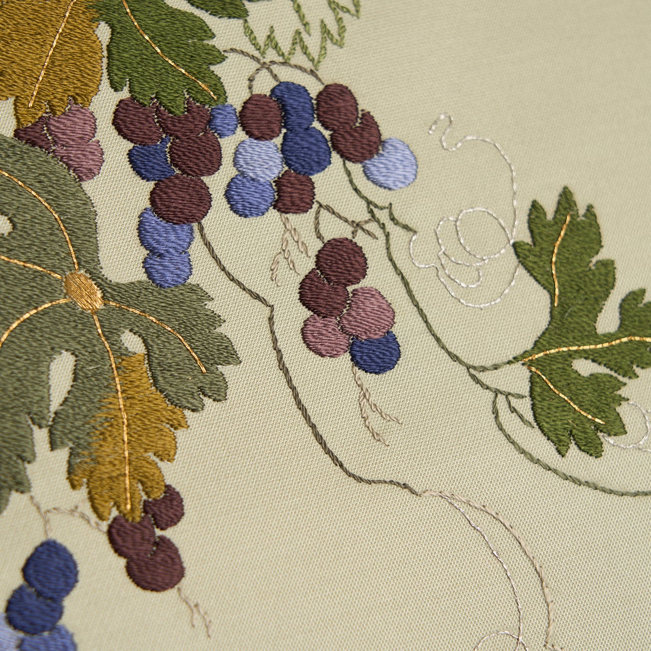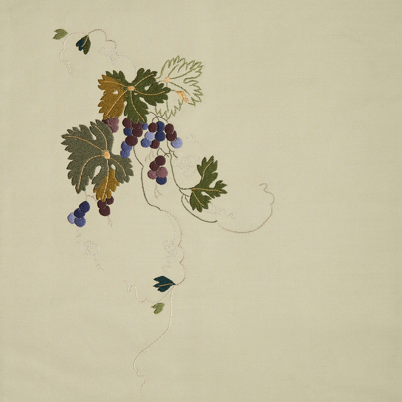 描かれているのは山葡萄だと思われますが、葡萄の実は紫系の何色もの糸で刺繍されていて、山の中でひっそりと艶やかな実をつけている様子が伝わってくるようです。