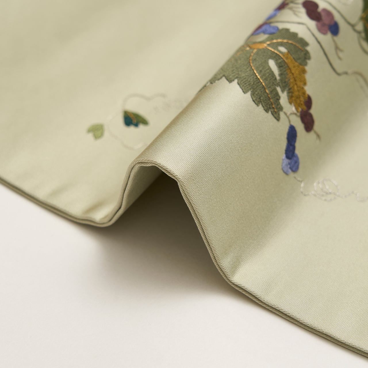 グレー味のある薄緑・柳鼠色の少し光沢のあるさらりとした質感の生地に、お太鼓には左寄りに可愛らしい実をつけた葡萄の蔓が手刺繍で表された、素敵な九寸名古屋帯です。