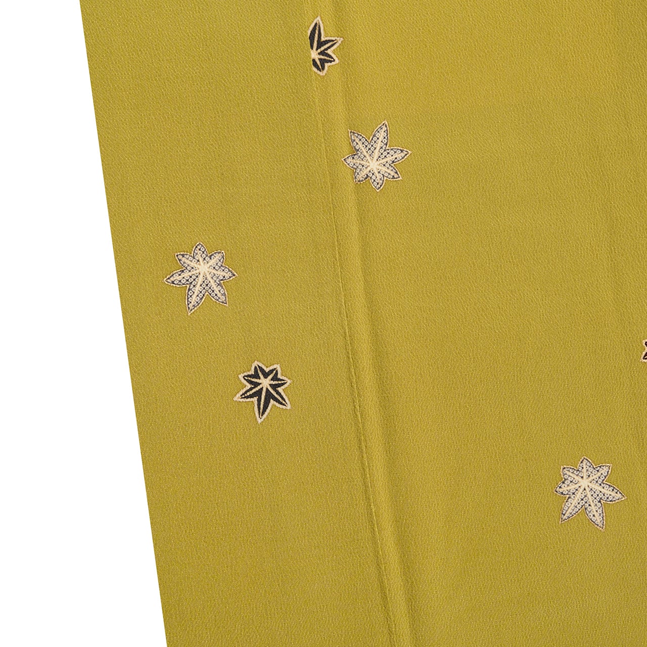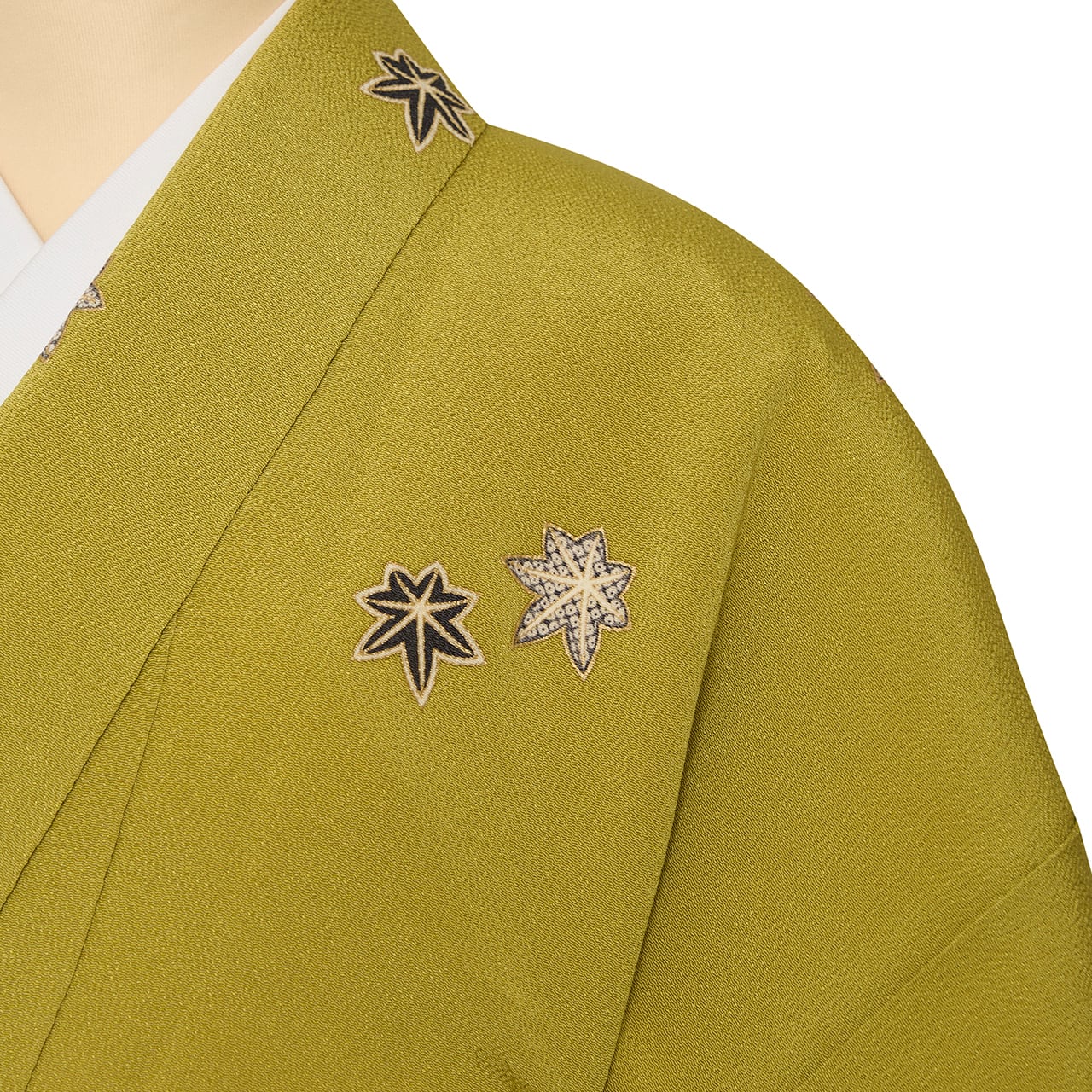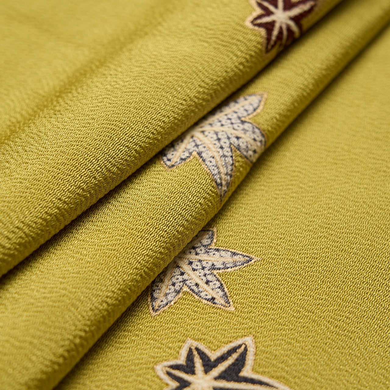 シボのある重めのちりめんの生地が黄色味の感じられる緑・青朽葉色に染められ、はらはらと舞うような紅葉の葉が、葡萄色の濃い紫や青褐色の濃い藍で染められたり、細かな疋田模様で描かれたりして飛び飛びに散らされた、秋の情緒が感じられる素敵な小紋のお着物です。
