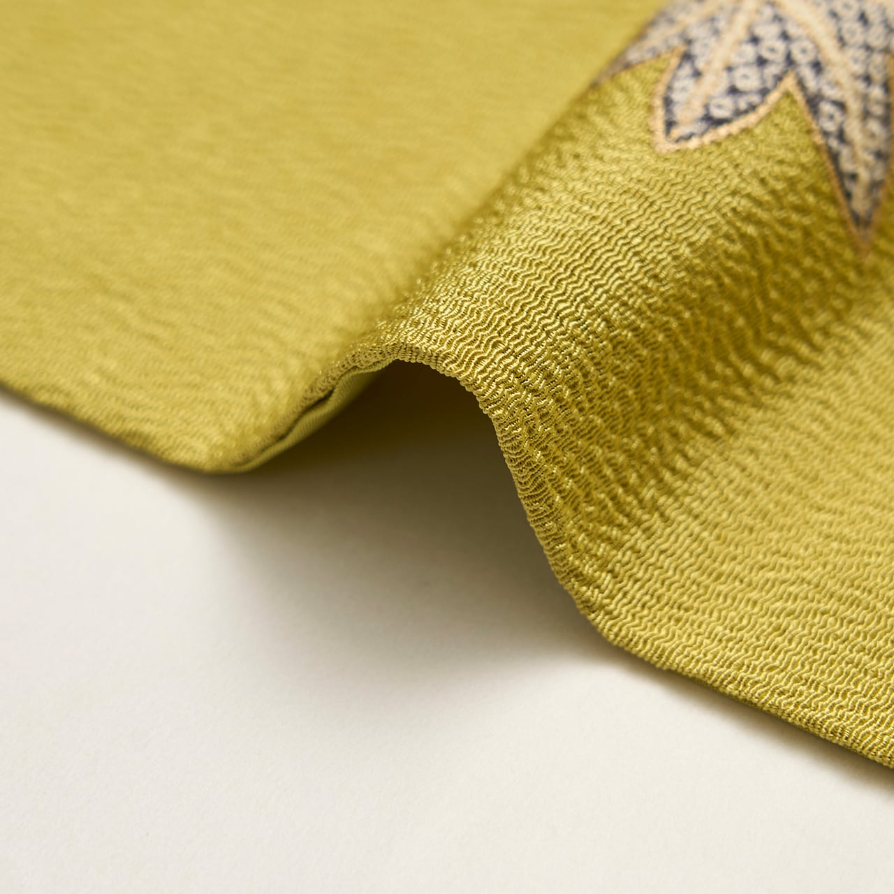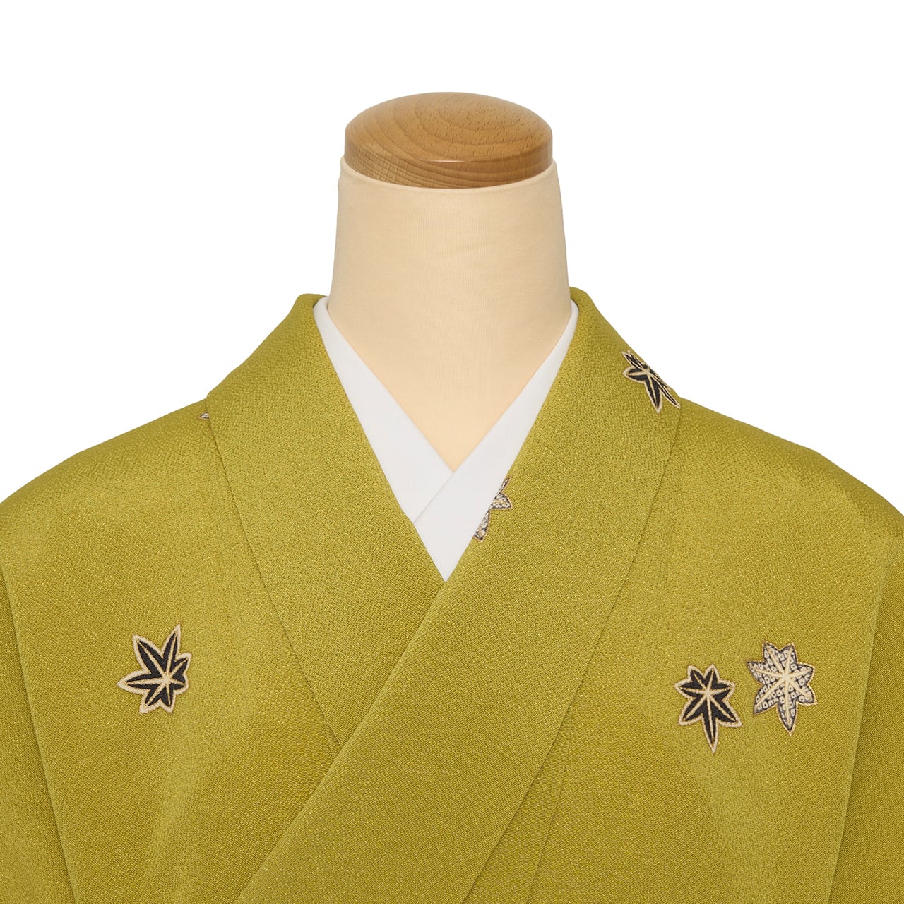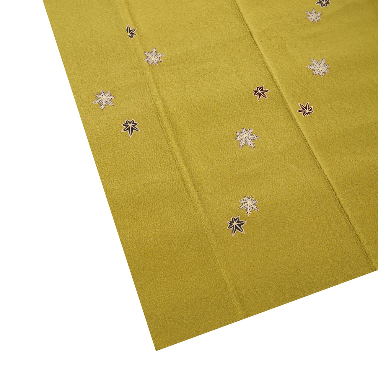シボのある重めのちりめんの生地が黄色味の感じられる緑・青朽葉色に染められ、はらはらと舞うような紅葉の葉が、葡萄色の濃い紫や青褐色の濃い藍で染められたり、細かな疋田模様で描かれたりして飛び飛びに散らされた、秋の情緒が感じられる素敵な小紋のお着物です。