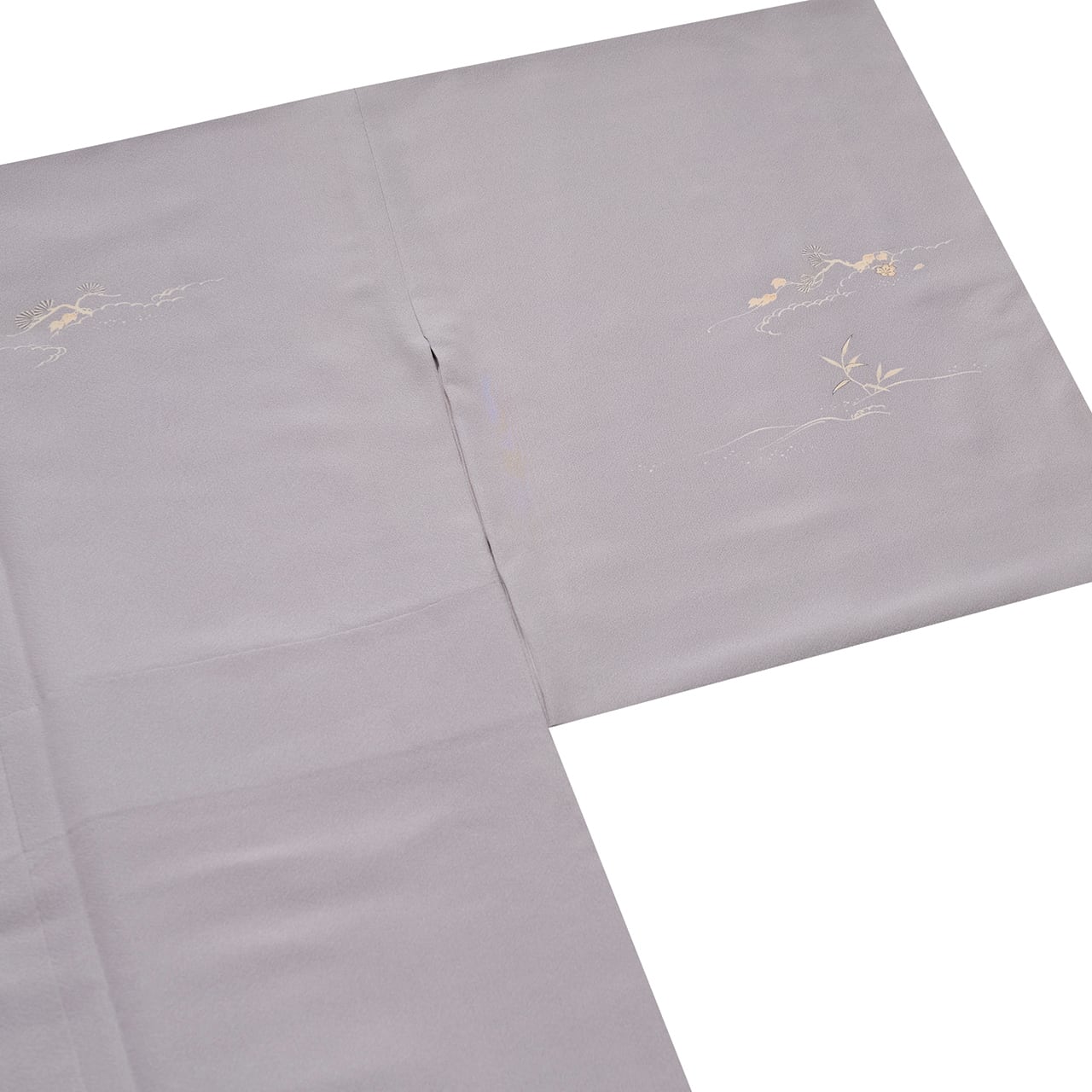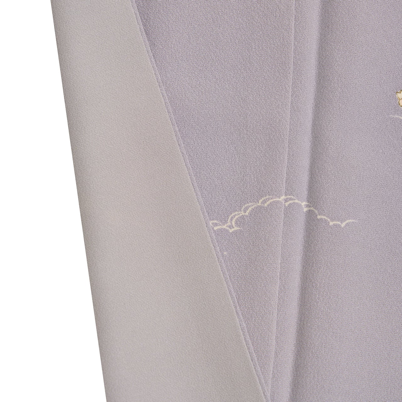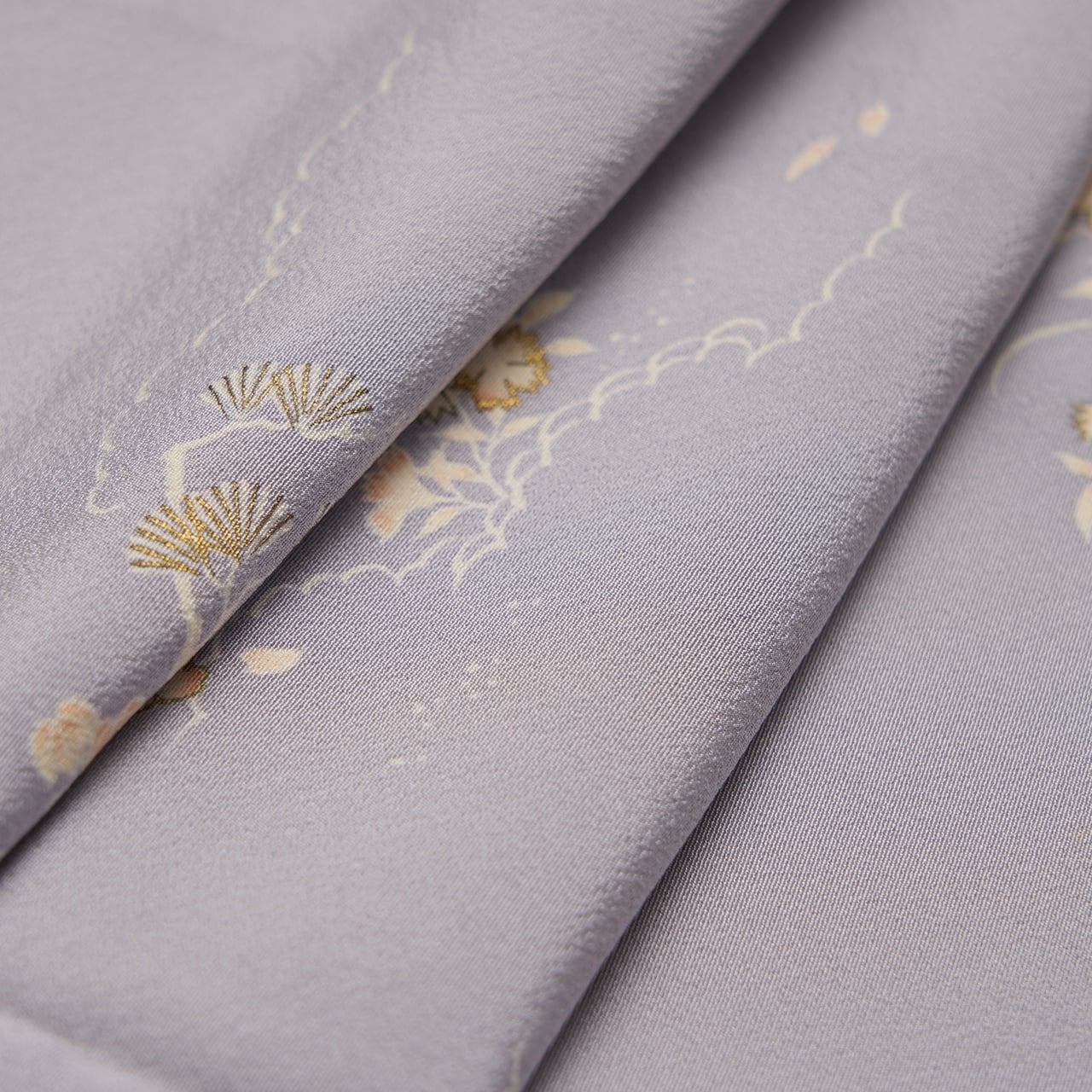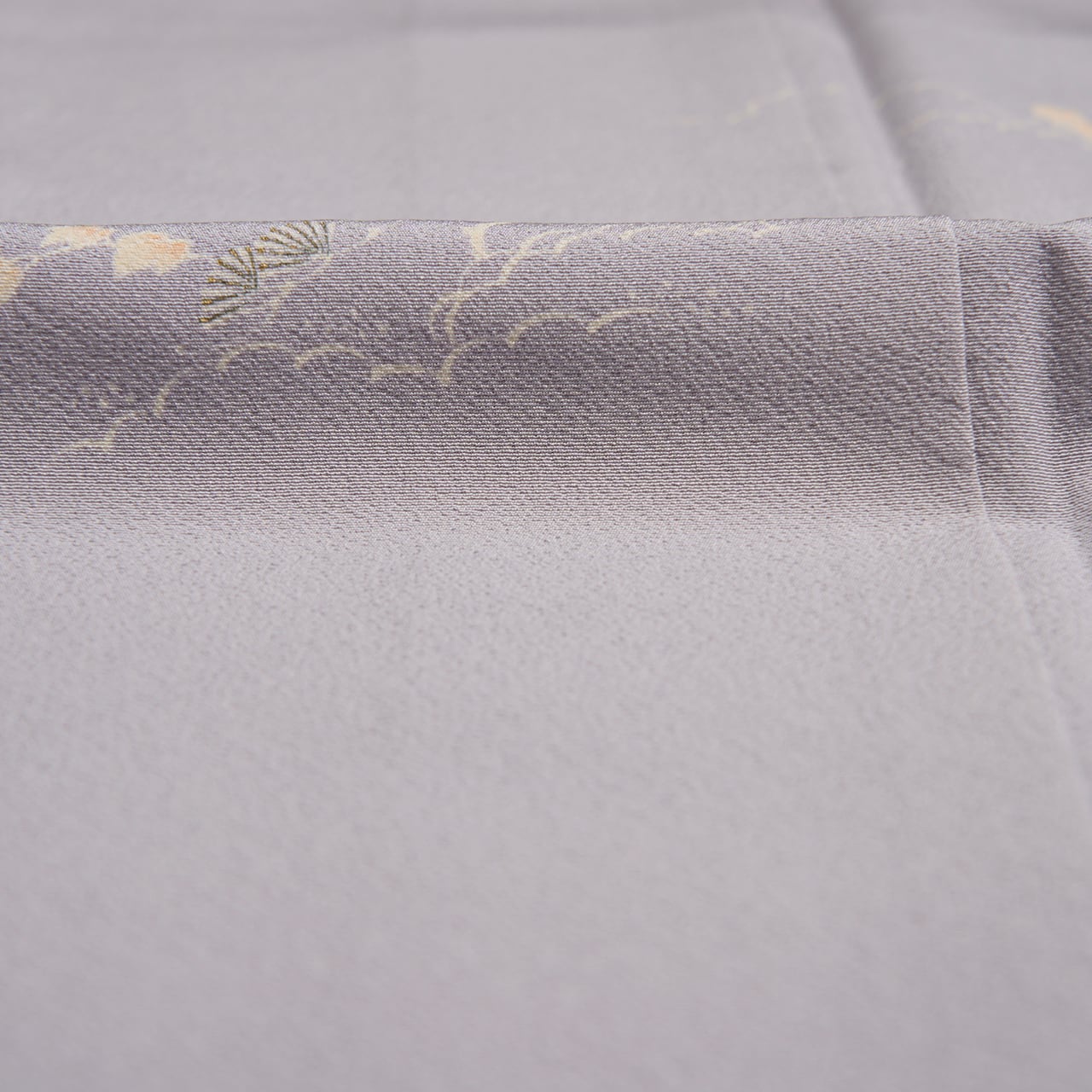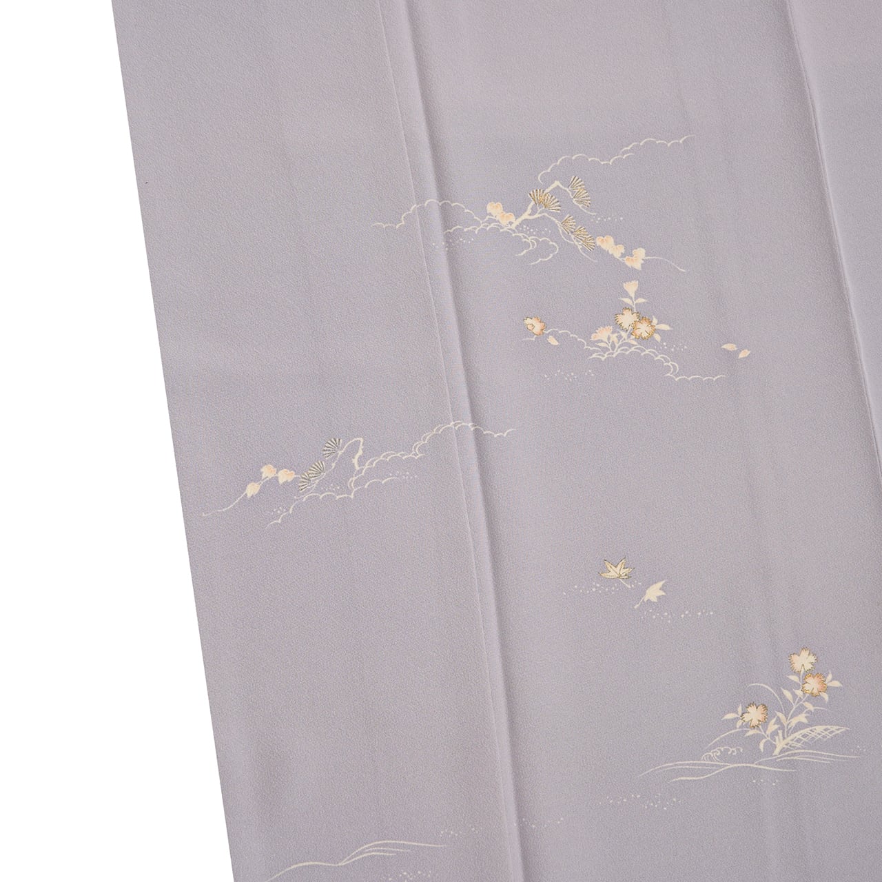 しっとりとした一越ちりめんの生地が、淡く透明感のある薄紫・暁鼠色に染められ、上前や袖などに白揚げの手描き友禅の技法で、流れる水と川岸に撫子のお花や紅葉、松、蔦などがさらりと描かれ、部分的に淡い一斤染色のピンクなどで色付けされた、気品の感じられる附下のお着物です。