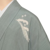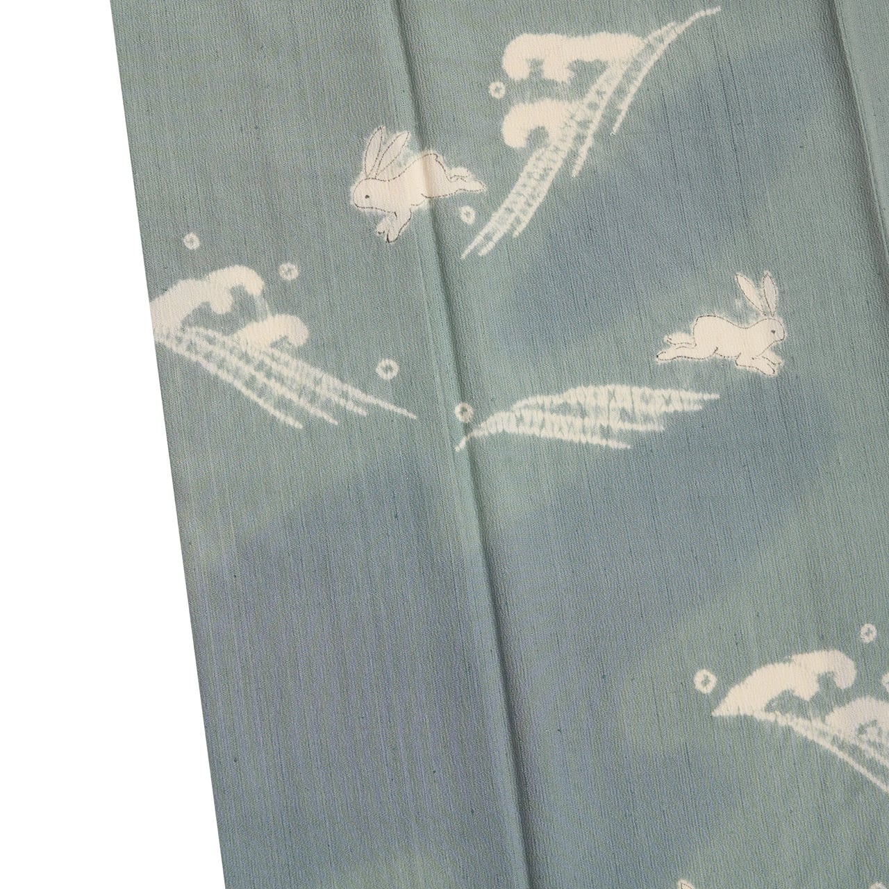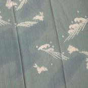 こちらは経糸に飛び飛びにポツポツとしたネップのような節のある、彩雪縮緬という小千谷の紬ちりめんの生地がグレー味のある淡い藍・湊鼠色に染められ、上前などには地色より少し濃い藍味のある色・藍鉄色で、波のような霞のような形の暈しが染められ、それを背景にして勢いのある波頭と元気よく跳ねるうさぎの姿が絞り染めで染め抜かれた、とても素敵な訪問着のお着物です。