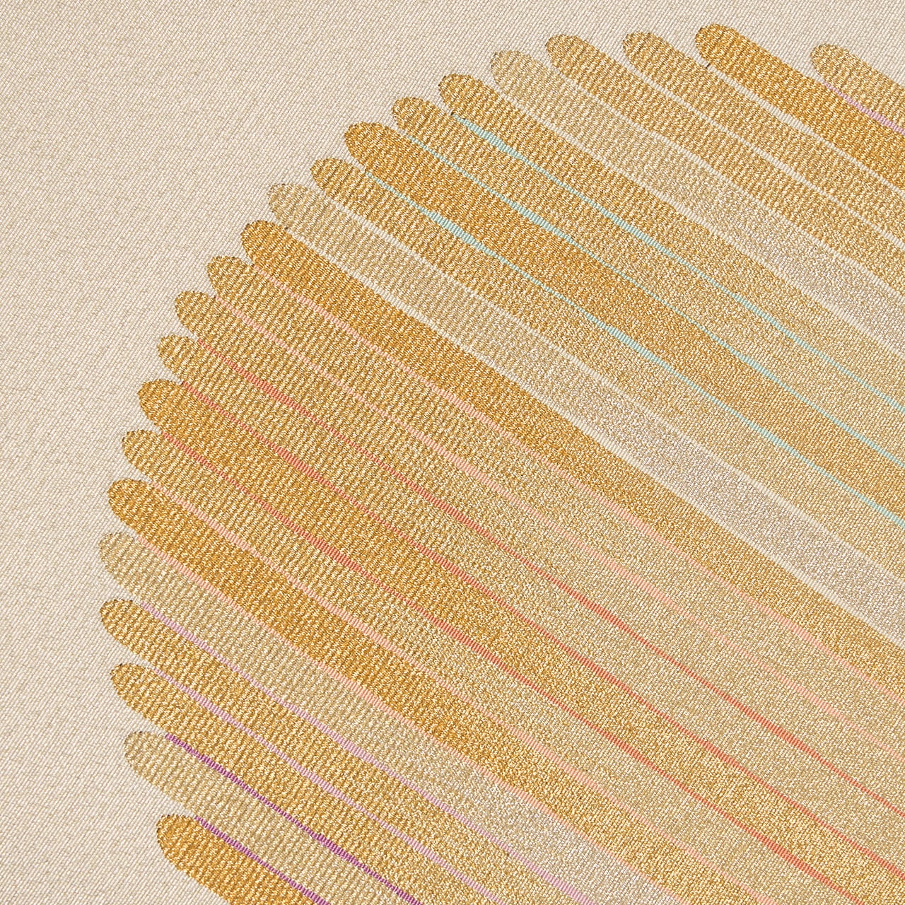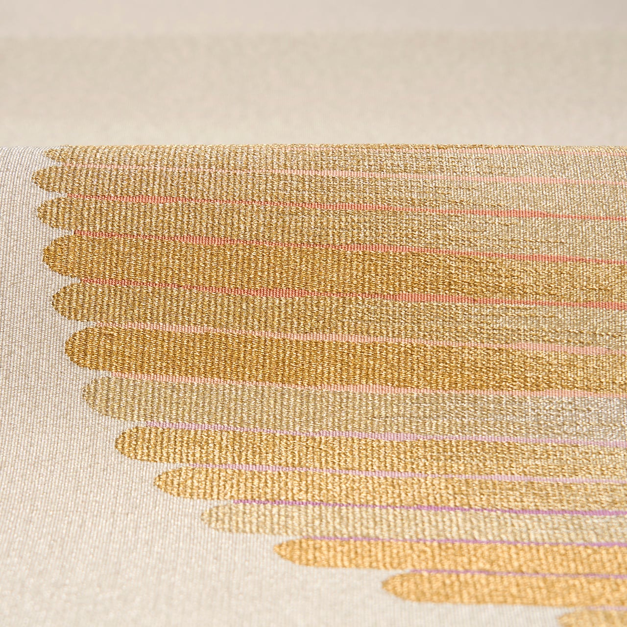 白汚しのような淡いベージュ・灰白色の地金通しの綴れ織の地に、お太鼓には大きな丸の形が、1cmくらいの幅で金糸の色を変えながら横縞で分割されたような模様が、爪掻き綴れ織の技法で織り込まれています。