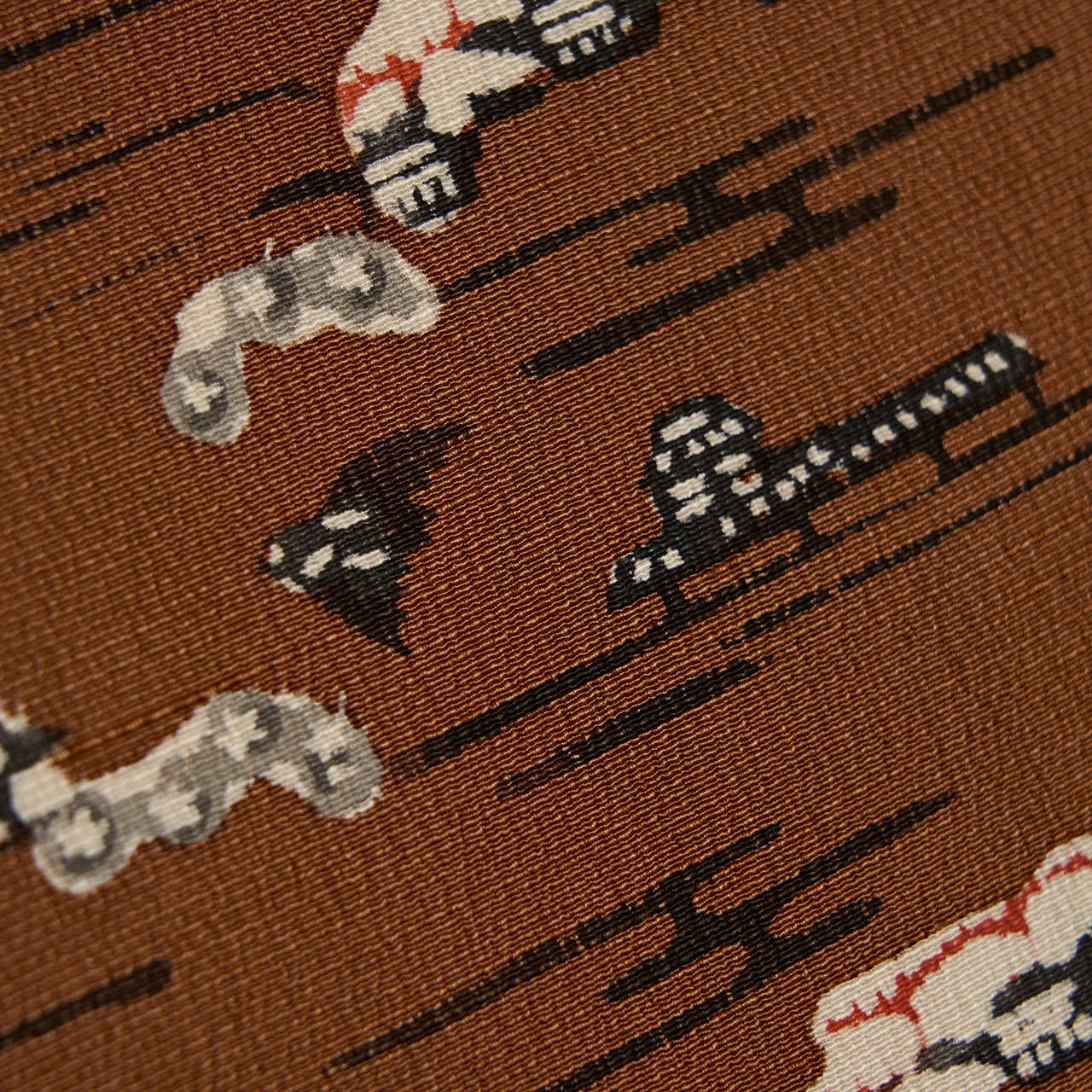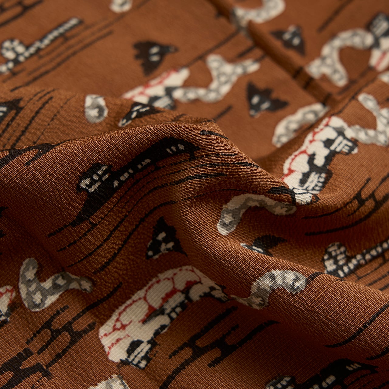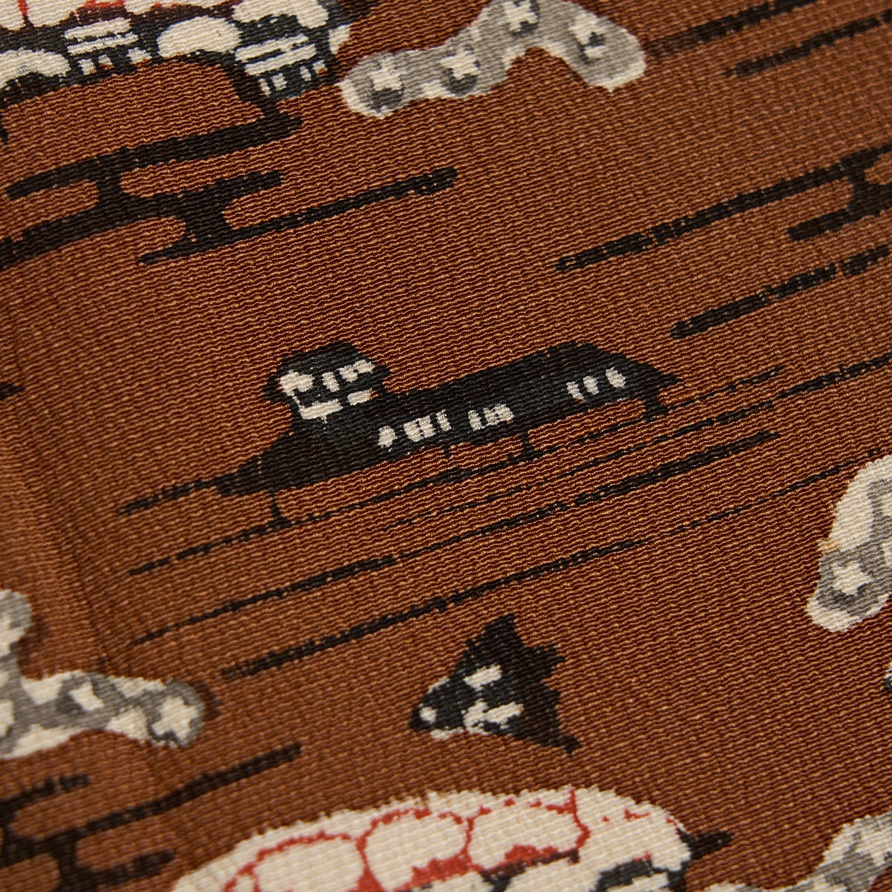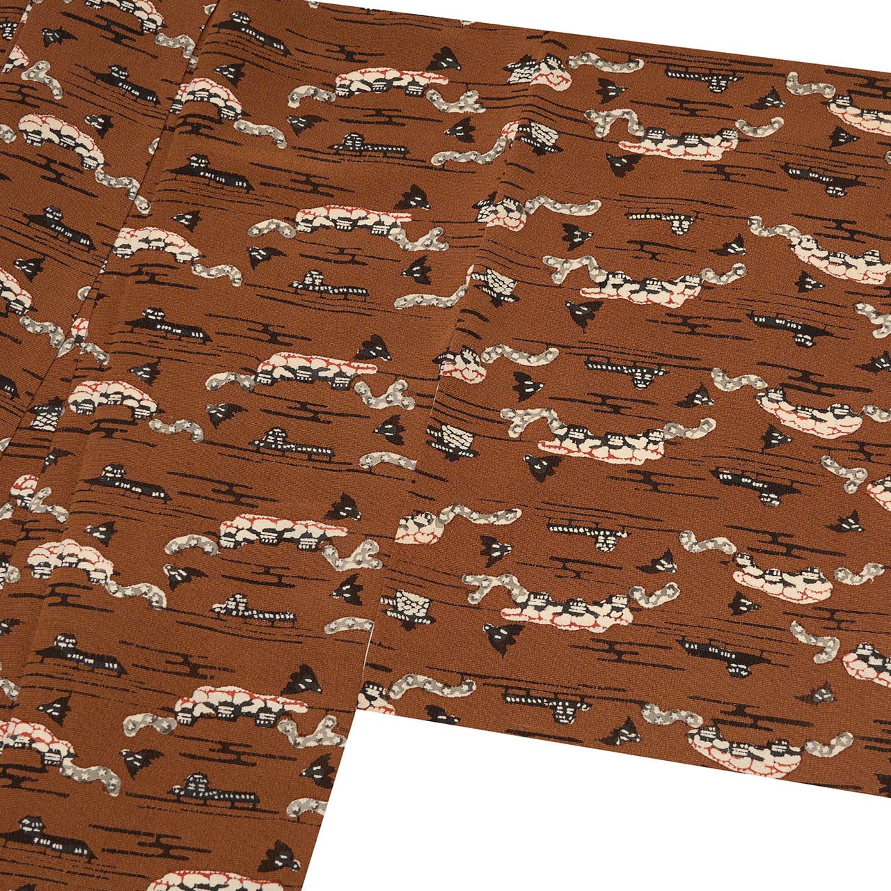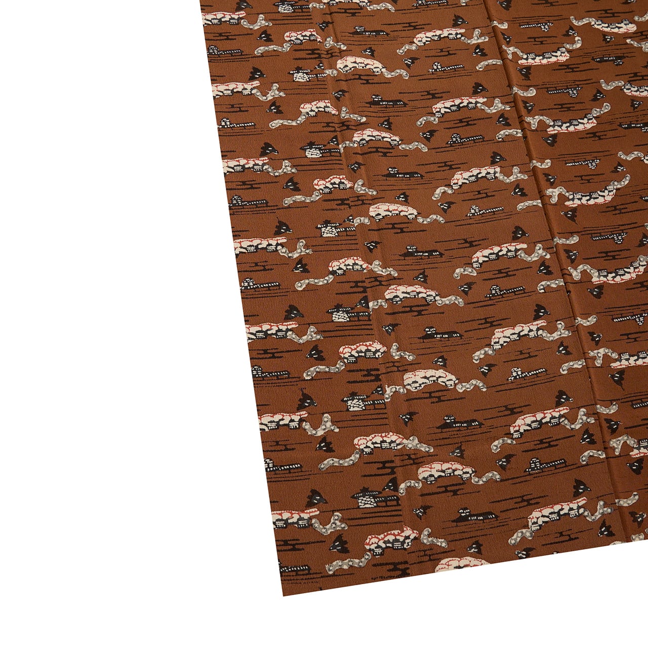 少しシボのある紬ちりめんのような生地がやや明るめの焦げ茶・唐茶色に染められ、全体に松林を背景にした家々などが描かれ、その上をツバメのような鳥が飛んでいる模様が繰り返し染められた、ちょっとお洒落な雰囲気の型絵染の小紋のお着物です。