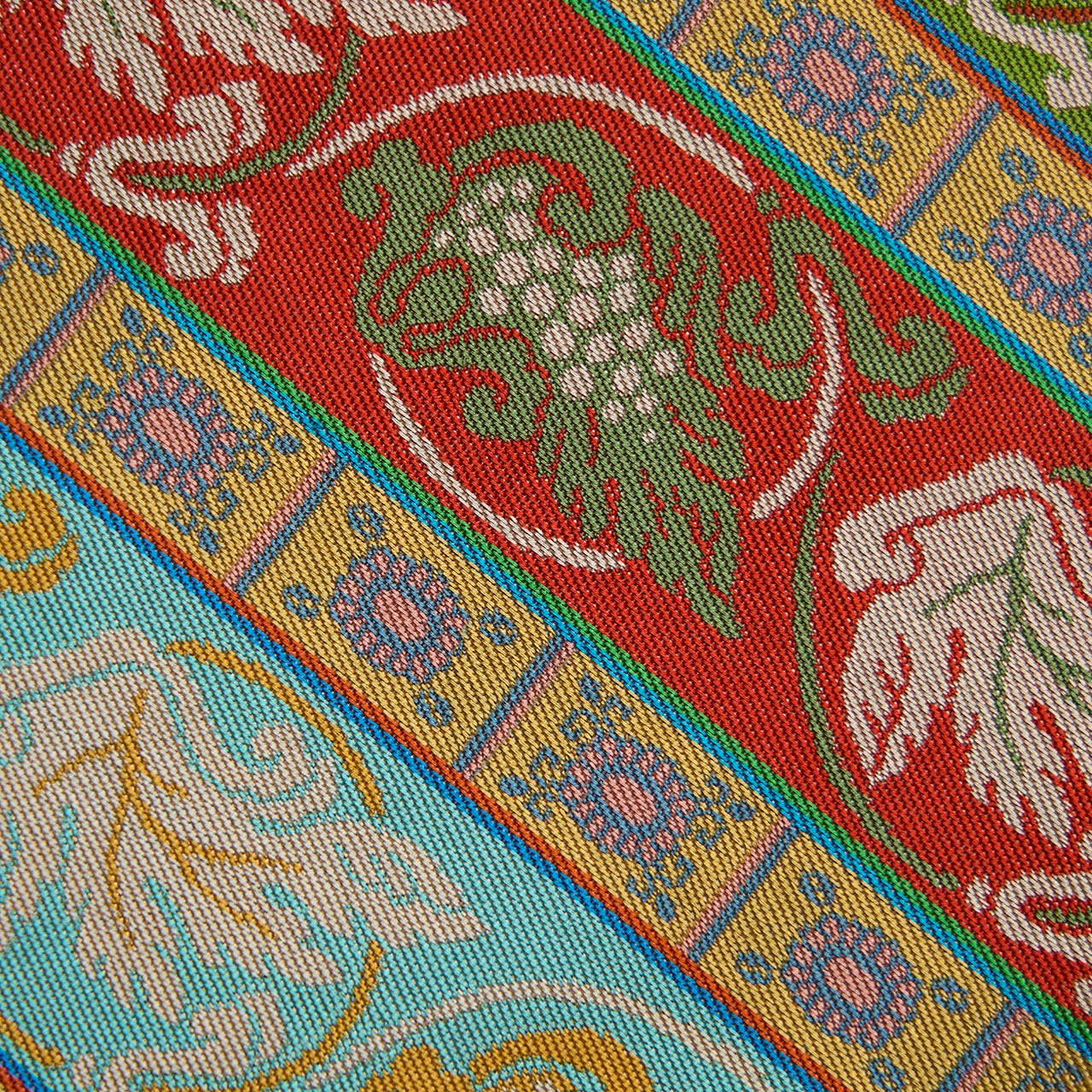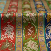 奈良の薬師寺金堂薬師如来像の台座に彫られた文様を、鮮やかな彩りで龍村美術織物さんが、現代の装いに適した意匠として見事な織りで復元されたようです。