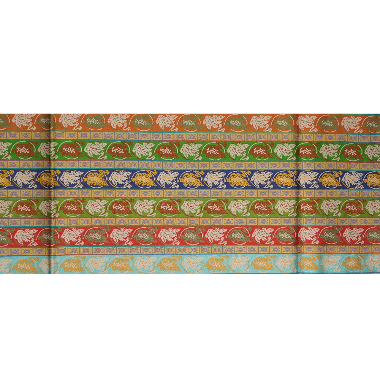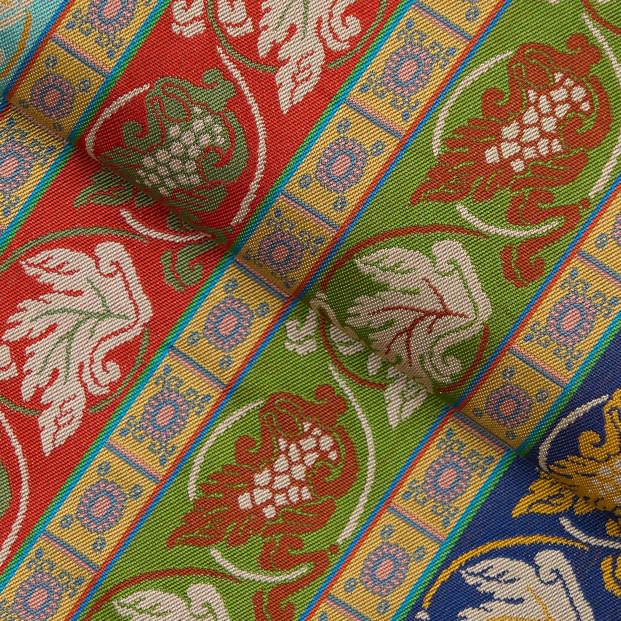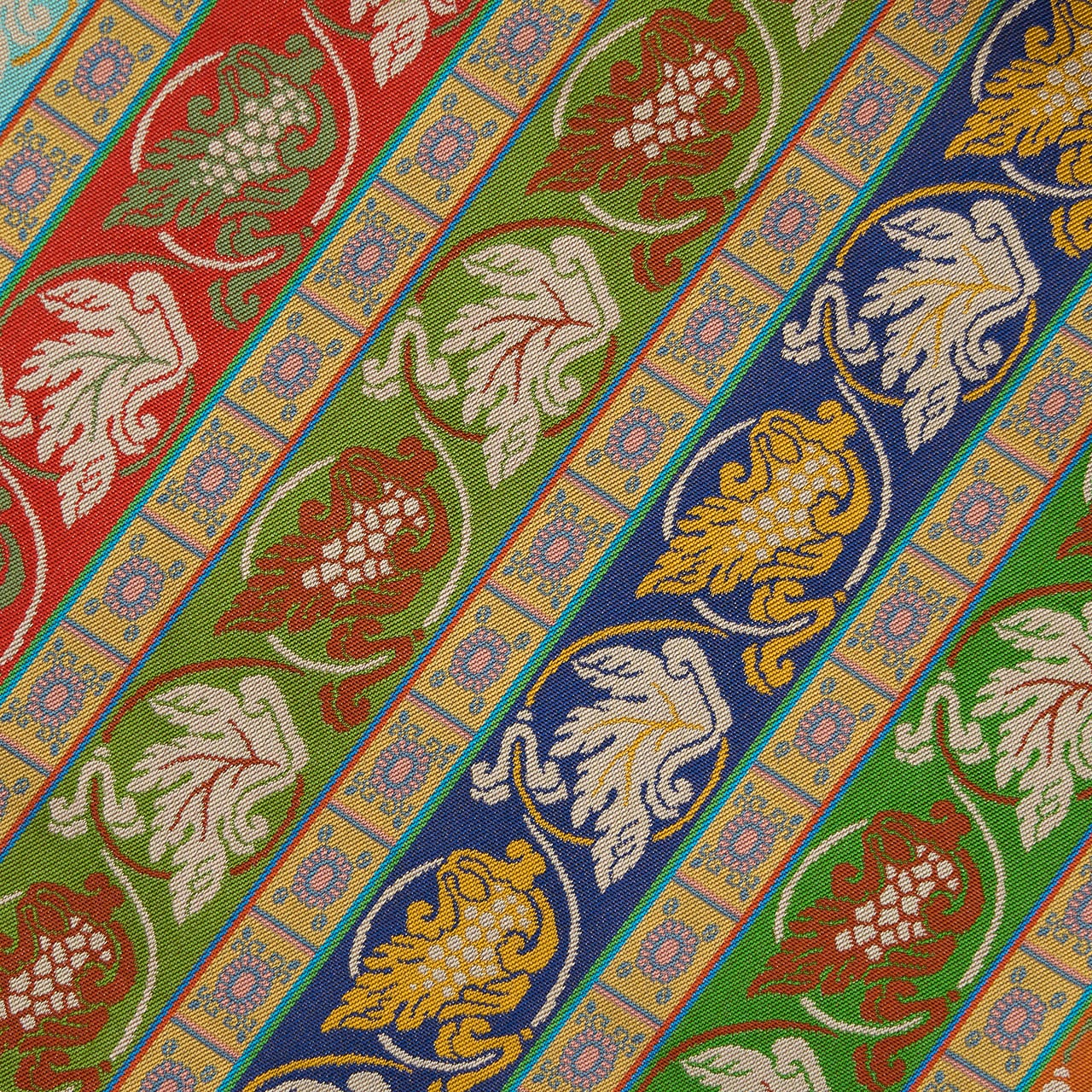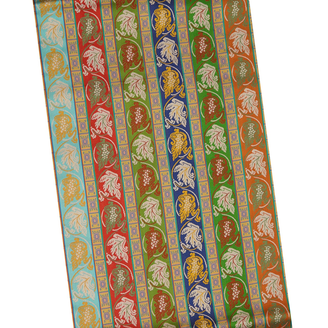 帯の幅が6分割されて、左から浅縹色の水色、紅色の赤、松葉色の淡い緑、藍鉄色、常盤色の緑、黄丹色のオレンジで織り分けられ、葡萄蔓文様が織り出されたものと、細い幅の縞に蓮華文様が細かく織り込まれたものが交互に並んだ、名物裂の格調高さのある素敵な九寸の開名古屋帯です。