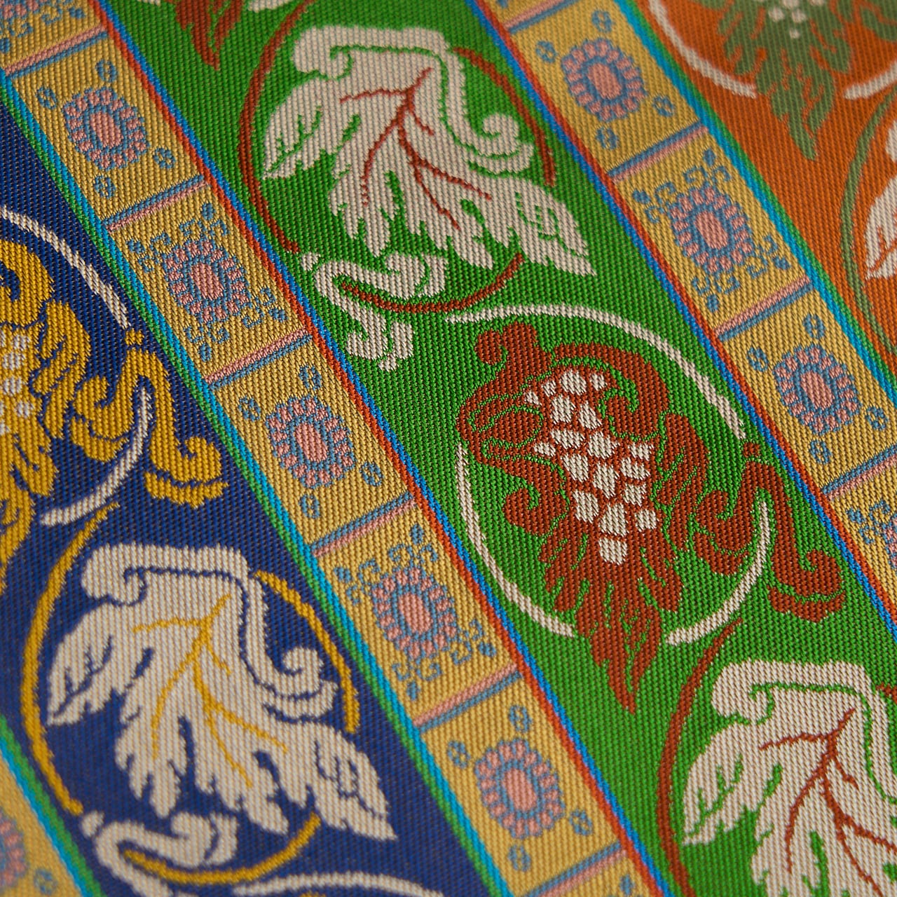 並んだ色の絶妙な調和がとても個性的に輝いていて、名物裂としての品格と、古色然とした葡萄唐草の文様の趣きで、美術織物の名前にふさわしいと思われる、とても素敵な大変おすすめの一点です。