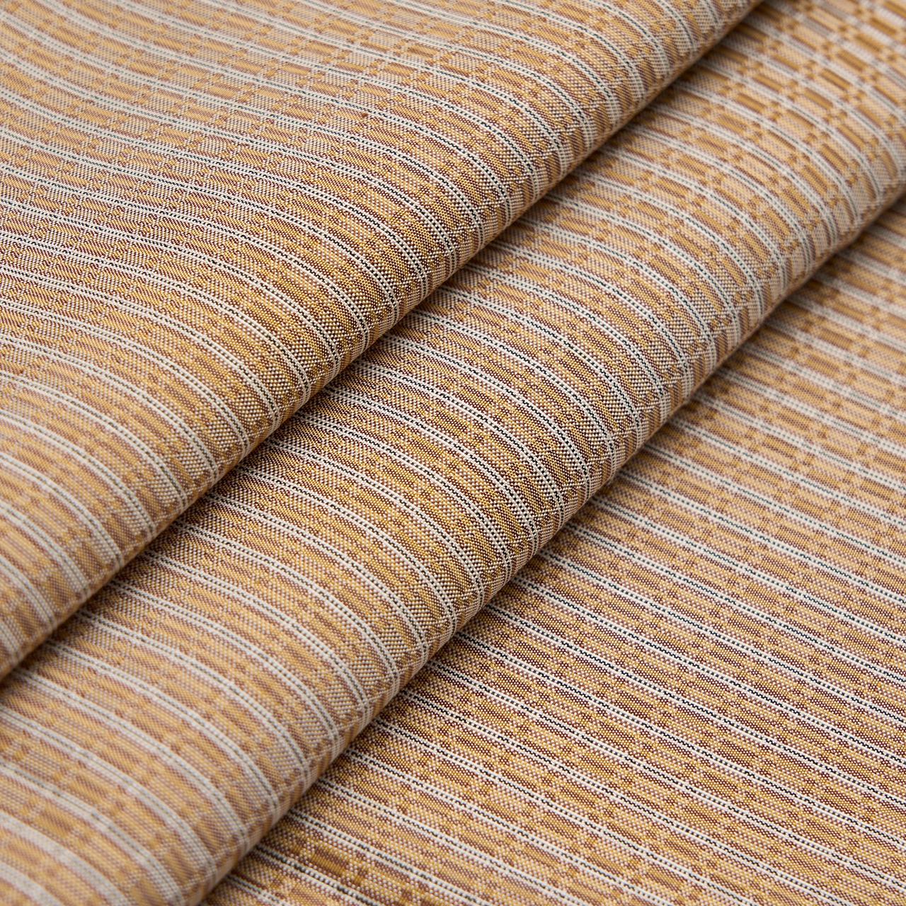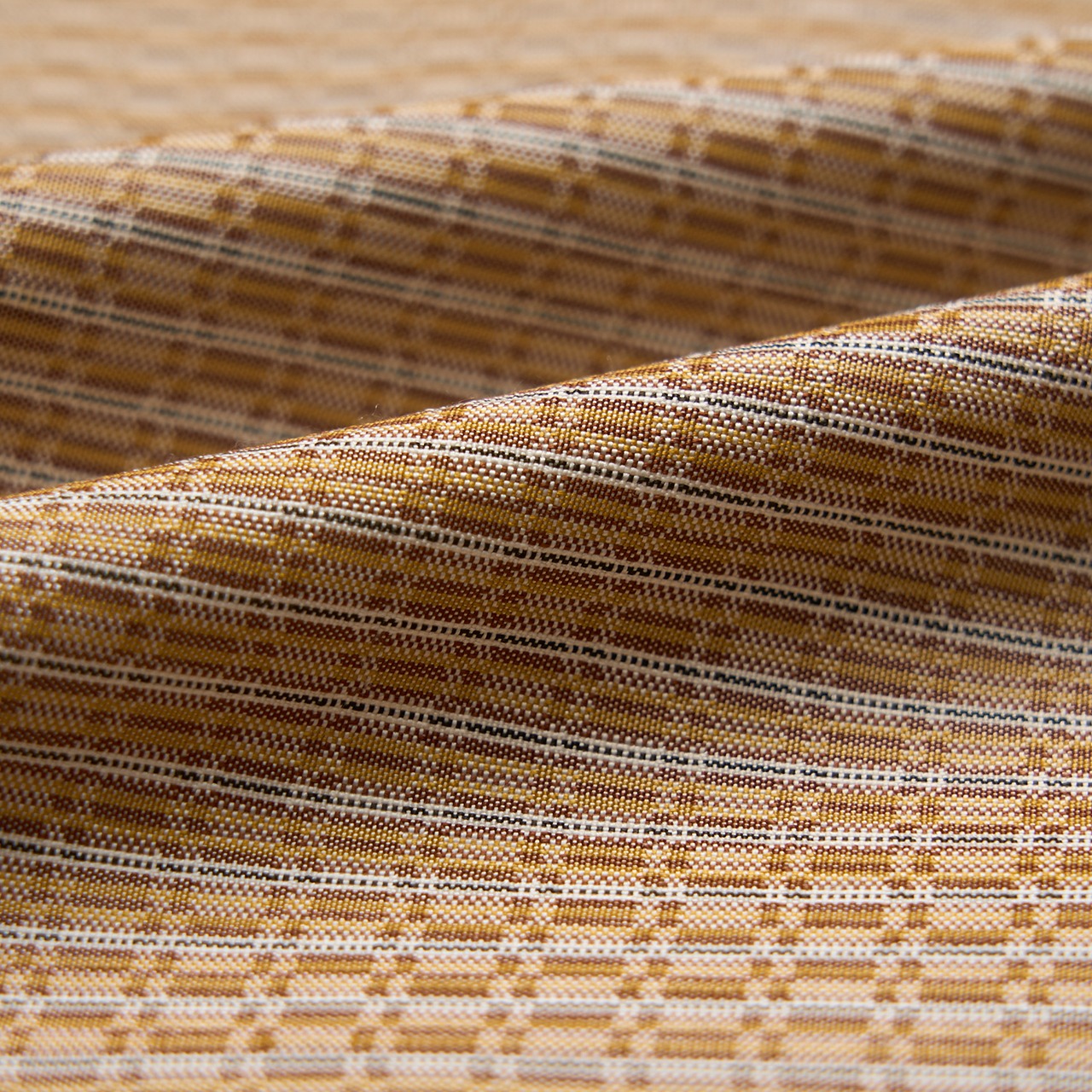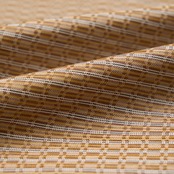 しっとりとした肉厚な質感でありながら、適度な張りとしなやかさも持った黄八丈ならではの手触りの良い生地は、八丈苅安で染められた黄色・飴色とマダミの樹皮で染められた鳶色、そして椎の木の樹皮と泥染めをして染められた黒の糸に、象牙色の糸を巧みに操って、細かな変り市松の模様に織りあげられています。