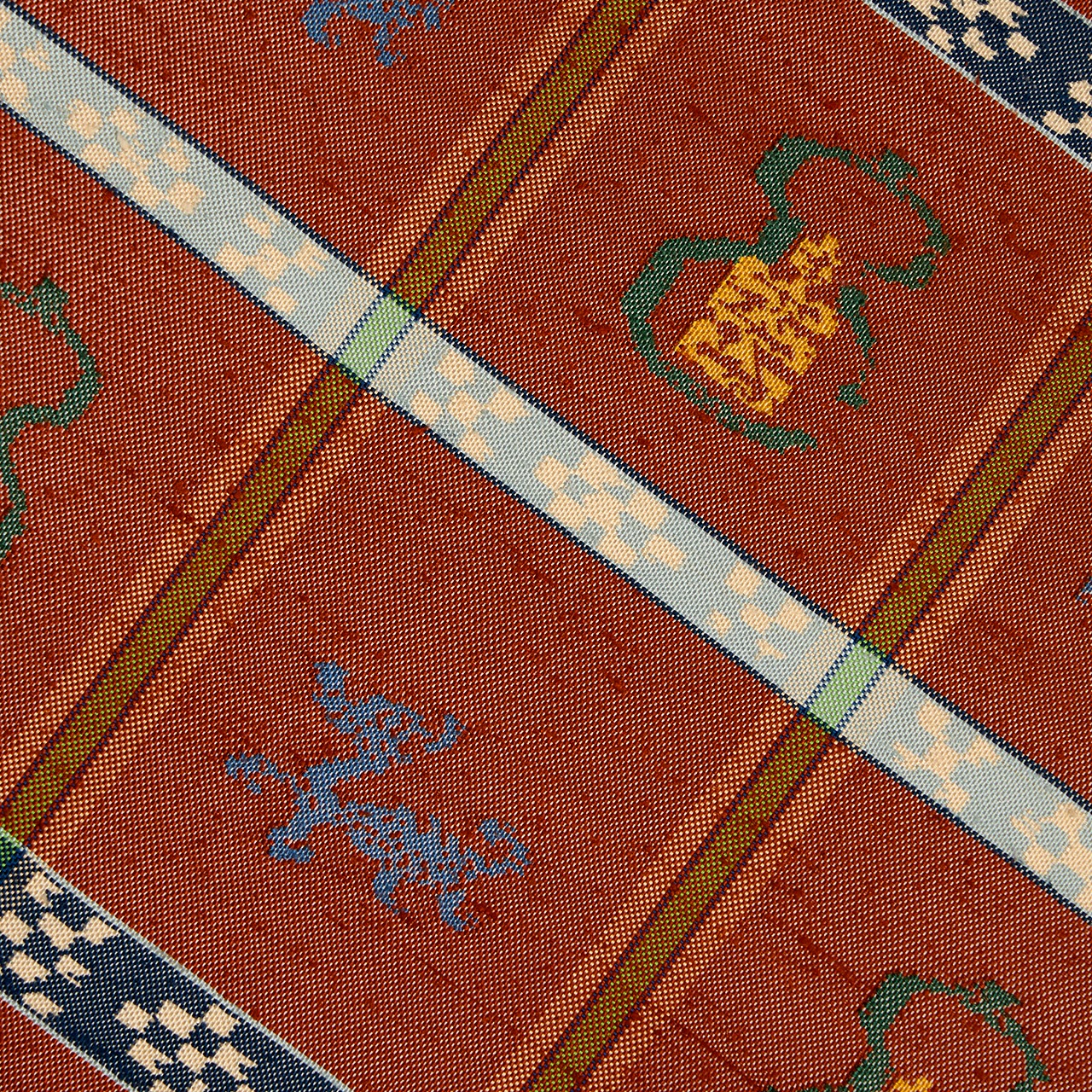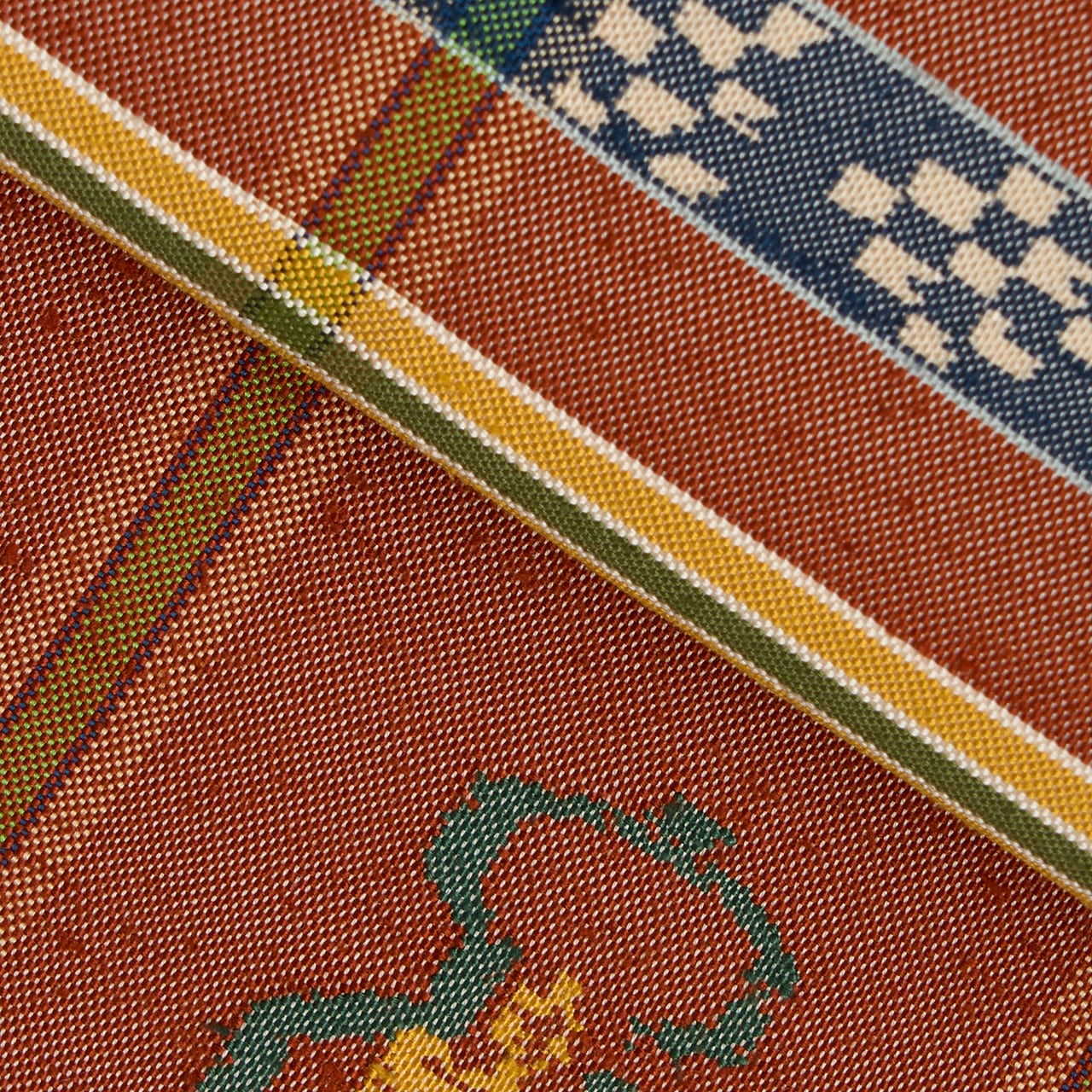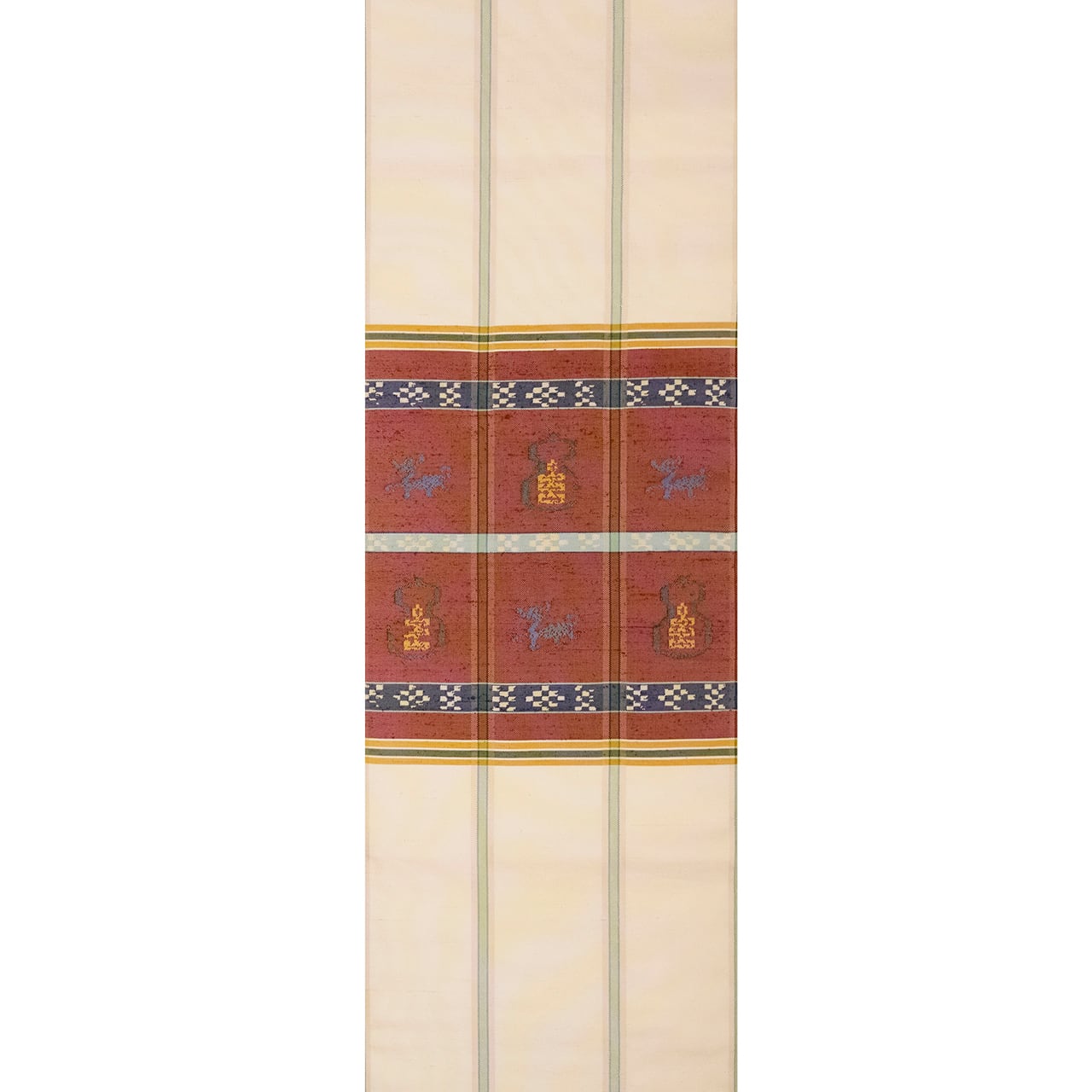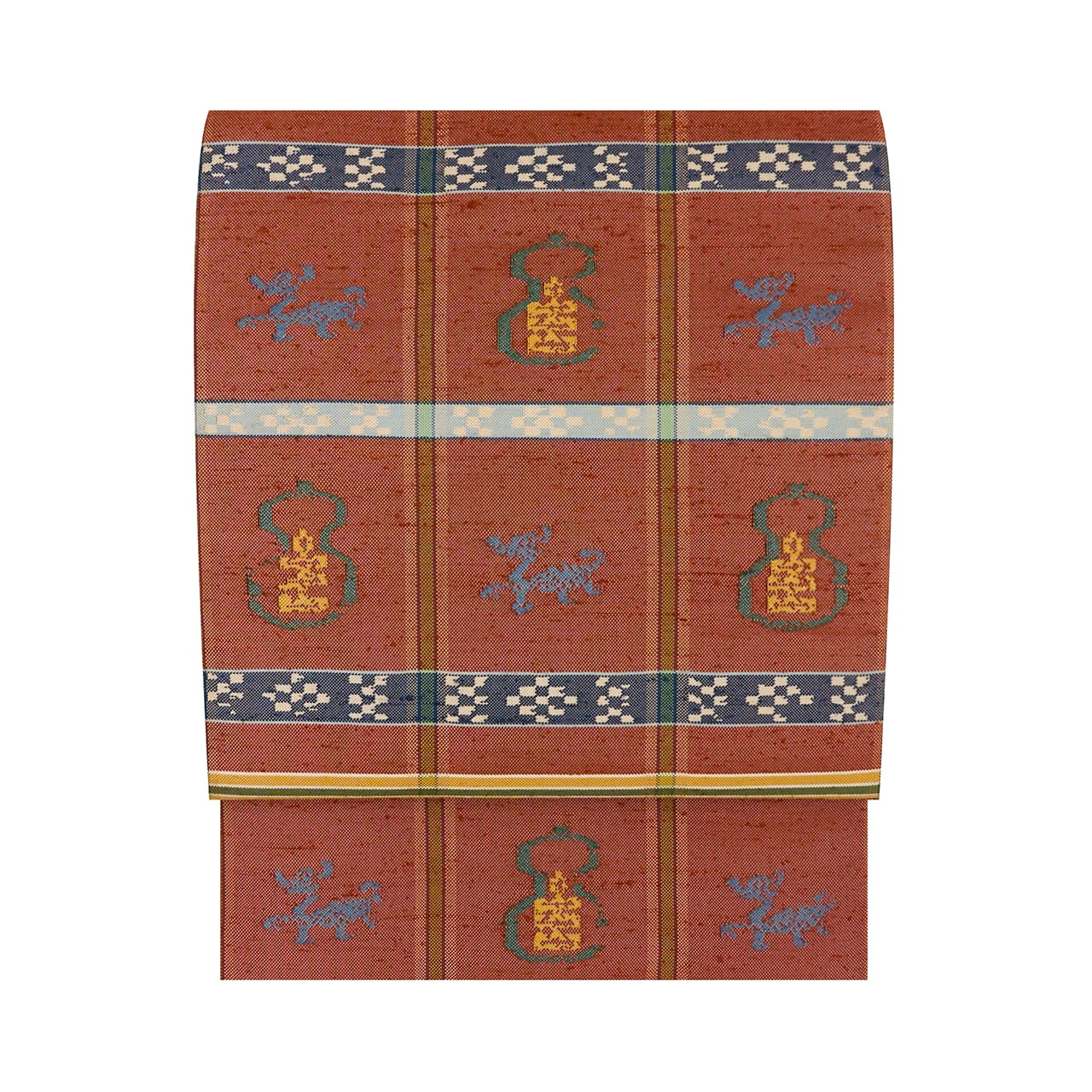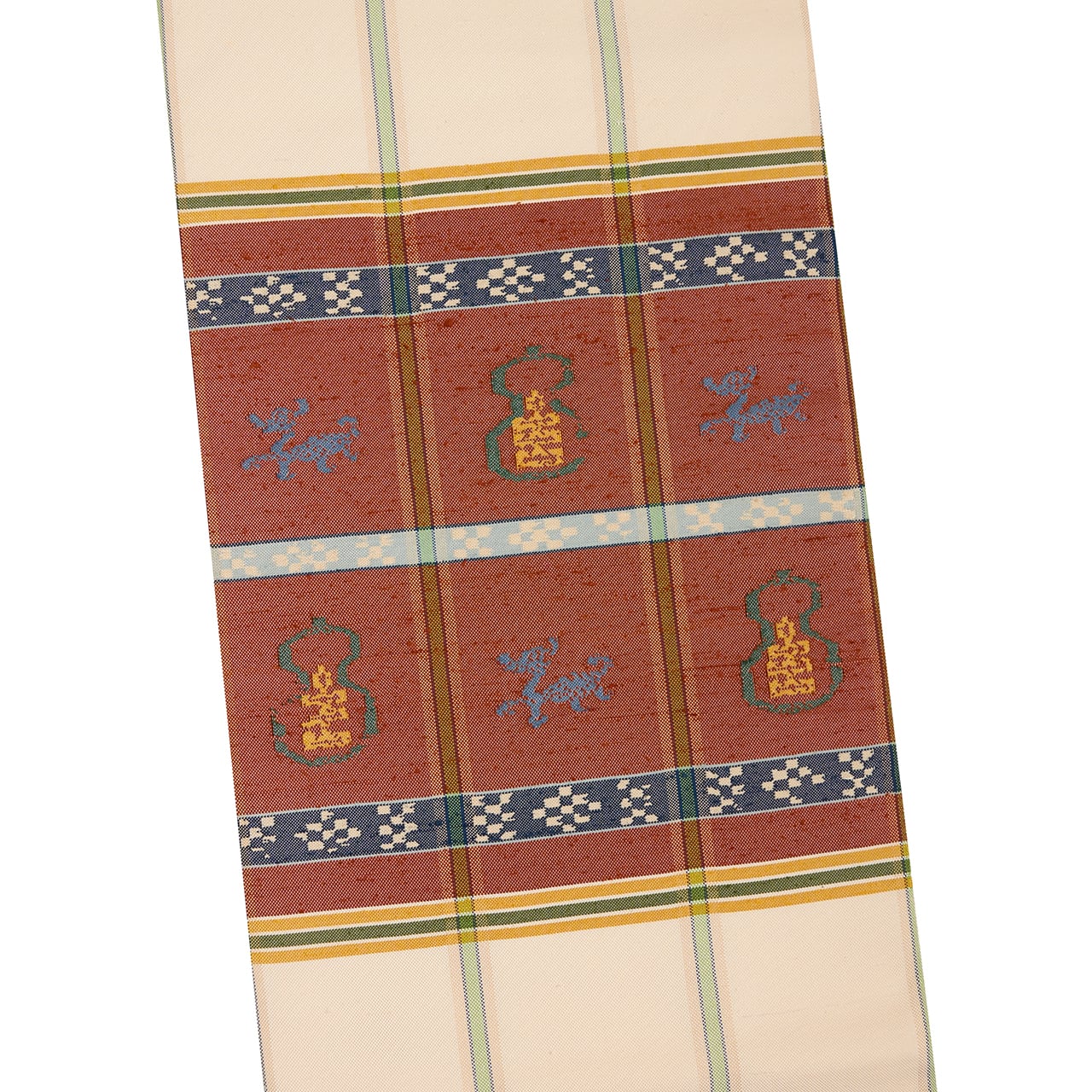 象牙色の紬織の地に、玉虫のように織られた鳶色の段がとられて6分割された中に瓢箪と麒麟の模様が虫襖色や飴色、舛花色の糸で織り込まれ、留紺色と秘色色の絣模様の横段が加えられ、それを挟むように飴色と麹塵色の横縞が置かれて、縦には夏虫色の縞が織り込まれるといった、大変凝った配色の古色然とした雰囲気にモダンさが加味されたような、とてもお洒落な龍村平蔵さんの本袋帯です。