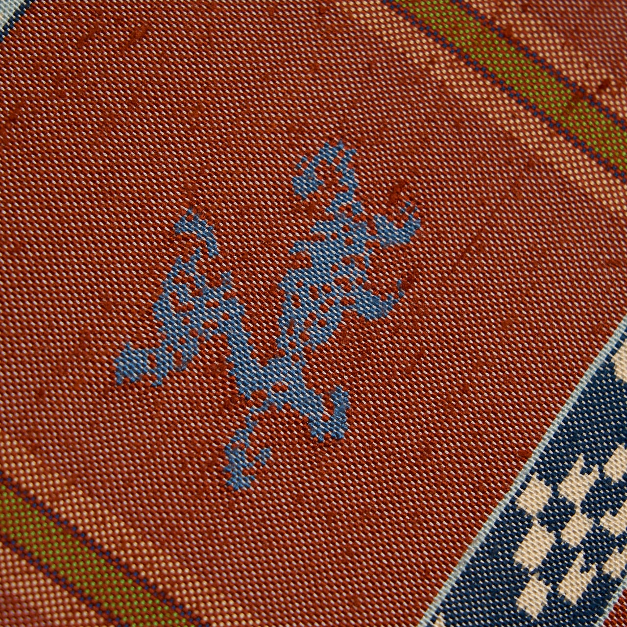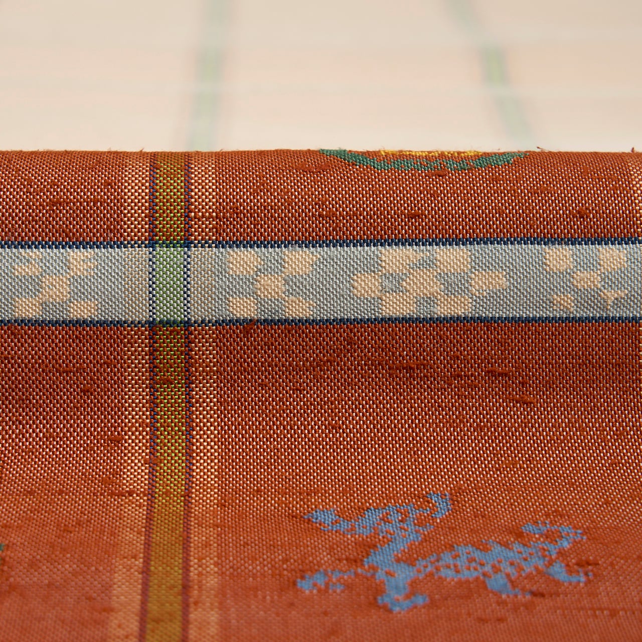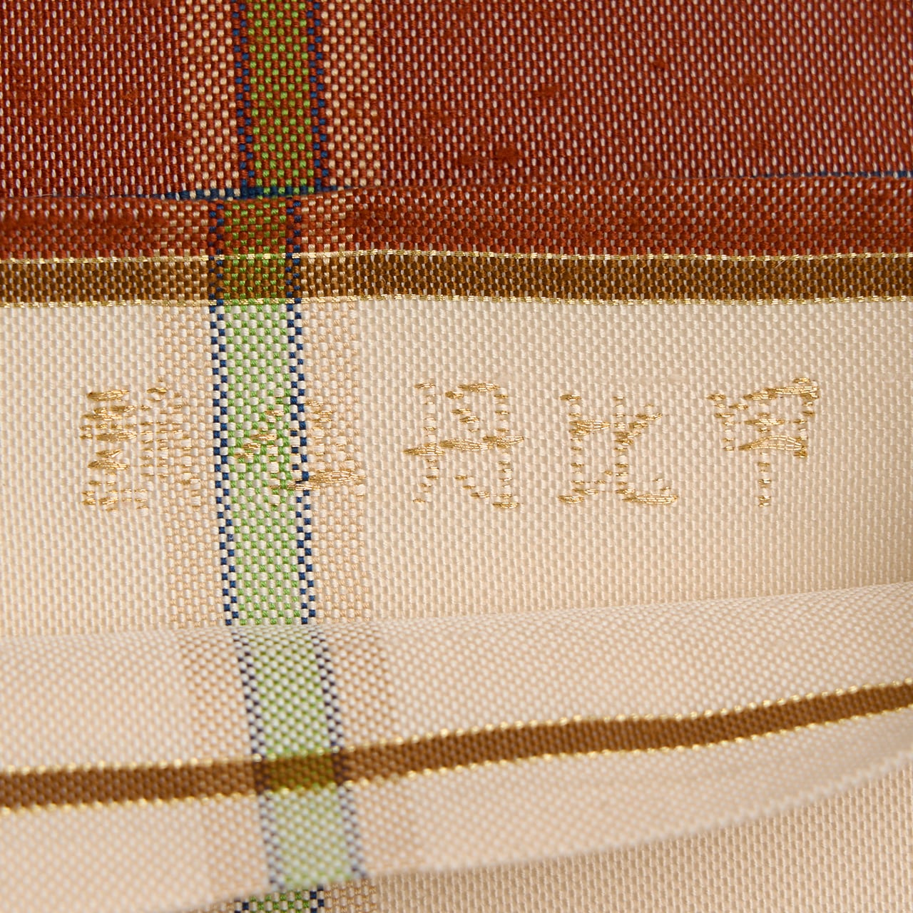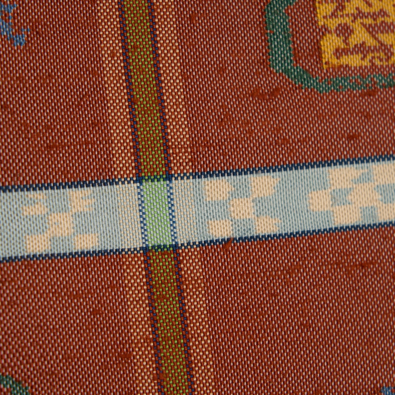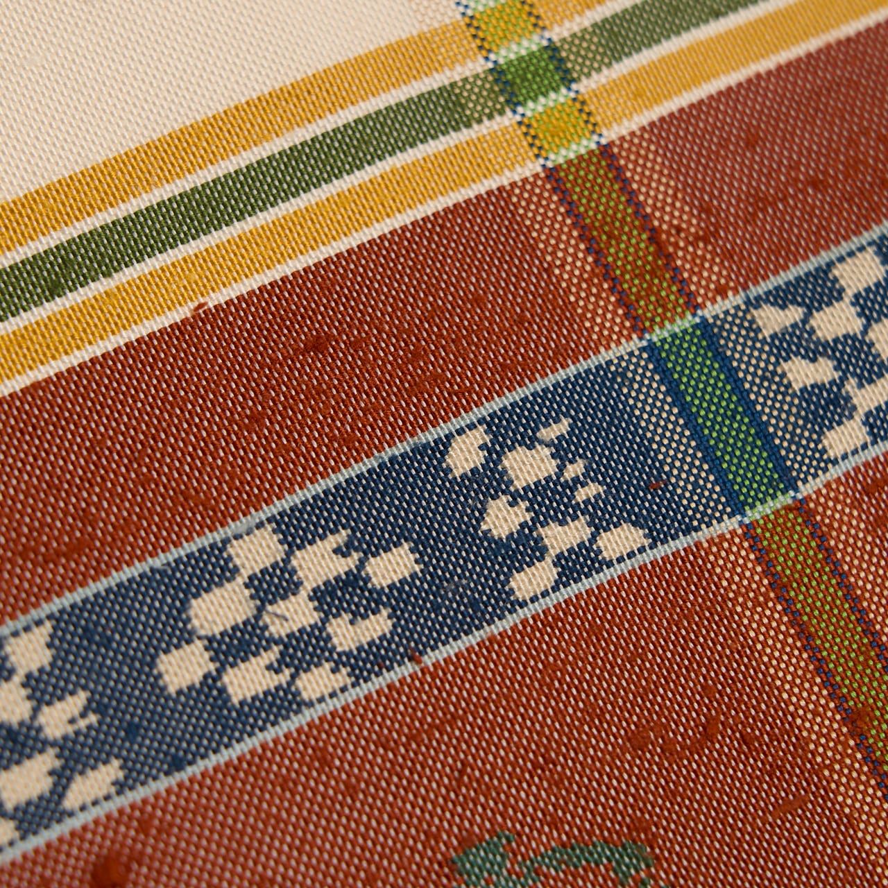 象牙色の紬織の地に、玉虫のように織られた鳶色の段がとられて6分割された中に瓢箪と麒麟の模様が虫襖色や飴色、舛花色の糸で織り込まれ、留紺色と秘色色の絣模様の横段が加えられ、それを挟むように飴色と麹塵色の横縞が置かれて、縦には夏虫色の縞が織り込まれるといった、大変凝った配色の古色然とした雰囲気にモダンさが加味されたような、とてもお洒落な龍村平蔵さんの本袋帯です。