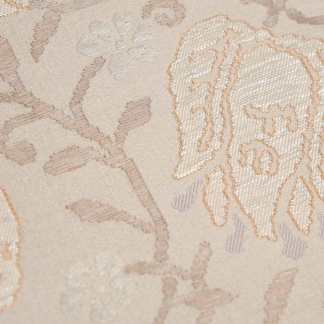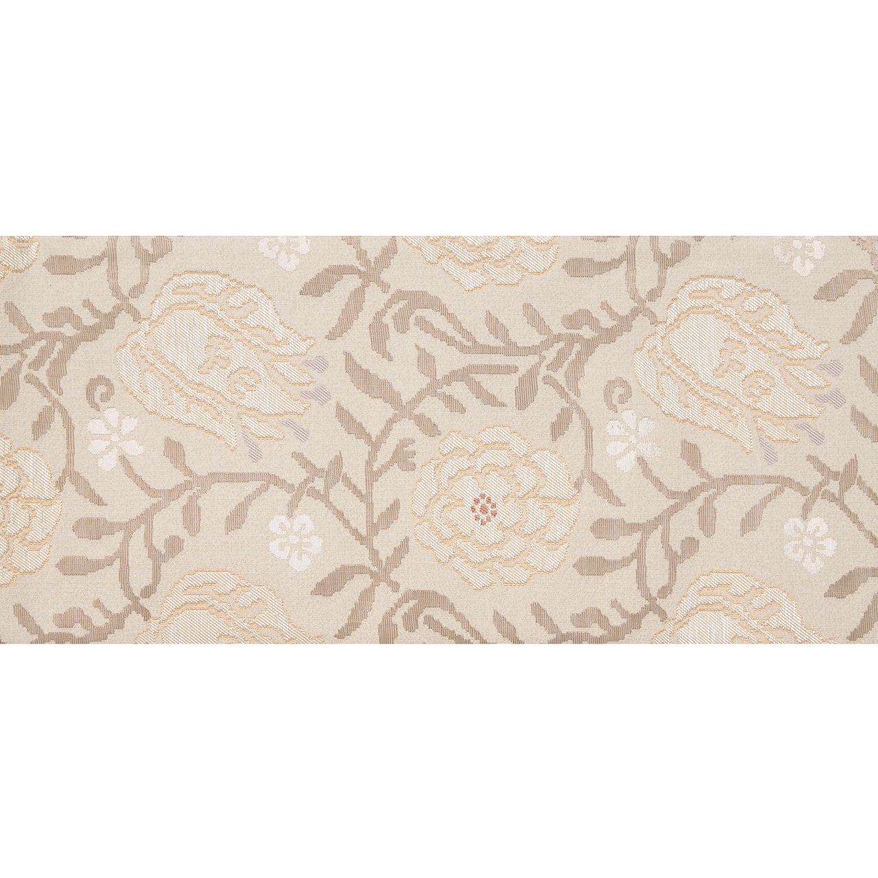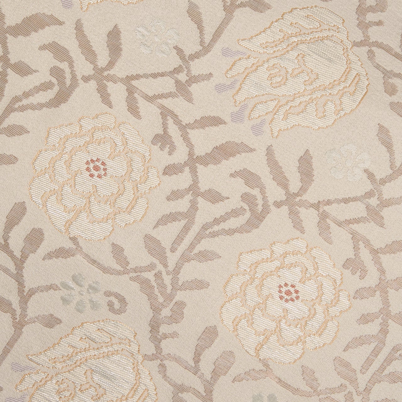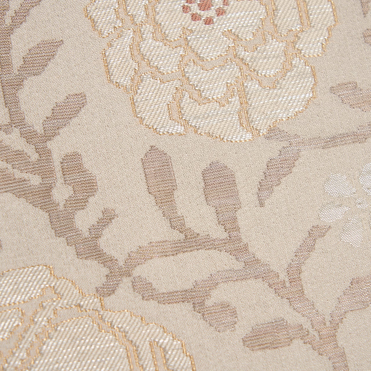 こちらの唐花の模様も、お花の部分は少しふくれたような織りになっていて、銀色の箔の糸も織り込まれたりして、白さが引き立つように工夫されています。