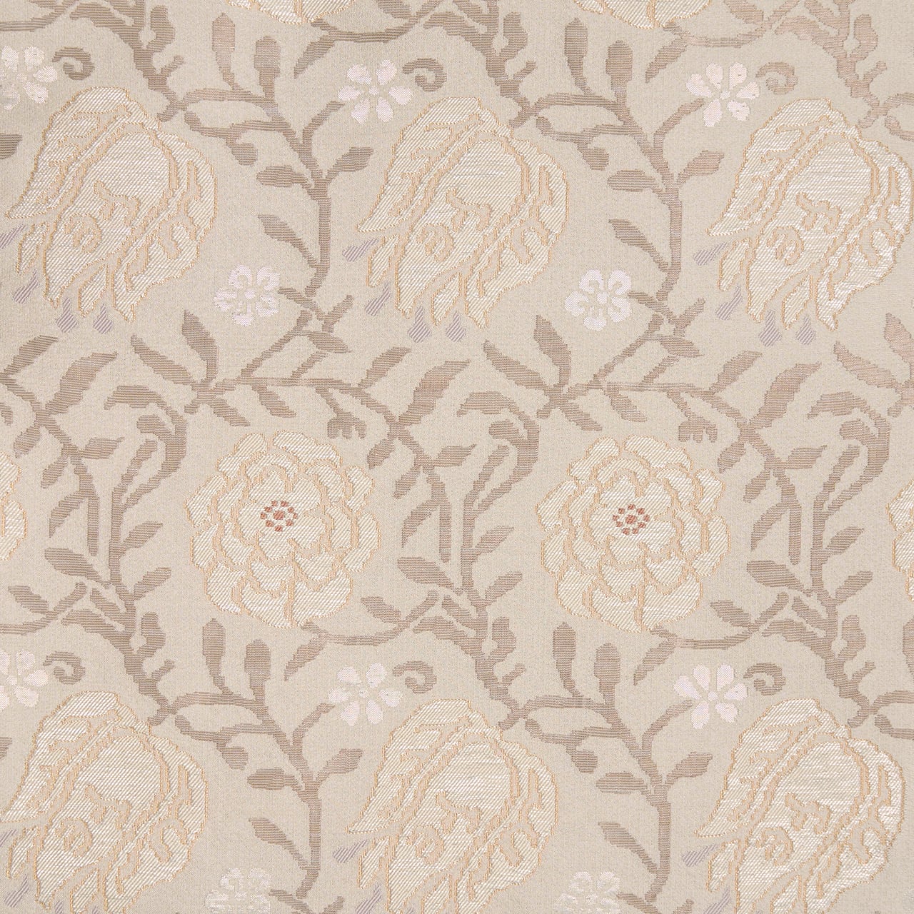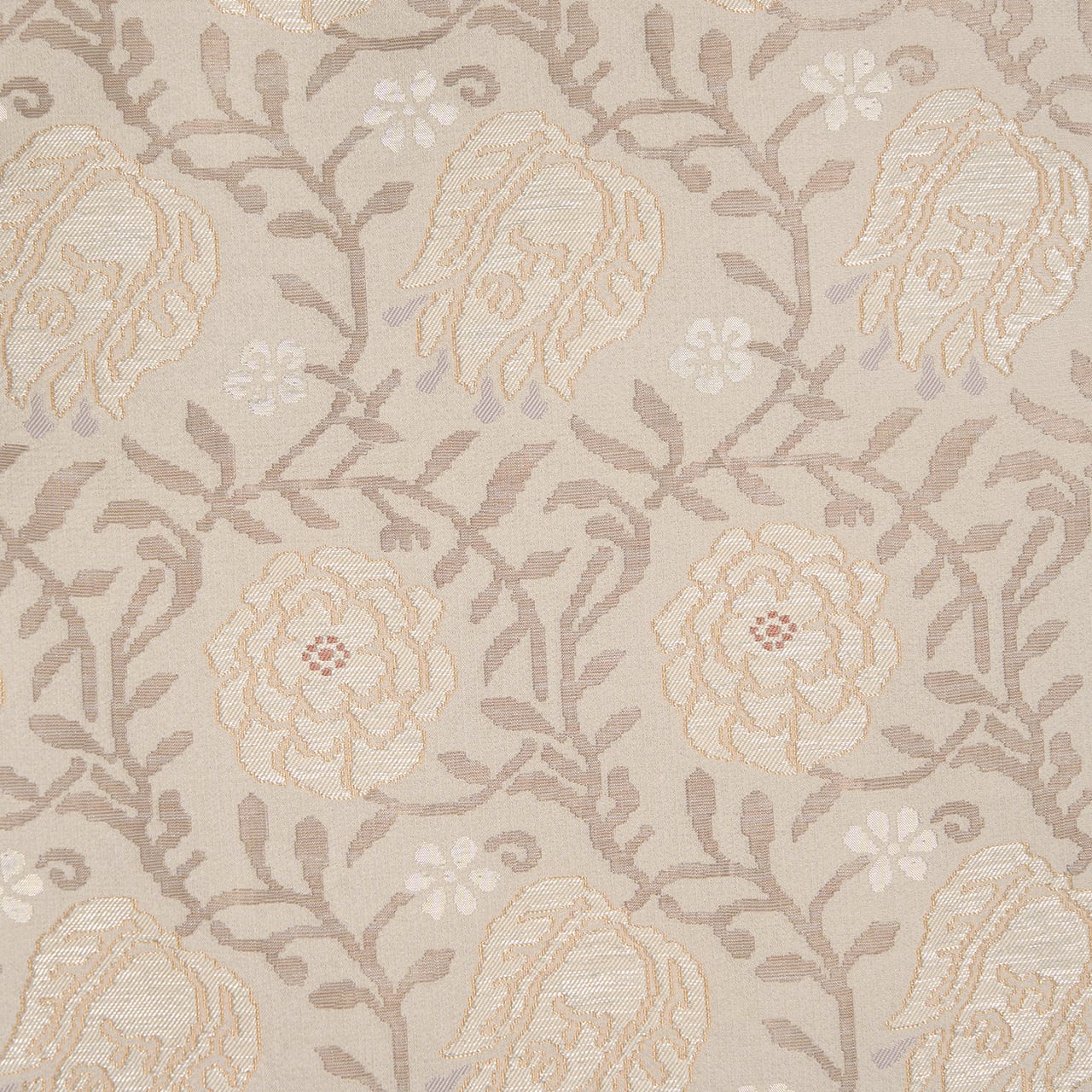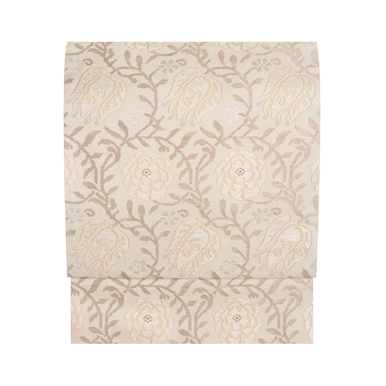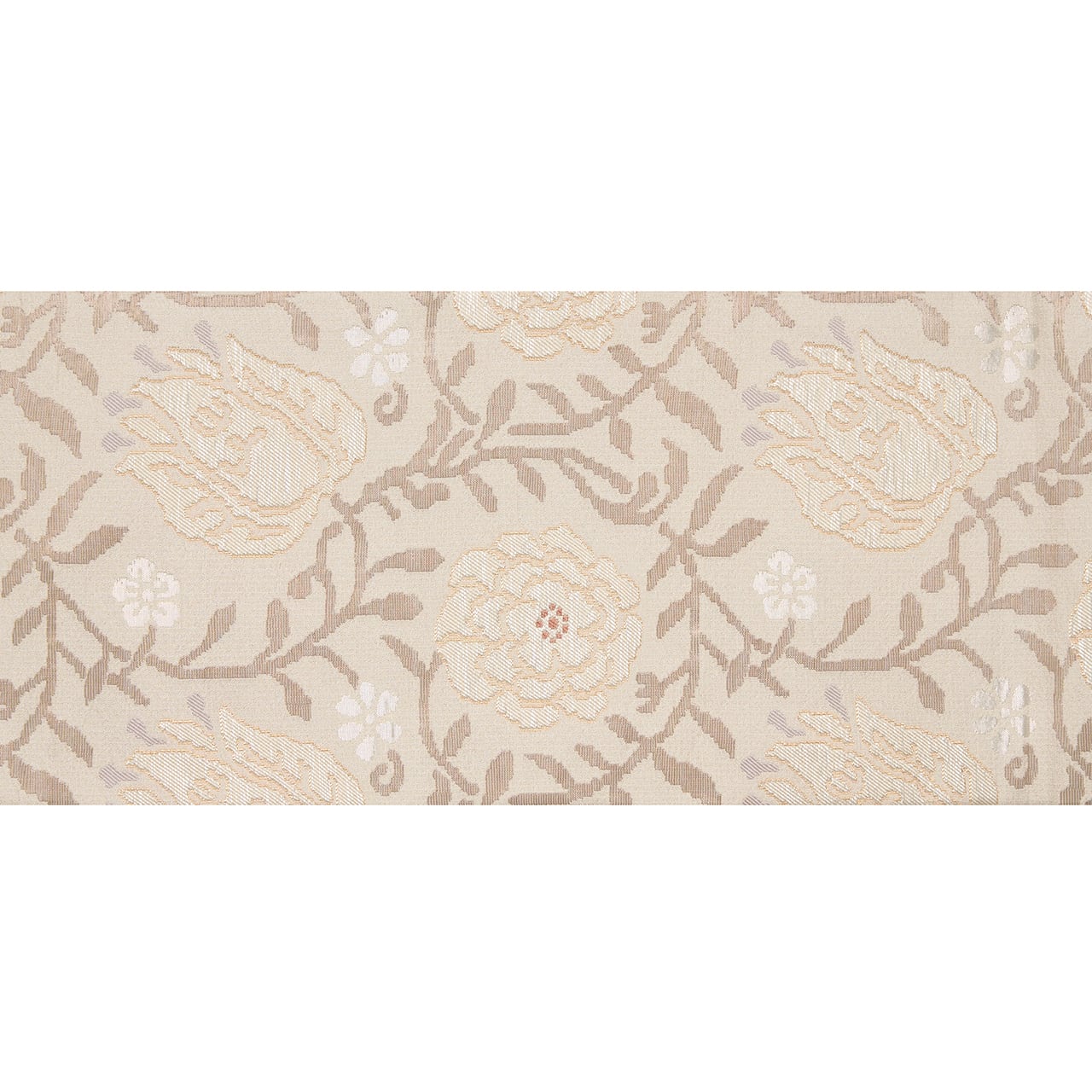 こちらの唐花の模様も、お花の部分は少しふくれたような織りになっていて、銀色の箔の糸も織り込まれたりして、白さが引き立つように工夫されています。