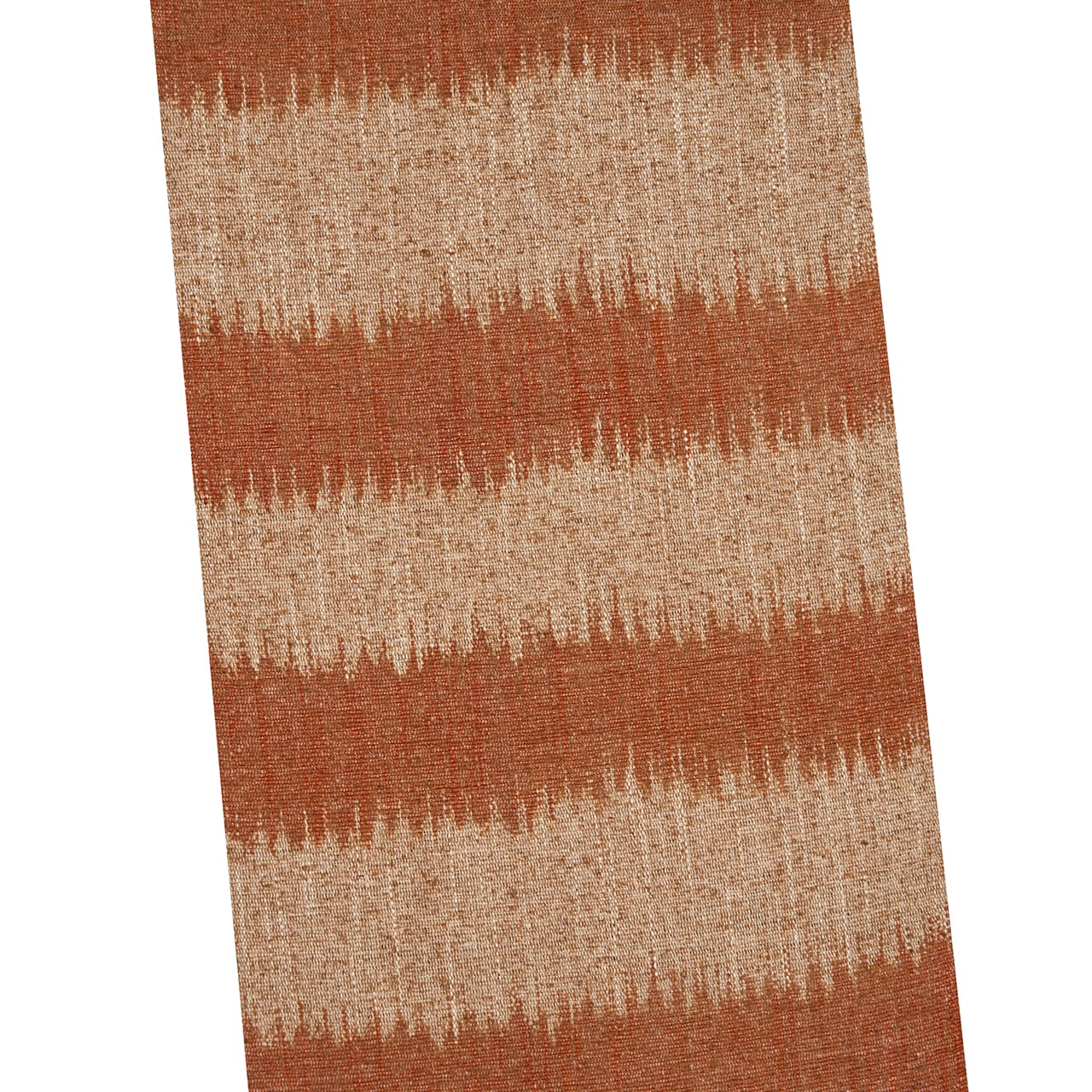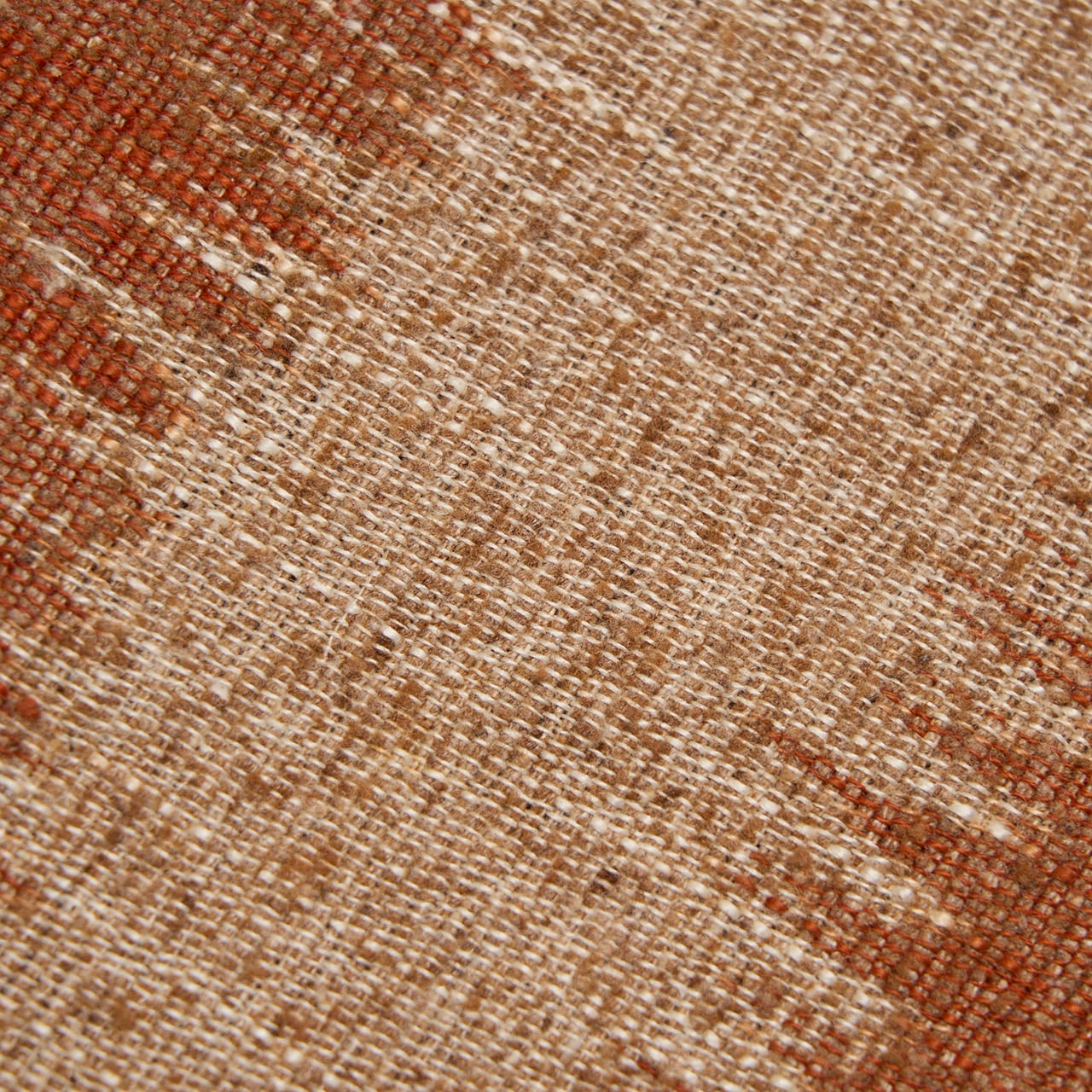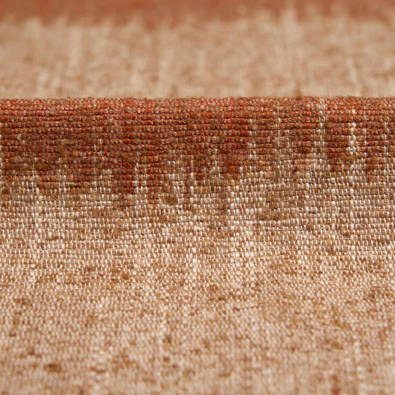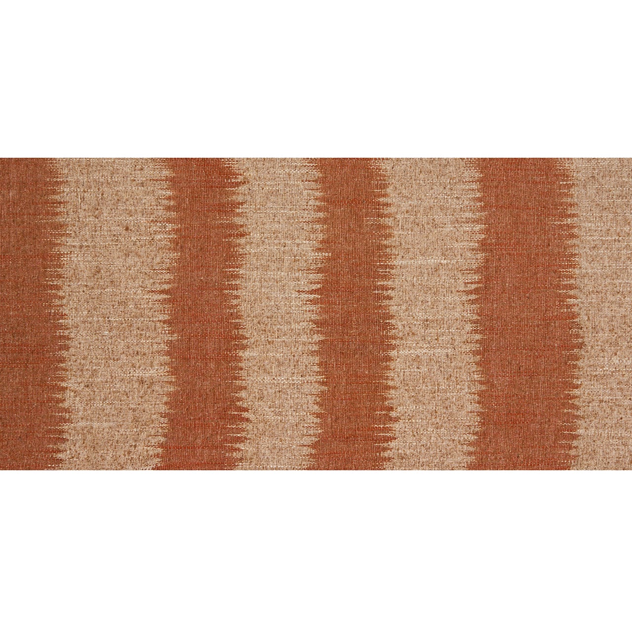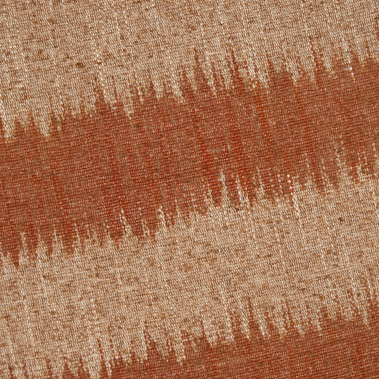 こちらはたっぷりとぜんまいの綿が織り込まれた亜麻色の地に、茜のような草木で染められた柿渋色の段が取られ、その縦の絣足の表情にも味わいのある、素敵な八寸名古屋帯です。