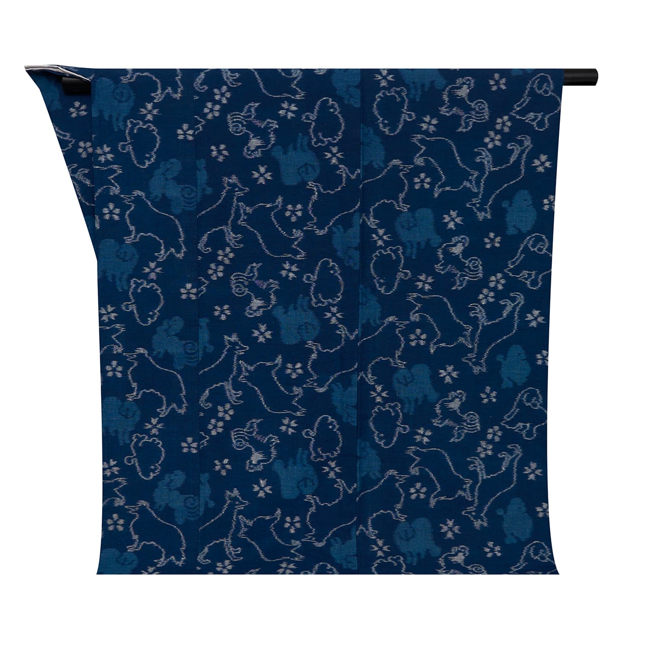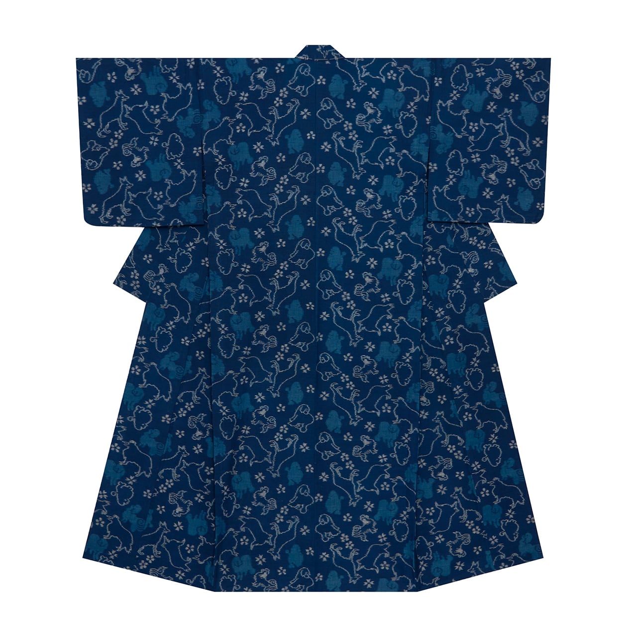 手紡ぎの糸の質感がさらりとした手触りの良いやや明るめの藍色の地に、いろいろな種類のワンちゃんが絣で織り出され、その間に桜や梅のようなお花が散らされた、とてもチャーミングな模様が魅力的な久留米絣の単衣のお着物です。