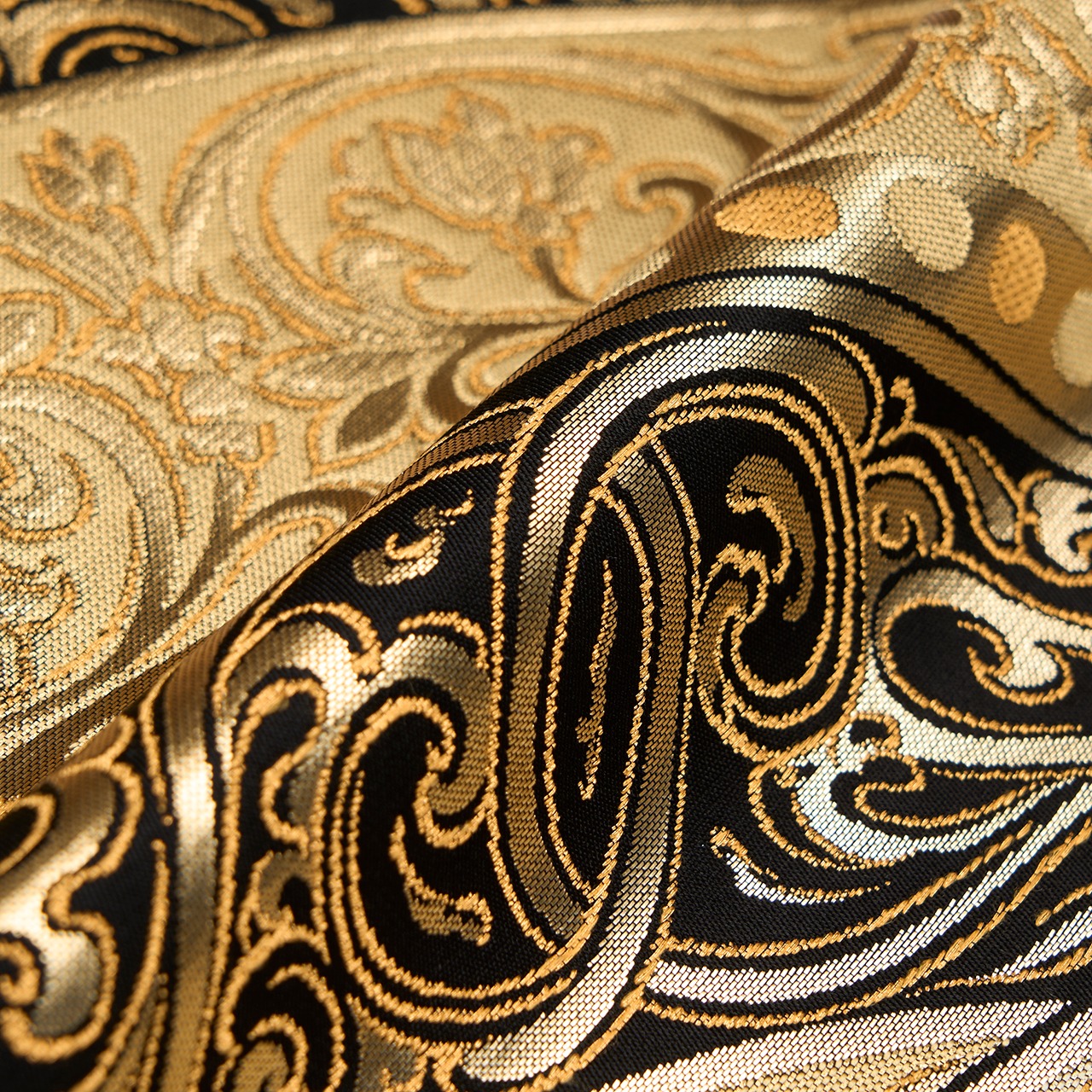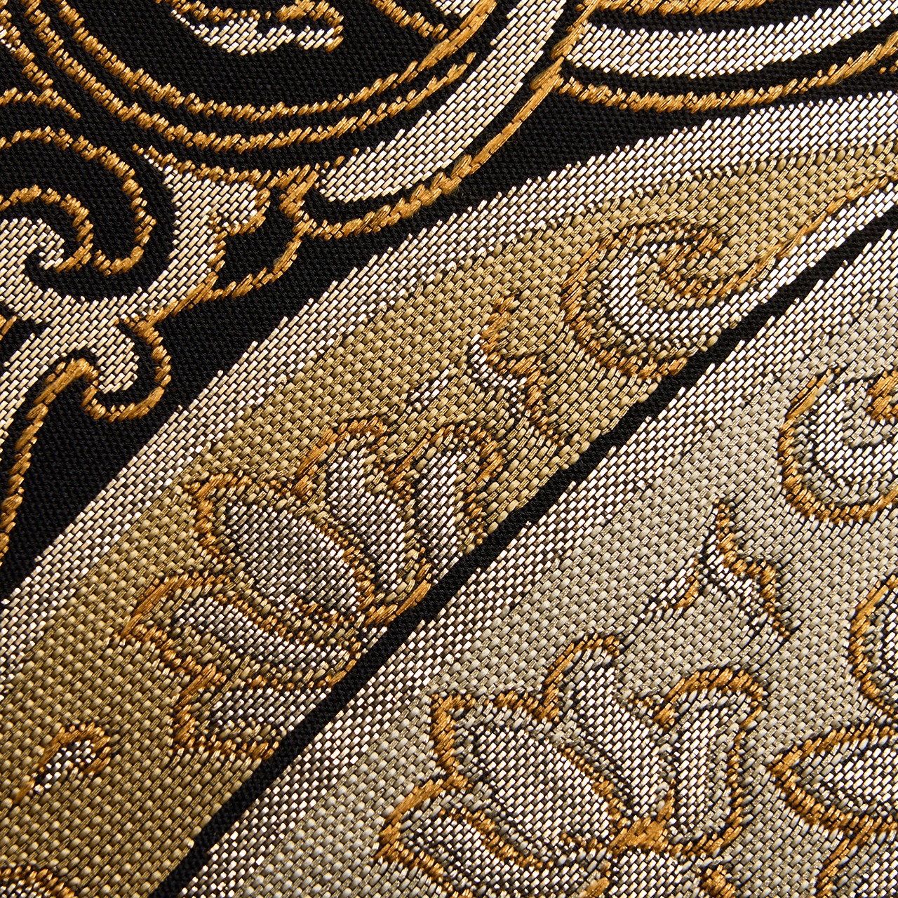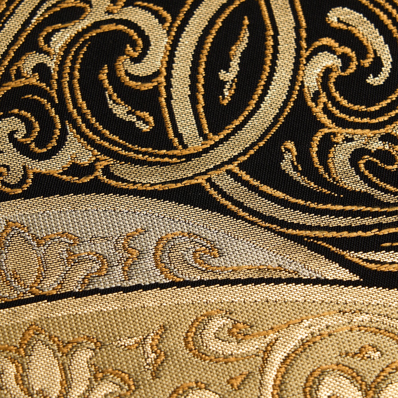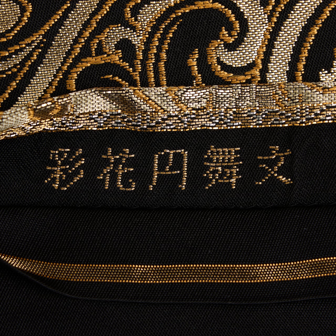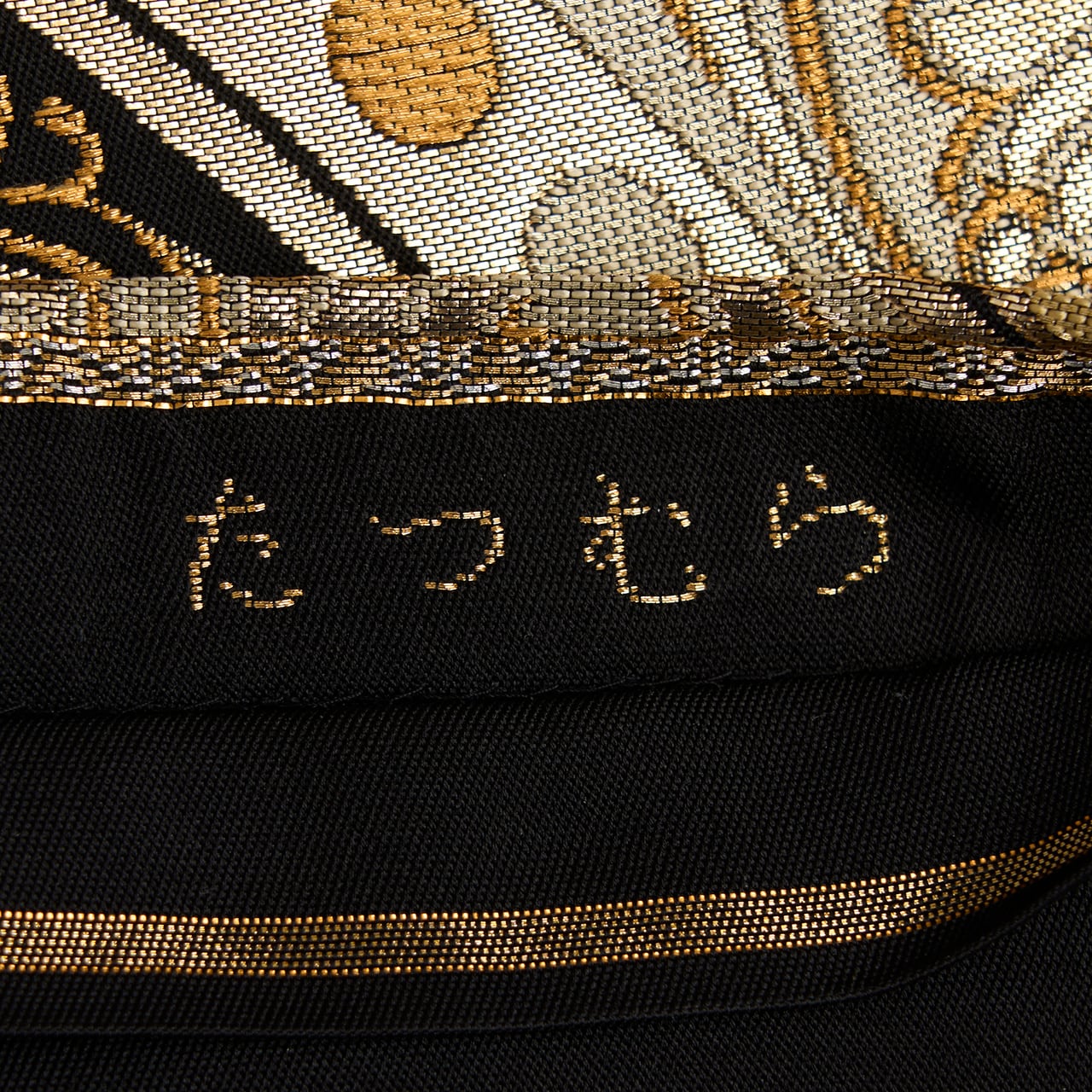 しっとりと織られた黒の地に、大きく弧を描いた線が何本も取られ、中には複雑に絡み合った蔓草の模様や花唐草模様、丸が並んだ模様などが、金箔の糸の色を変えられたり、質感を変えられたりして、巧みな手業を駆使してしっかりと織り上げられた、たつむらさんならではの力強さの感じられるゴージャスな本袋帯です。