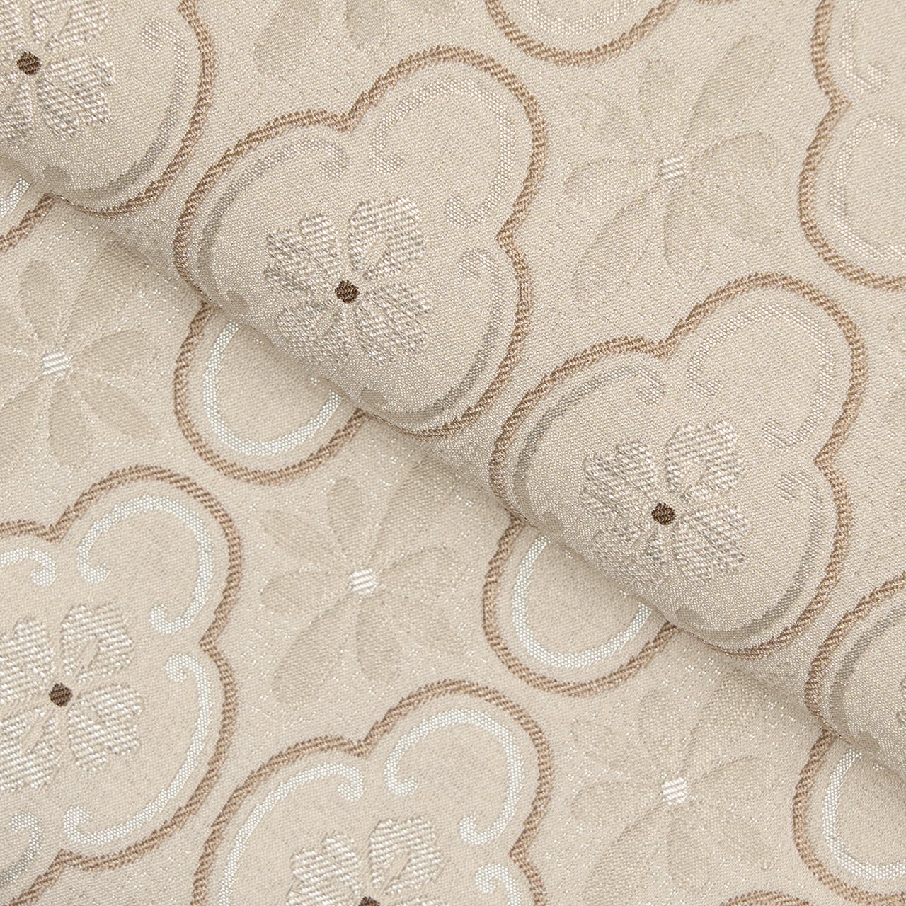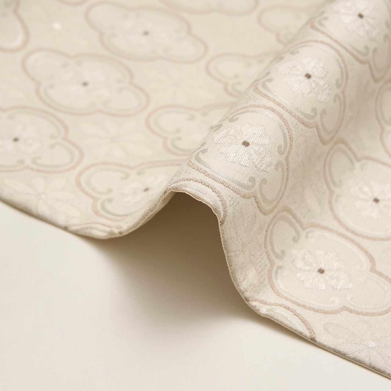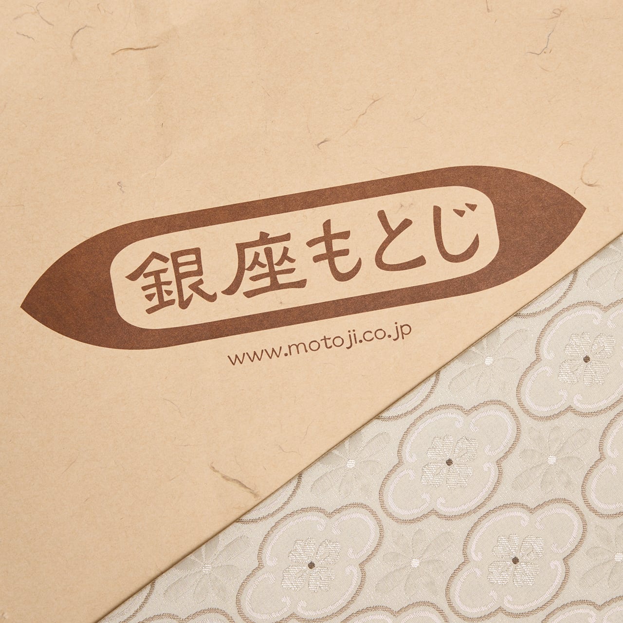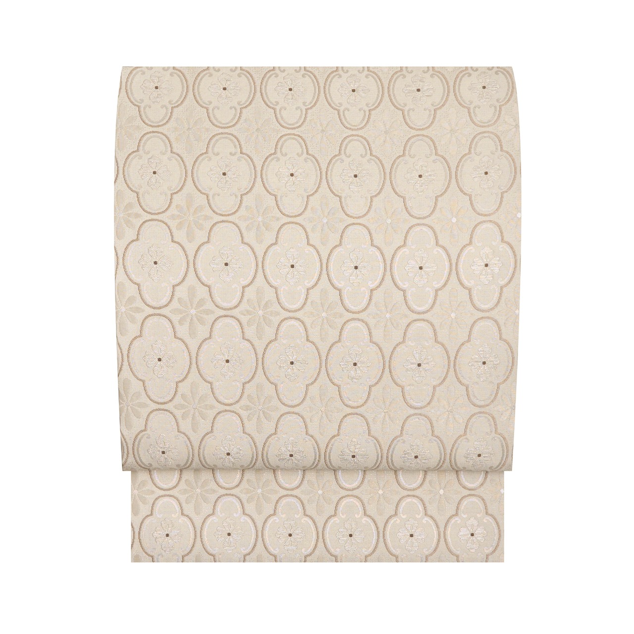 ほんの少しだけグレー味の感じられる白・素色のシャリっとした質感の地に、縦の木瓜のような形が連続して並んで枯野色の糸で織られた中に、4枚の花びらのお花が銀糸で織り出され、その間には8枚の花びらのお花が象牙色の糸で並んで織り込まれた、織楽浅野さんらしい同系色の色合いがセンス良くデザインされた素敵な袋帯です。