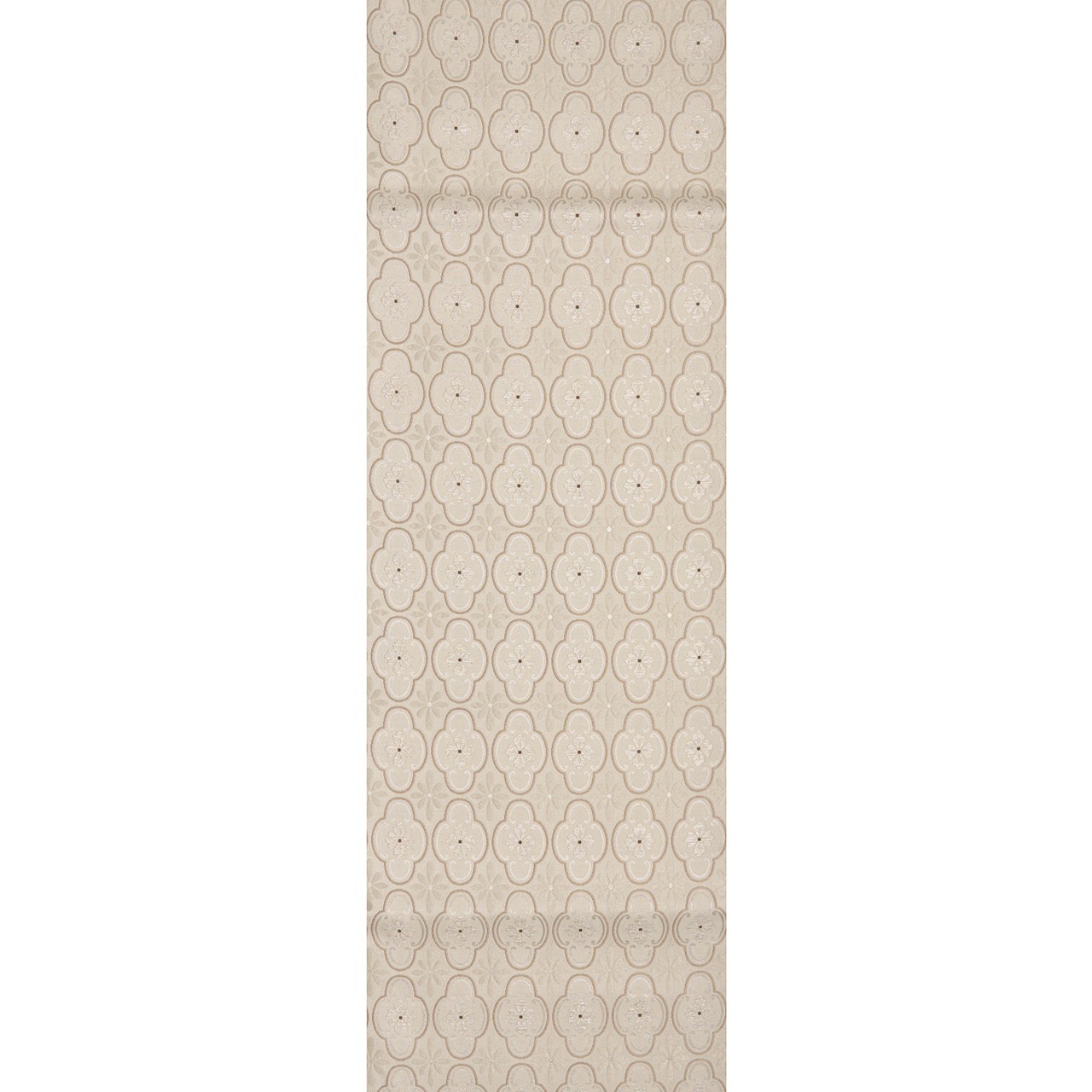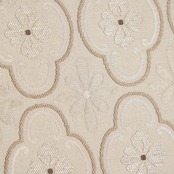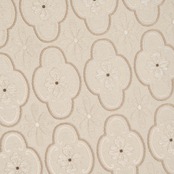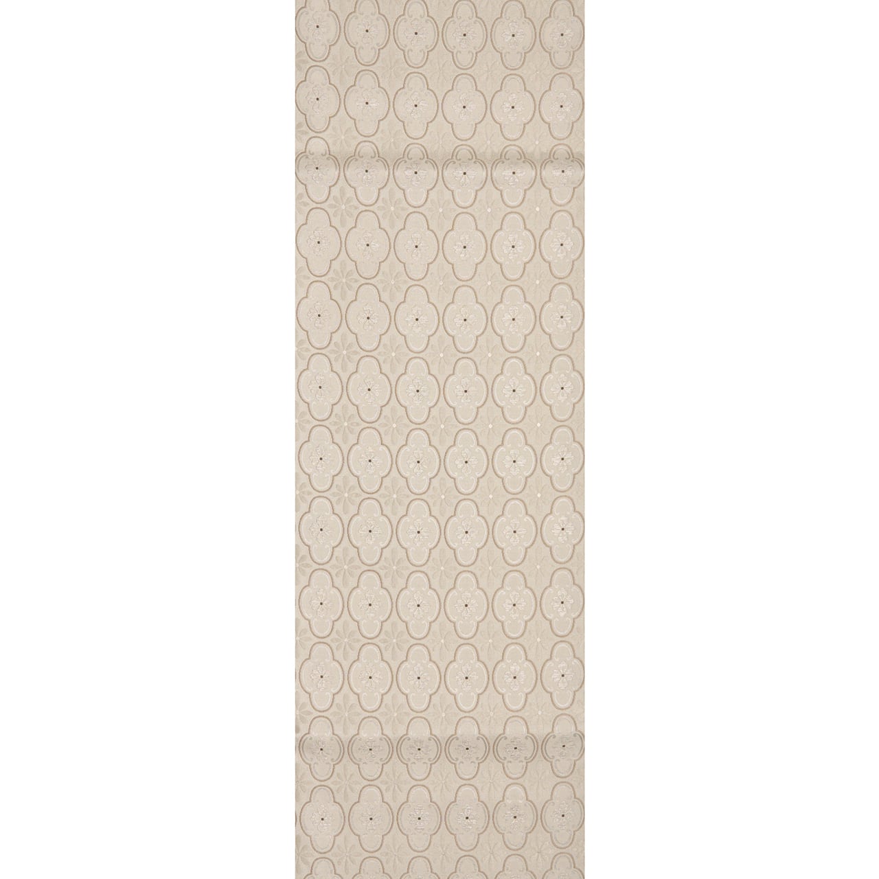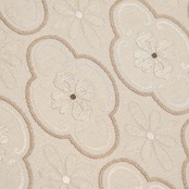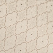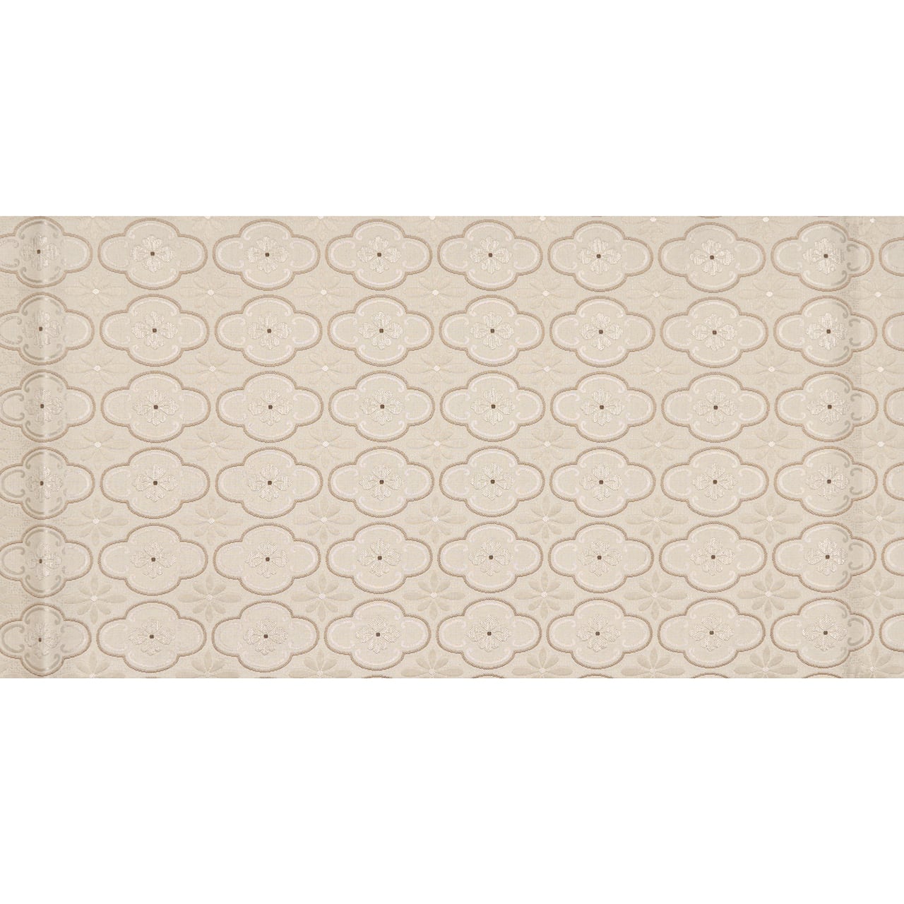 ほんの少しだけグレー味の感じられる白・素色のシャリっとした質感の地に、縦の木瓜のような形が連続して並んで枯野色の糸で織られた中に、4枚の花びらのお花が銀糸で織り出され、その間には8枚の花びらのお花が象牙色の糸で並んで織り込まれた、織楽浅野さんらしい同系色の色合いがセンス良くデザインされた素敵な袋帯です。