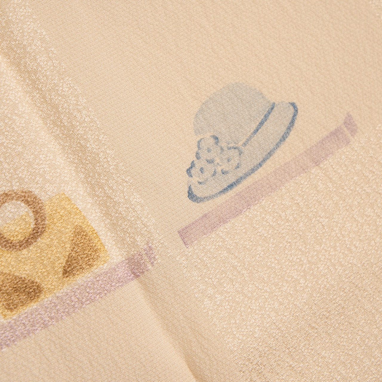 大きめの市松の地模様が織られた、少しシボのあるやや薄手の一越ちりめんの淡いピンク・灰梅色の生地に、帽子やバッグ、ハイヒール、日傘、ブーツ、イヤリング、口紅などいろいろなファッショングッズが飛び飛びに横に並んで淡いパステルトーンで描かれた、とてもお洒落な長襦袢です。