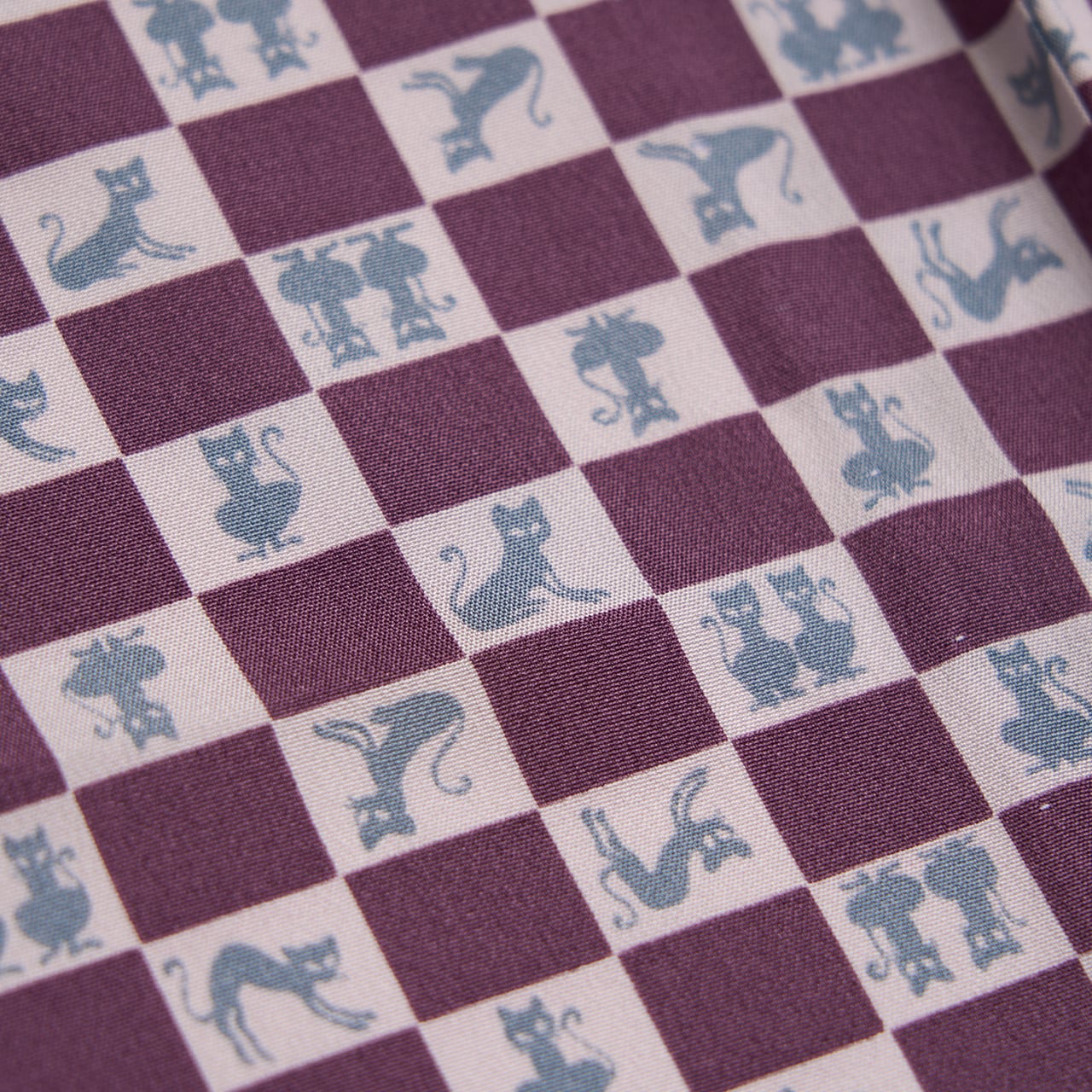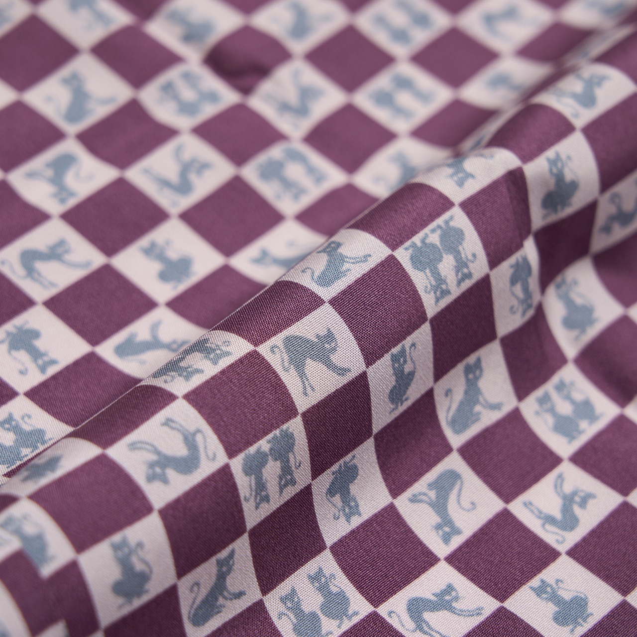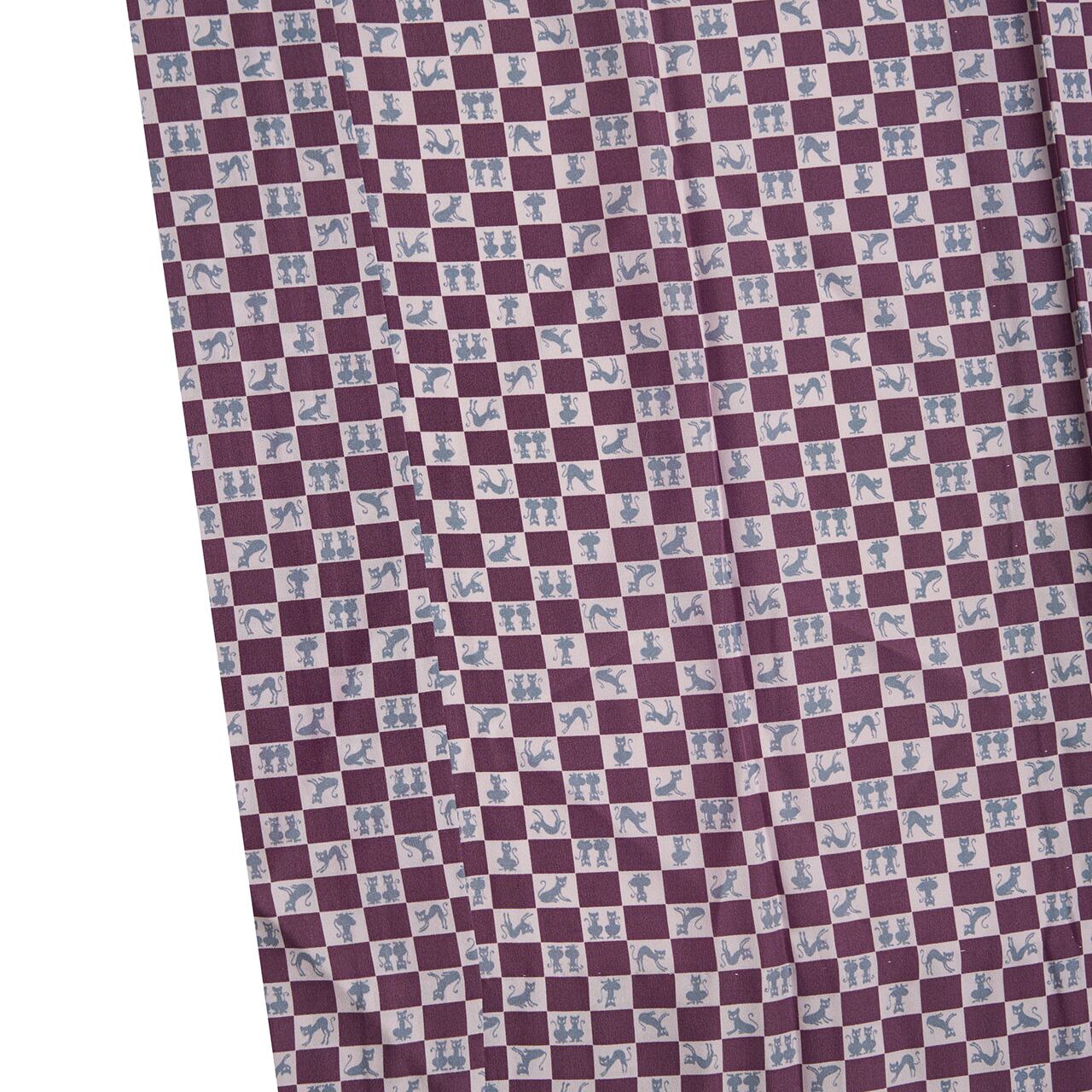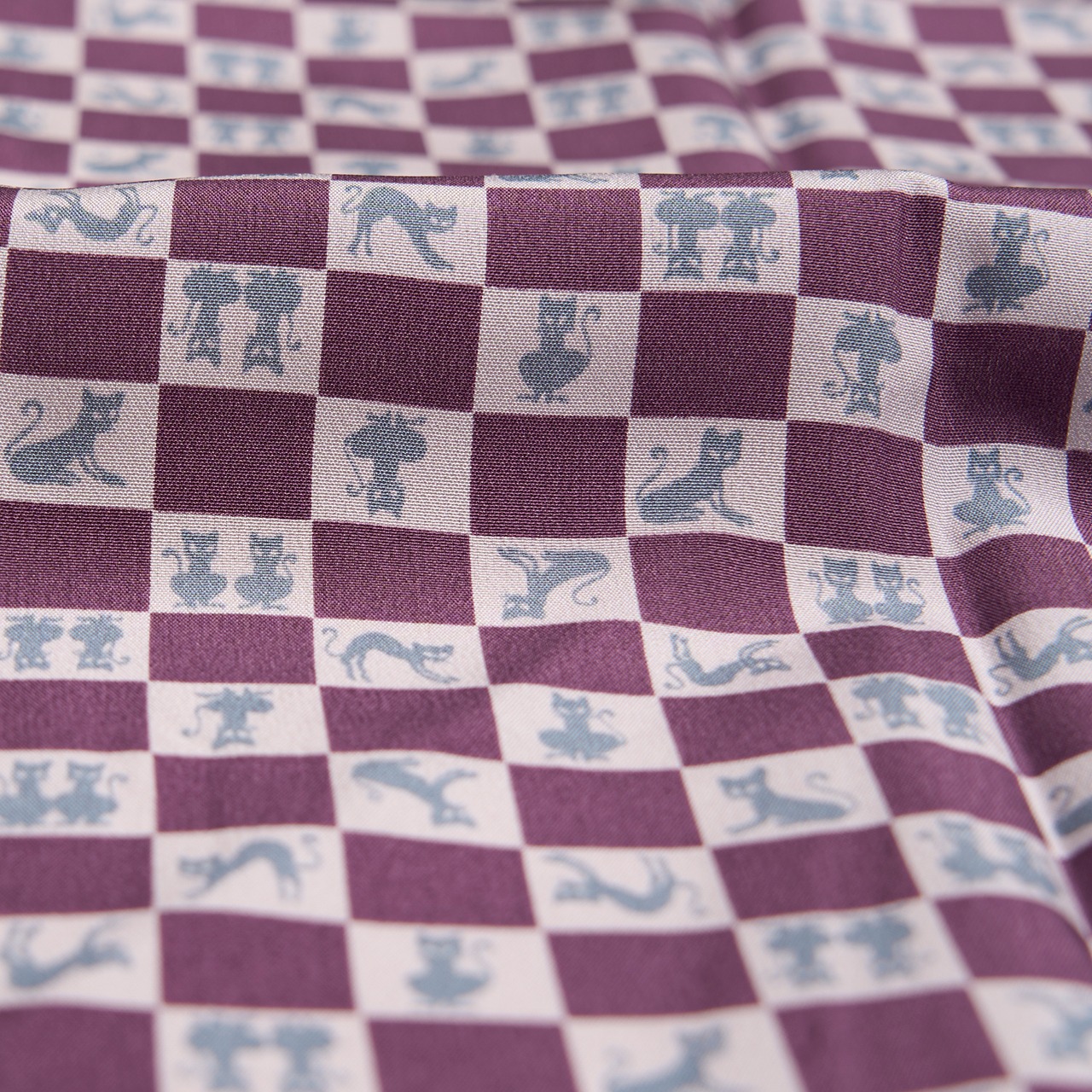 少し赤味のある濃い紫・暗紅色の精華パレスのようなシャリっとした質感の生地に、小さな市松の模様が淡い藤色・薄葡萄色で取られ、その淡い色の方には小さなアールデコ調の猫の模様が描かれた、とても可愛らしい雰囲気の長襦袢です。