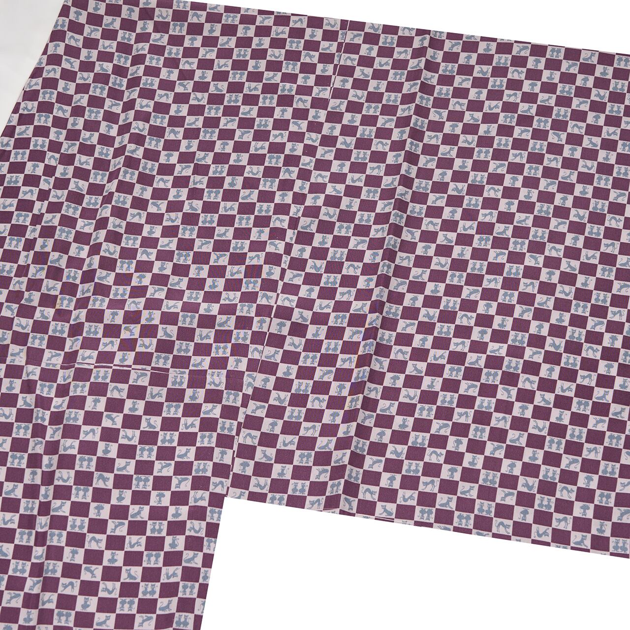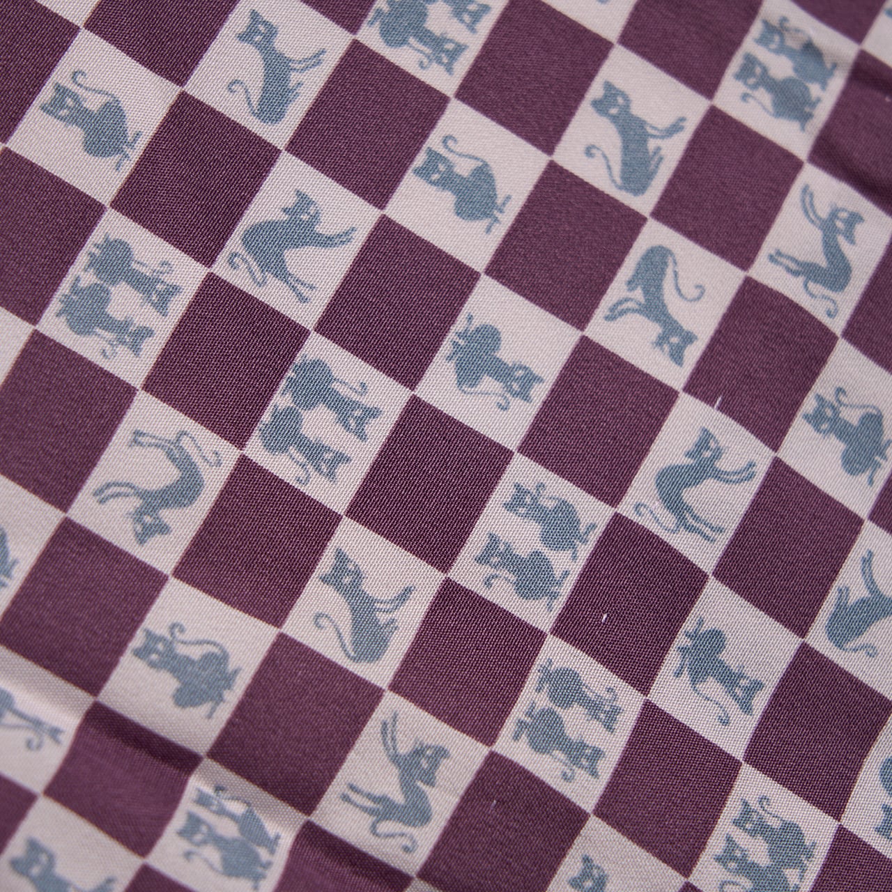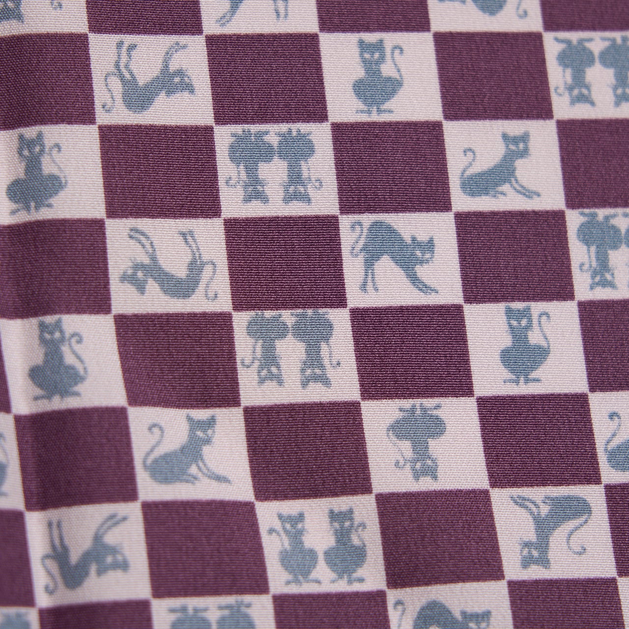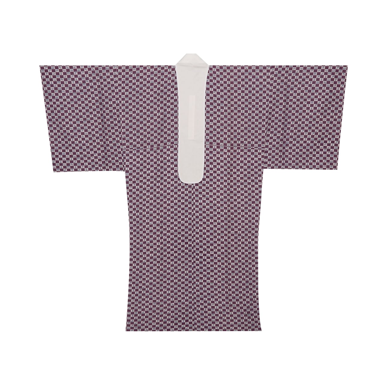 少し赤味のある濃い紫・暗紅色の精華パレスのようなシャリっとした質感の生地に、小さな市松の模様が淡い藤色・薄葡萄色で取られ、その淡い色の方には小さなアールデコ調の猫の模様が描かれた、とても可愛らしい雰囲気の長襦袢です。