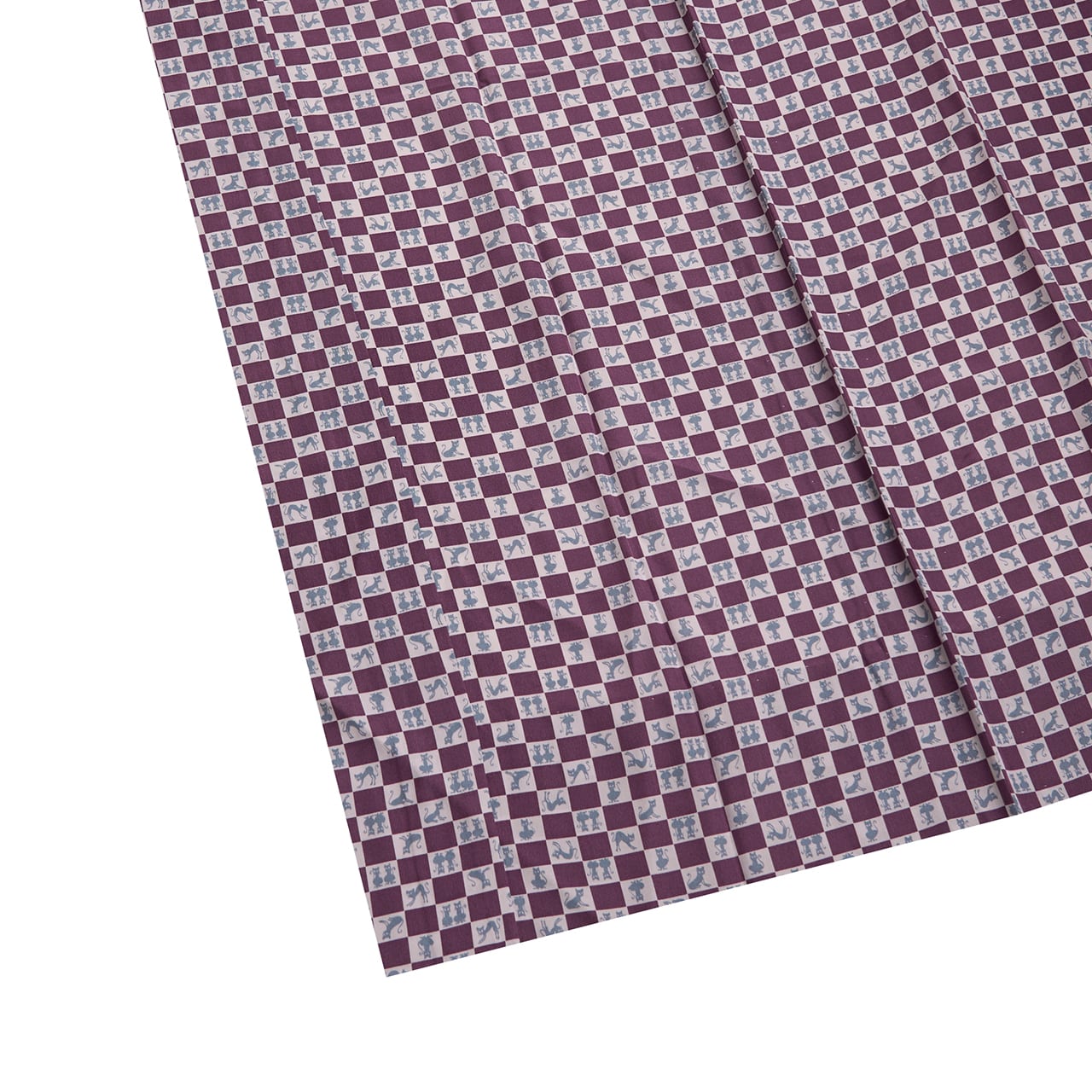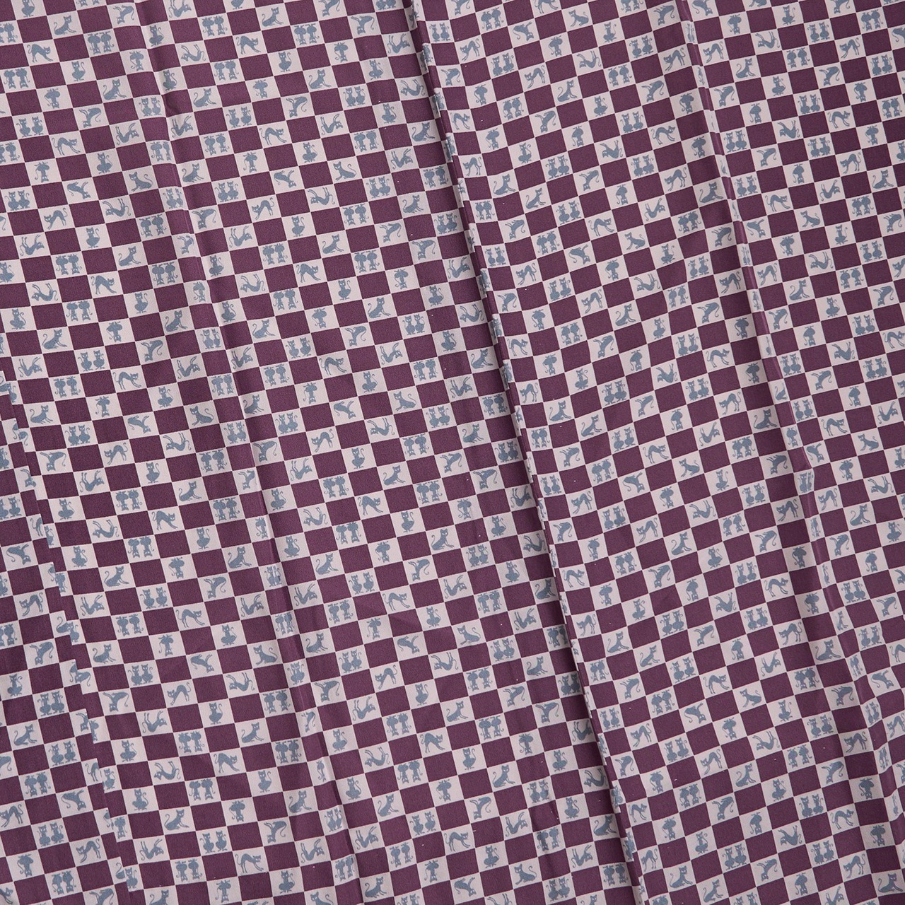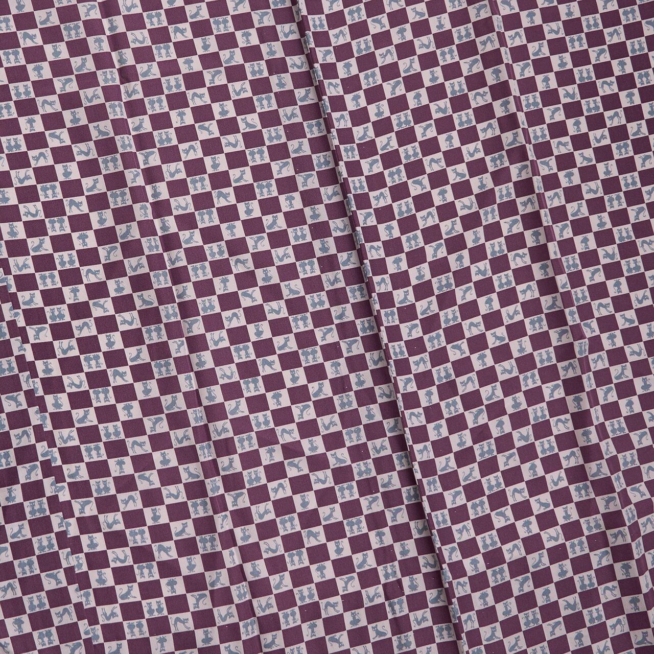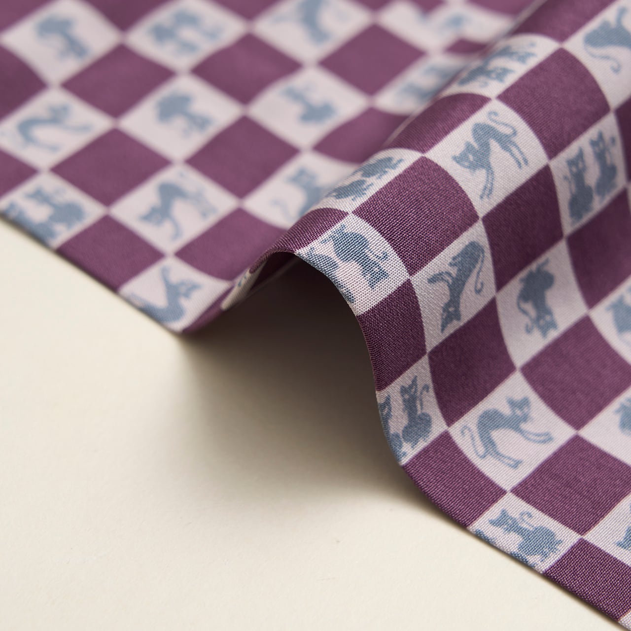 少し赤味のある濃い紫・暗紅色の精華パレスのようなシャリっとした質感の生地に、小さな市松の模様が淡い藤色・薄葡萄色で取られ、その淡い色の方には小さなアールデコ調の猫の模様が描かれた、とても可愛らしい雰囲気の長襦袢です。