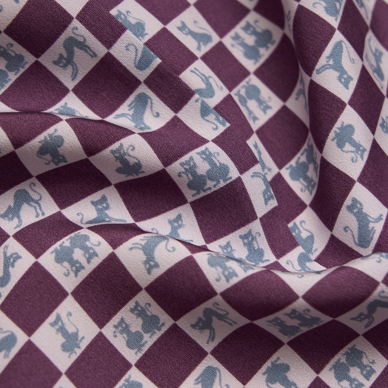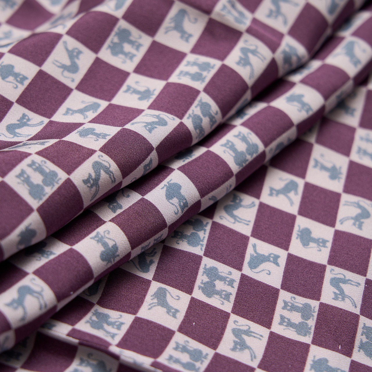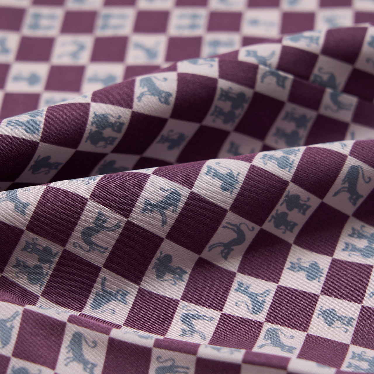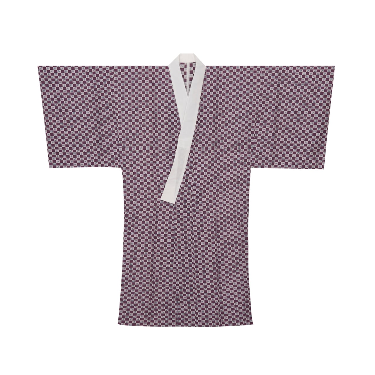 少し赤味のある濃い紫・暗紅色の精華パレスのようなシャリっとした質感の生地に、小さな市松の模様が淡い藤色・薄葡萄色で取られ、その淡い色の方には小さなアールデコ調の猫の模様が描かれた、とても可愛らしい雰囲気の長襦袢です。
