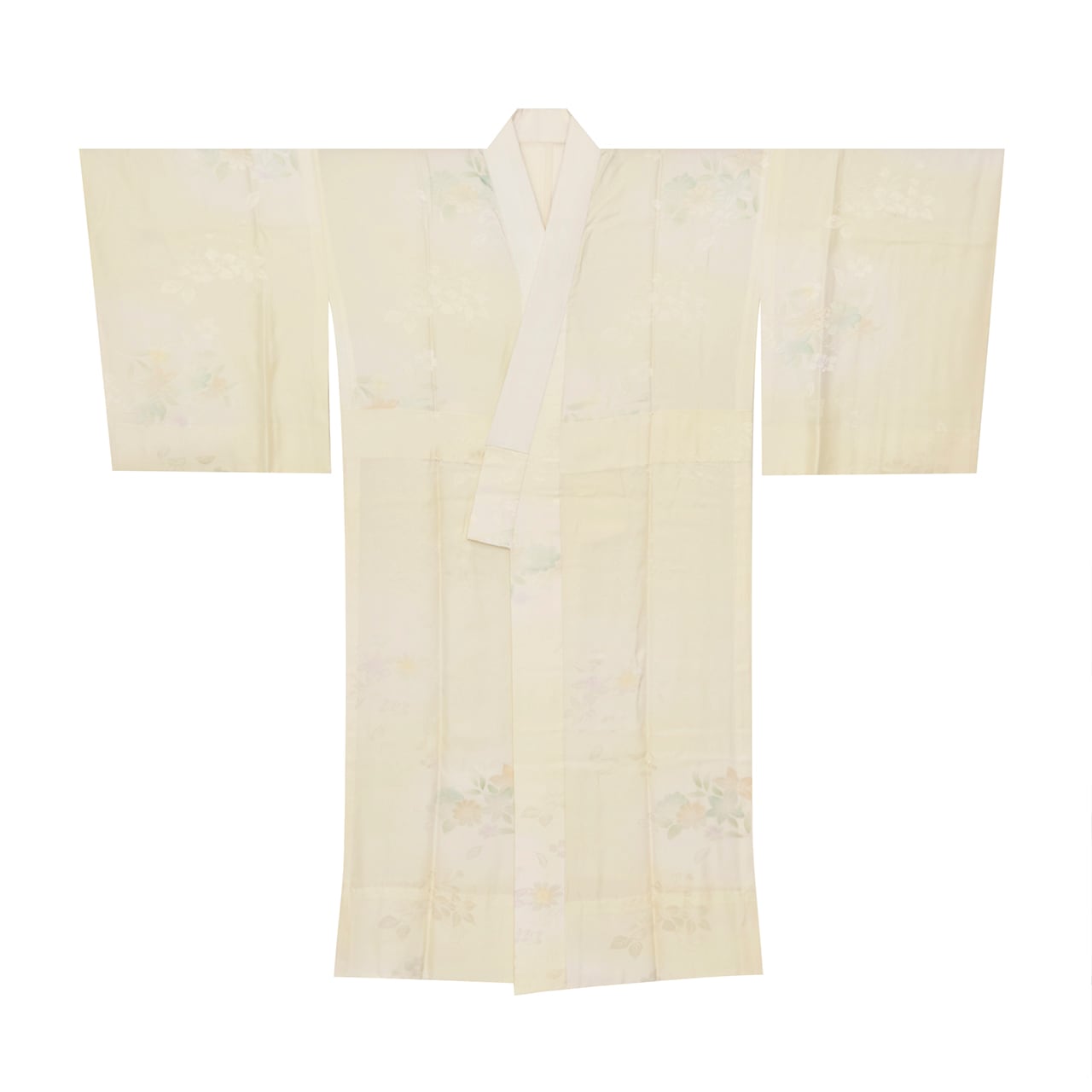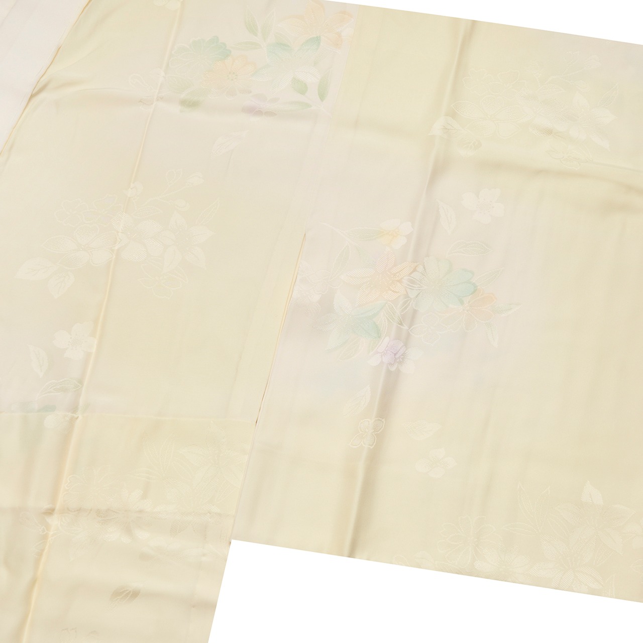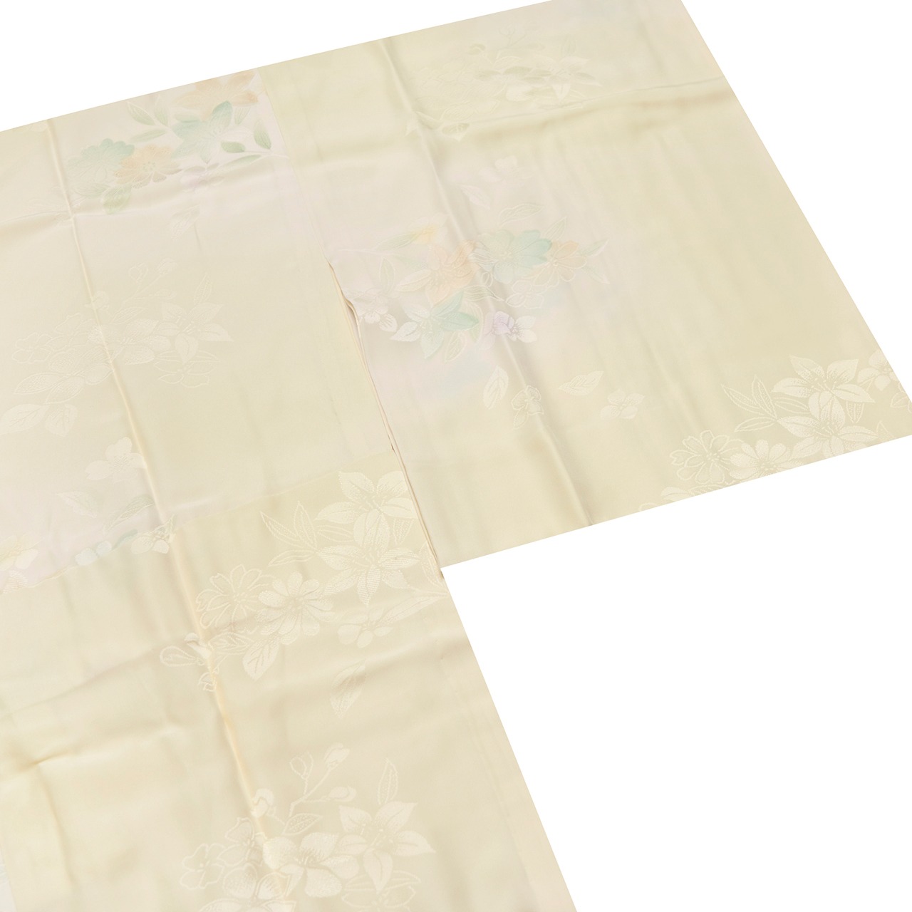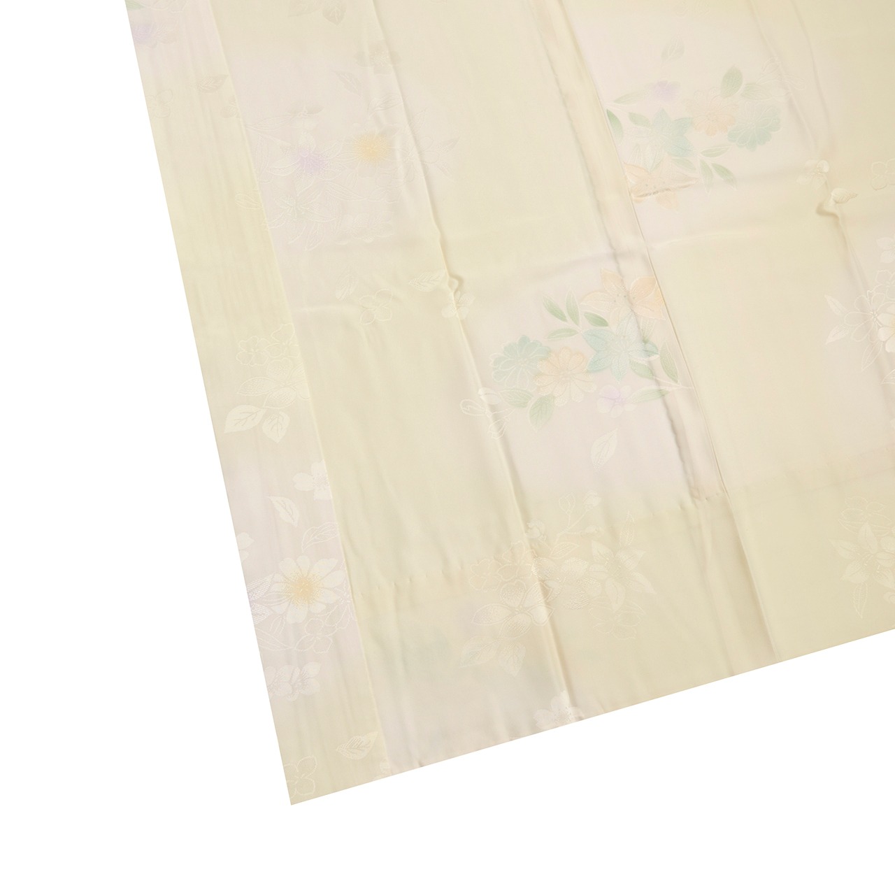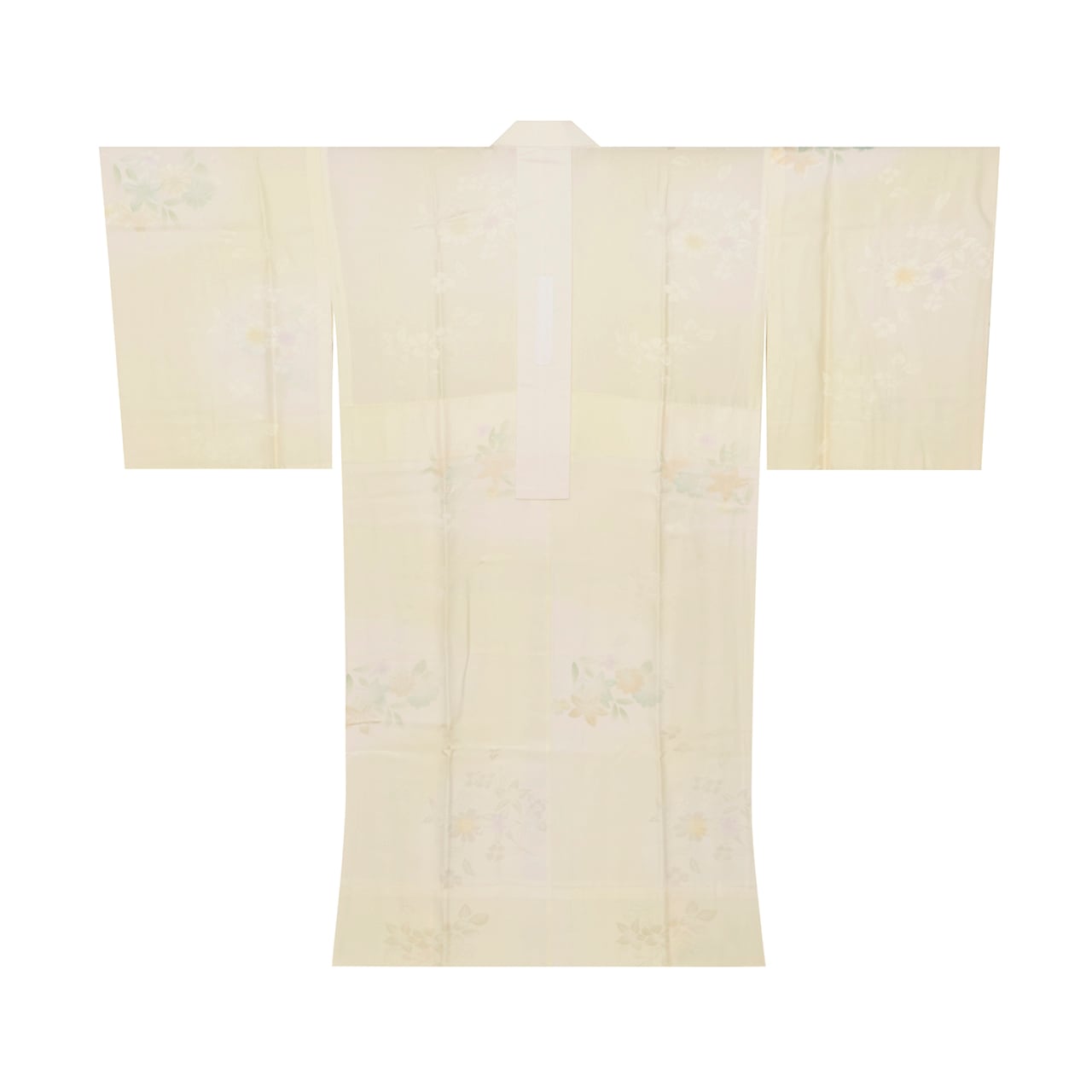 菊や桜や百合のようないろいろなお花の地模様のあるしっとりとした鳥の子色の生地が、地模様のところは白く暈しのようなに染め抜かれ、淡い緑・薄萌葱色や淡紅藤色などでほんのりと色付けされた高級感のある素敵な長襦袢です。