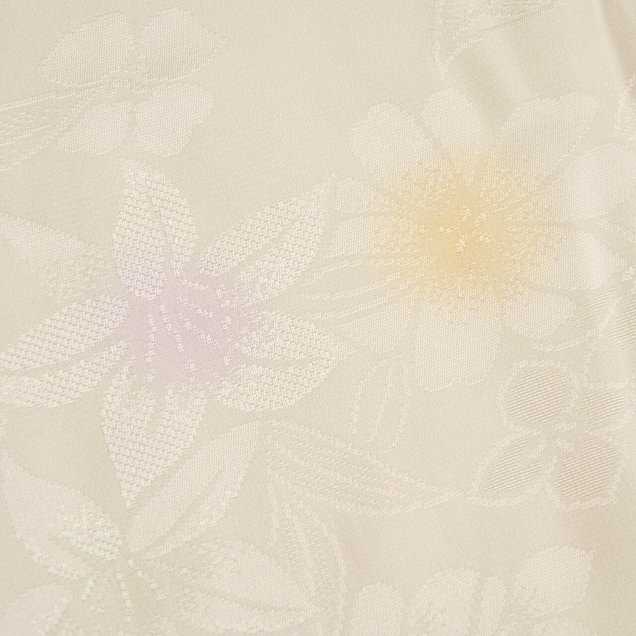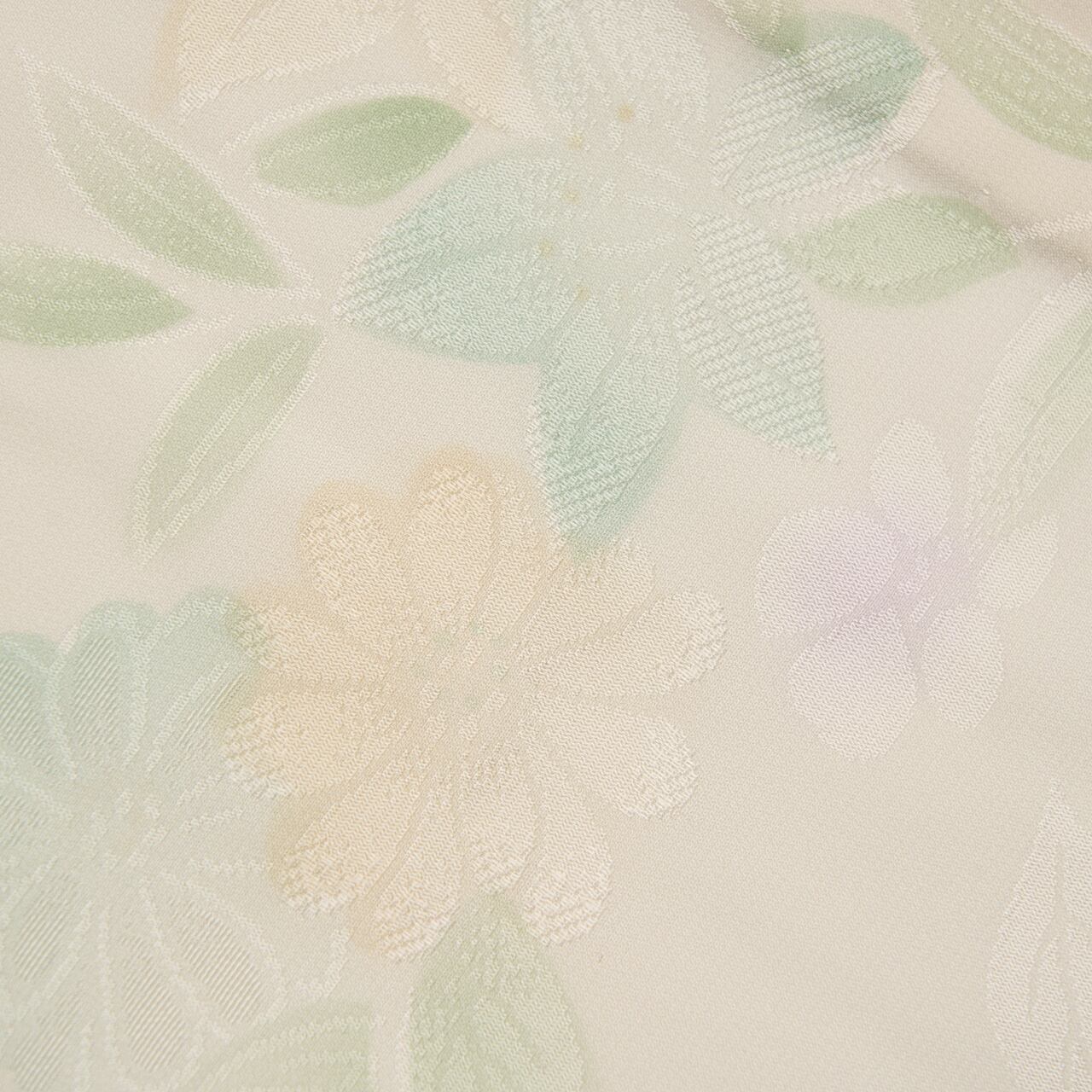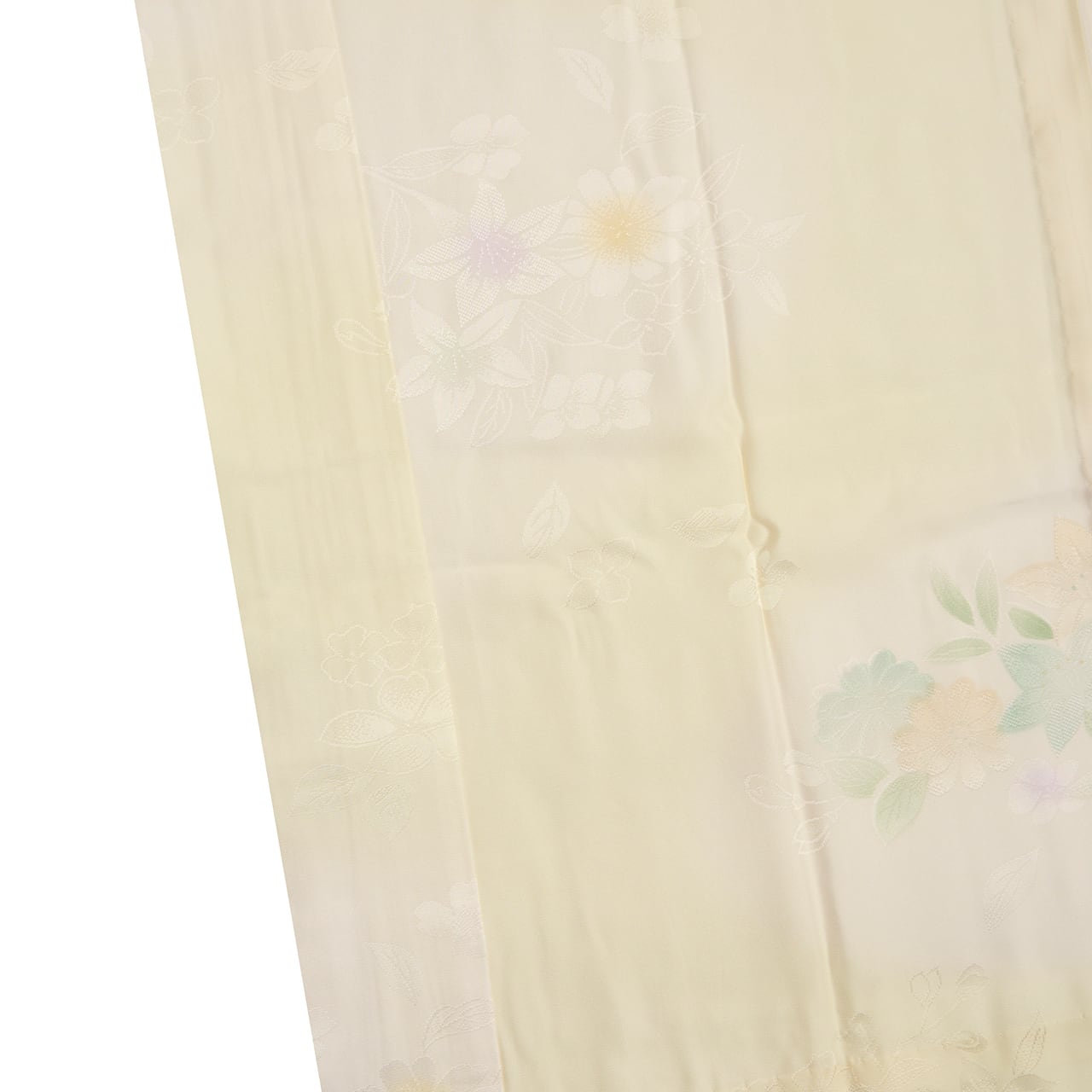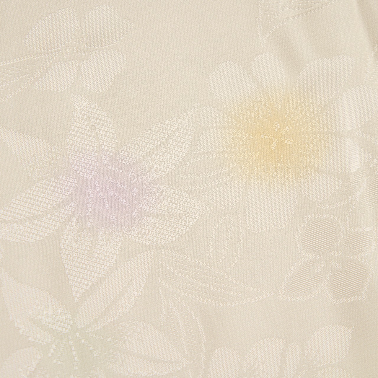 菊や桜や百合のようないろいろなお花の地模様のあるしっとりとした鳥の子色の生地が、地模様のところは白く暈しのようなに染め抜かれ、淡い緑・薄萌葱色や淡紅藤色などでほんのりと色付けされた高級感のある素敵な長襦袢です。