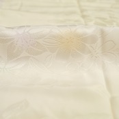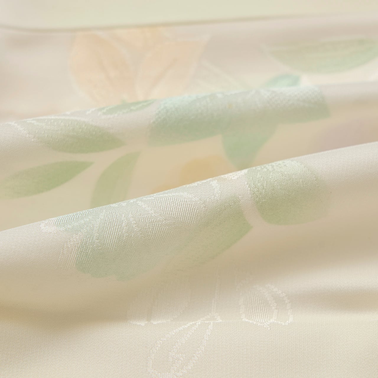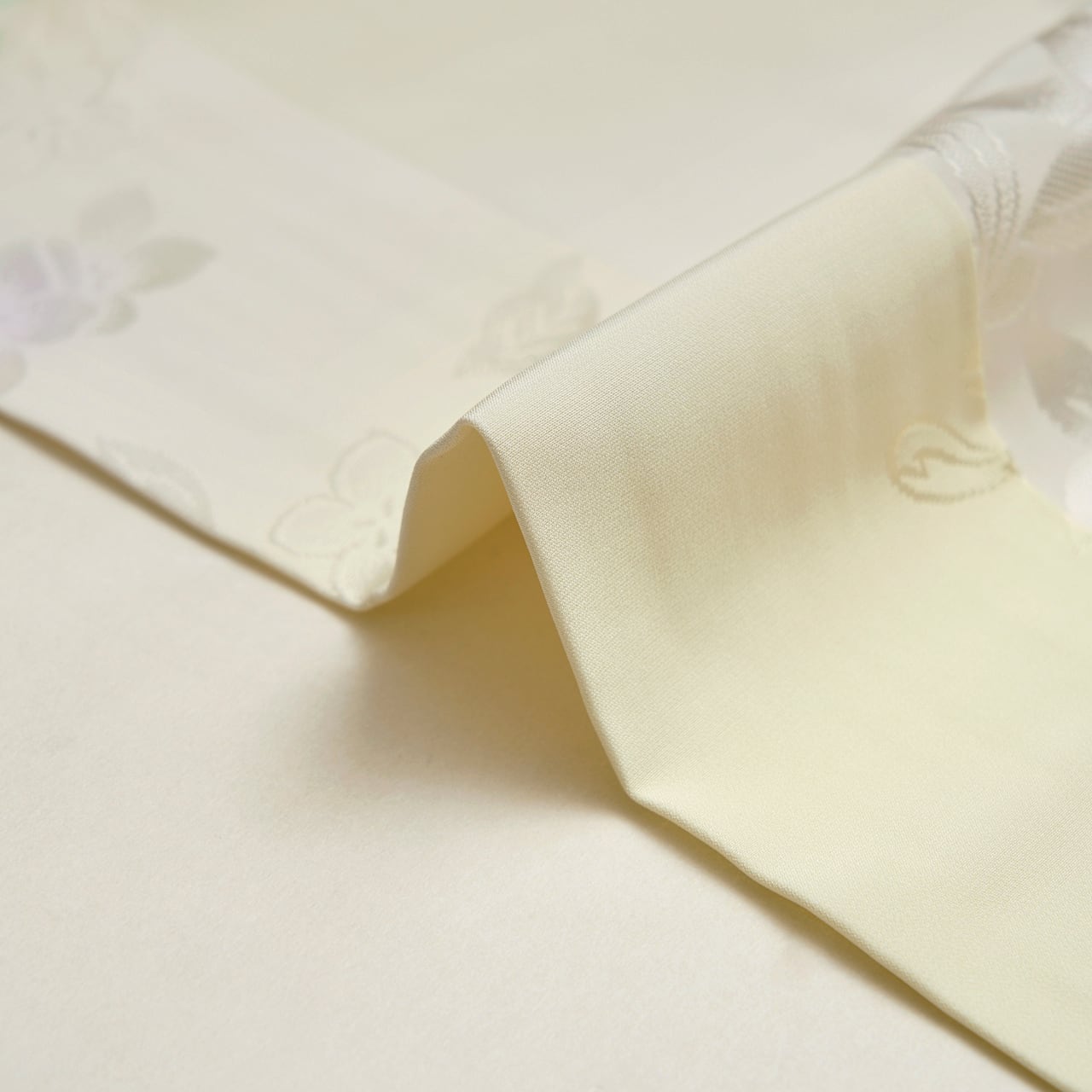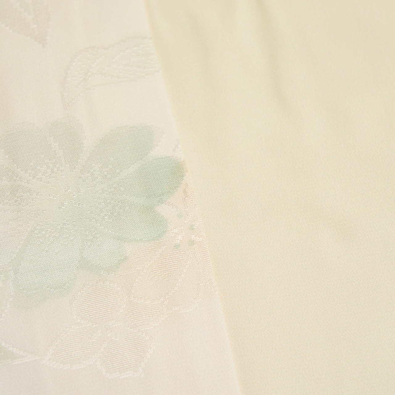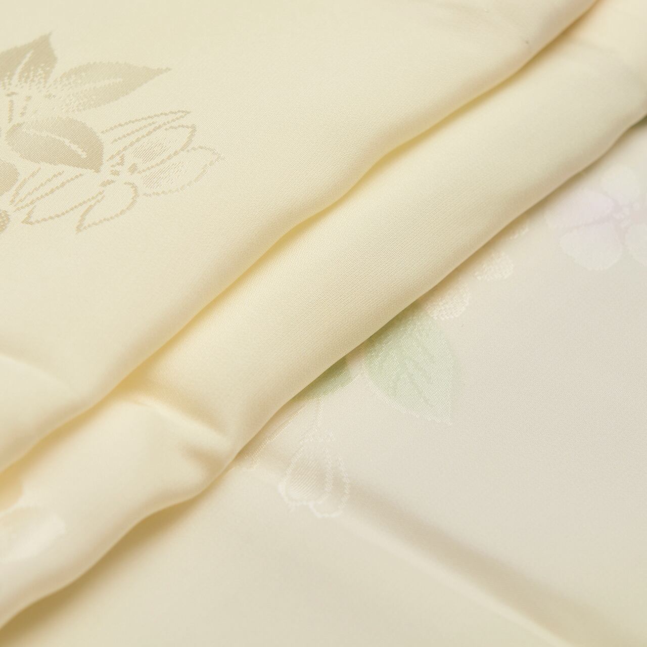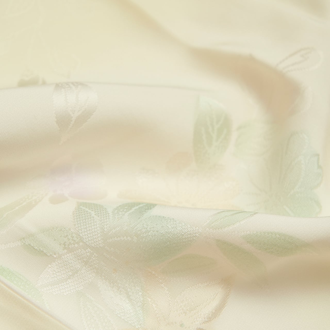 菊や桜や百合のようないろいろなお花の地模様のあるしっとりとした鳥の子色の生地が、地模様のところは白く暈しのようなに染め抜かれ、淡い緑・薄萌葱色や淡紅藤色などでほんのりと色付けされた高級感のある素敵な長襦袢です。