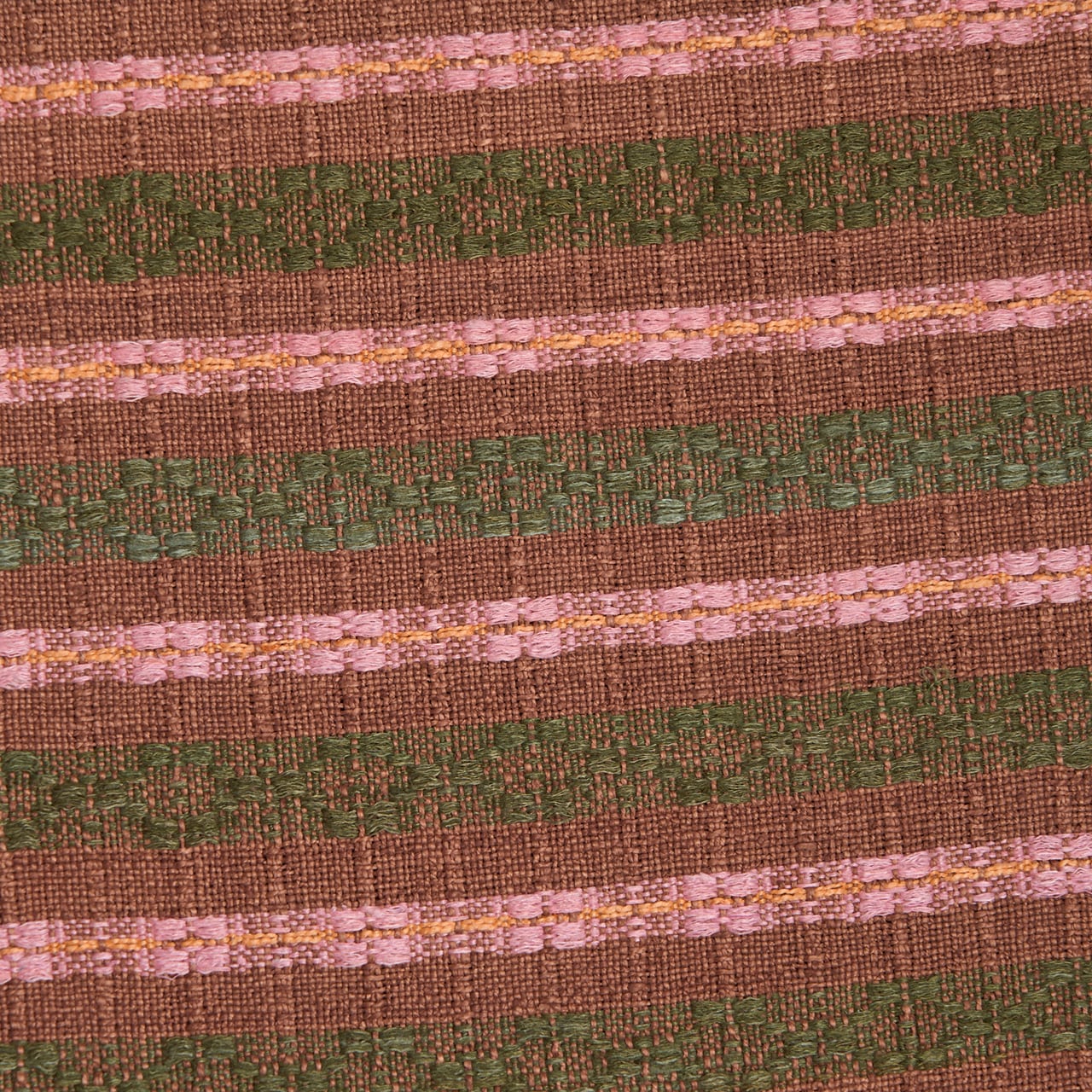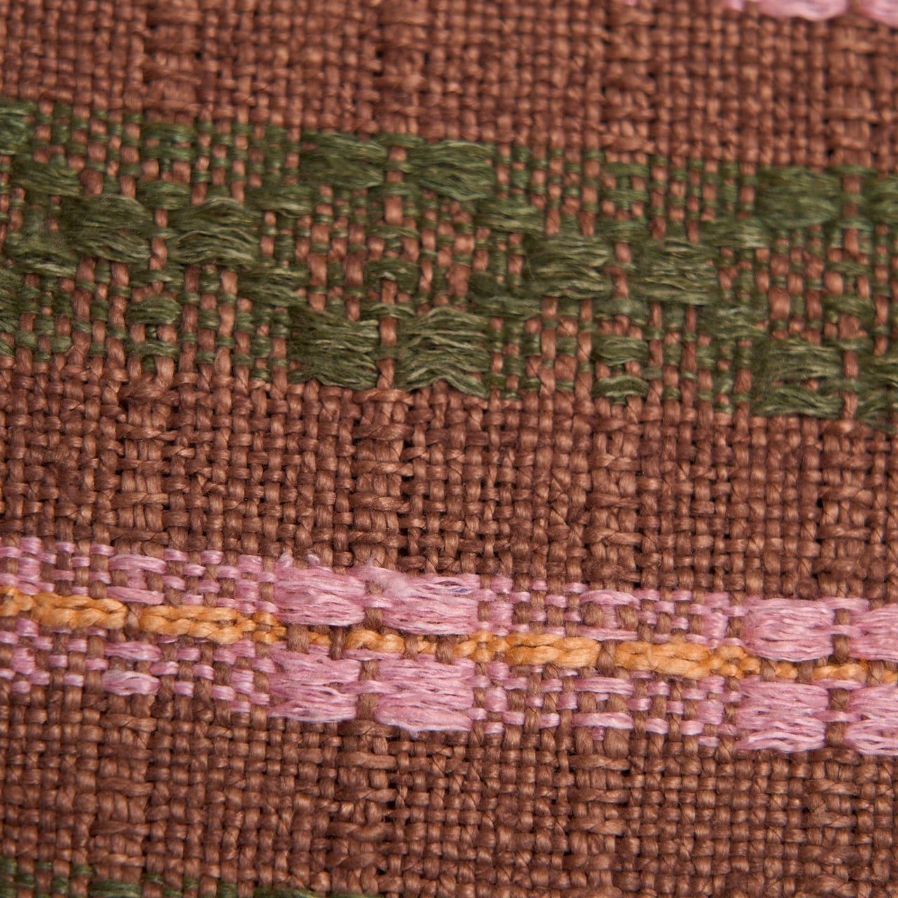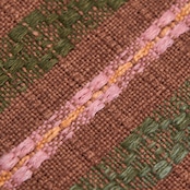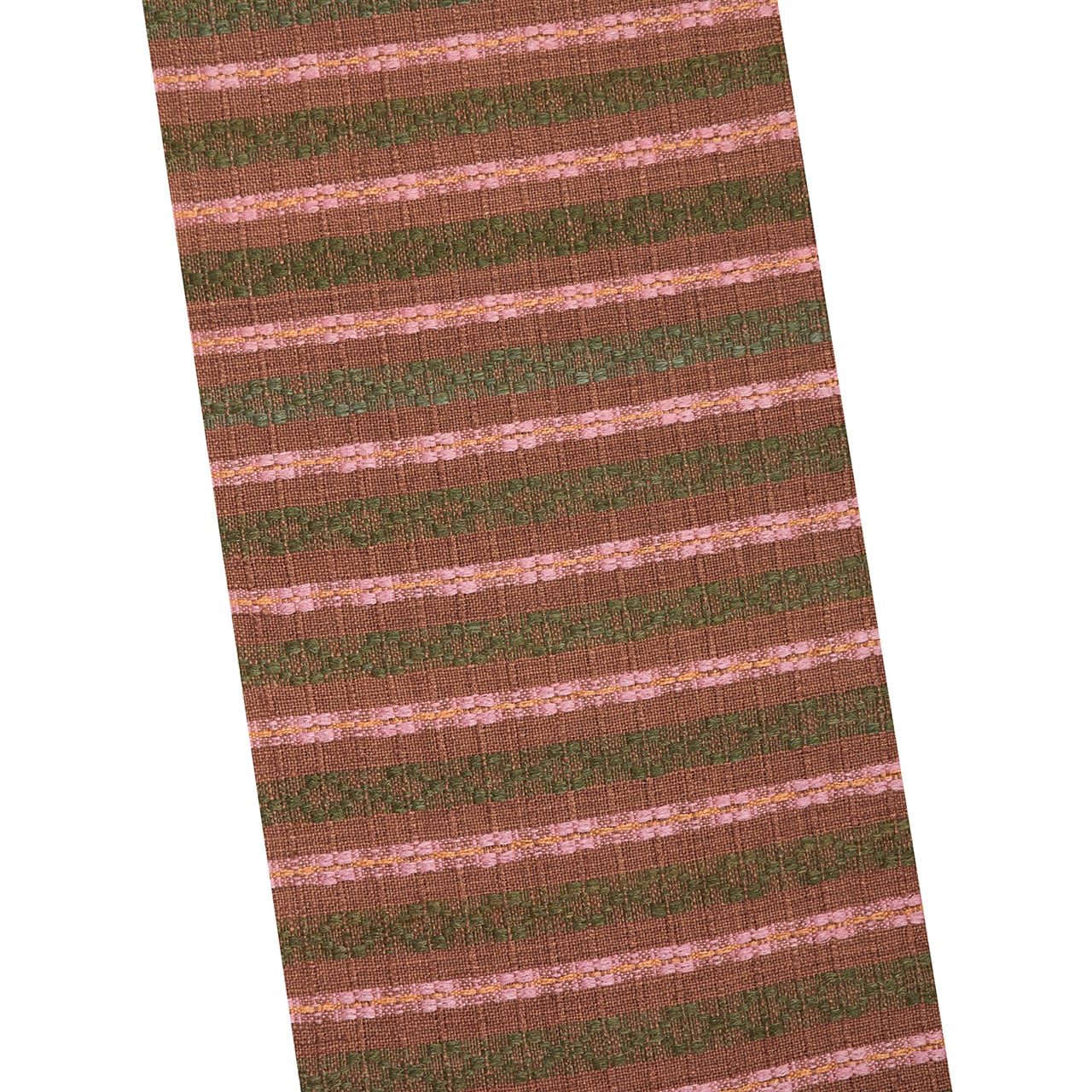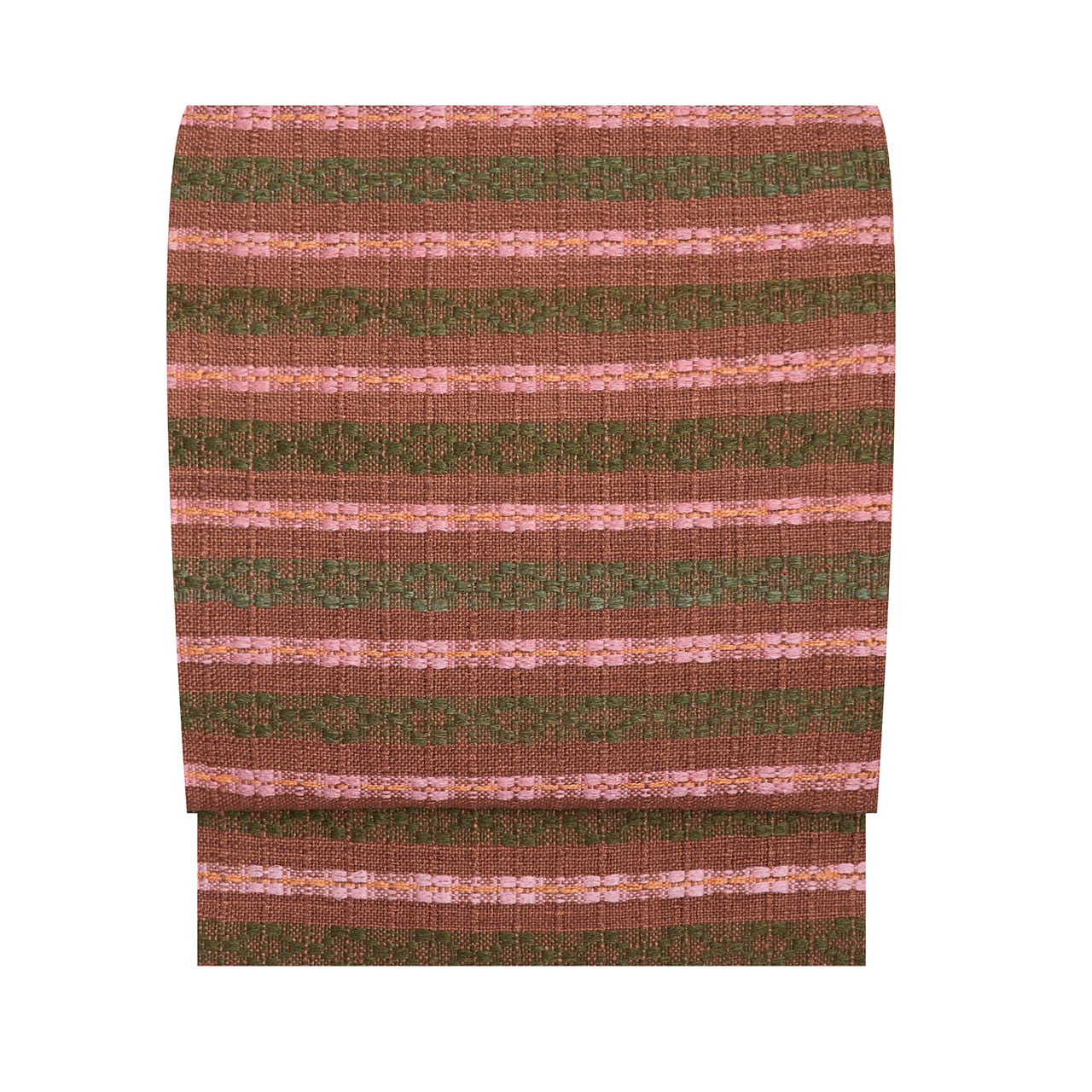 真綿紬のふっくらとした質感の銀煤竹色の薄茶の地に、やや太い縦糸が縞のように織り込まれた変化のある地織りに、横には淡い綺麗なピンク・桃色に淡黄色の糸が渡った花織と、くすんだ緑・虫襖色の花織とが交互に並んで織り出された、手織りの味わいがしっかりと感じられるような素敵な八寸名古屋帯です。
