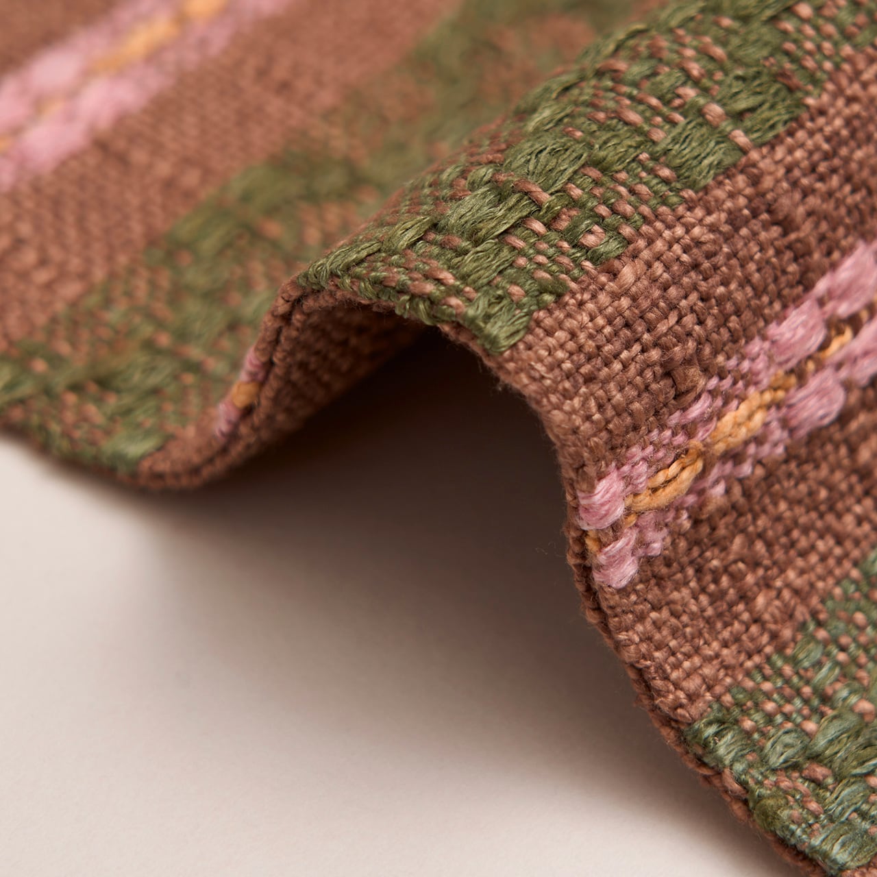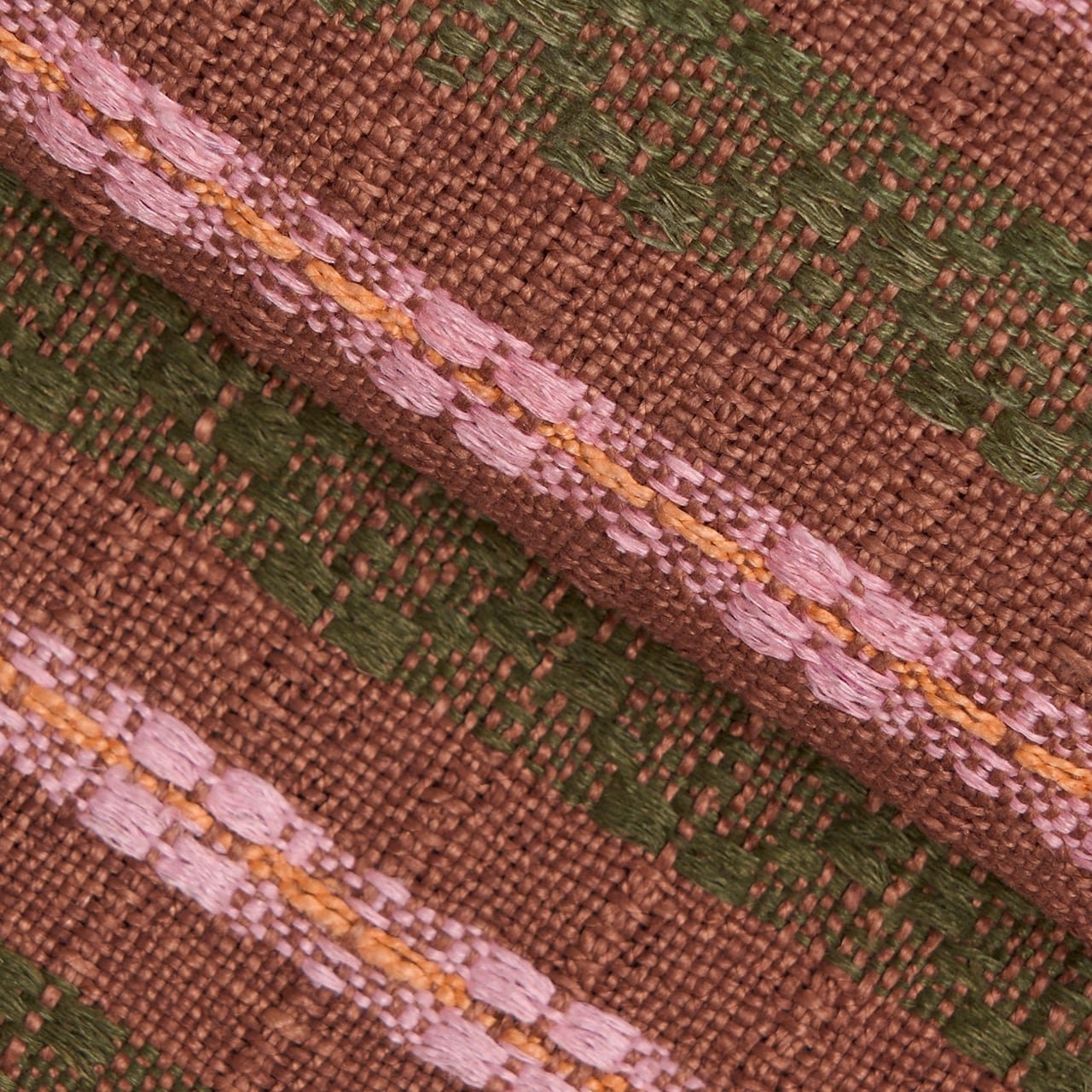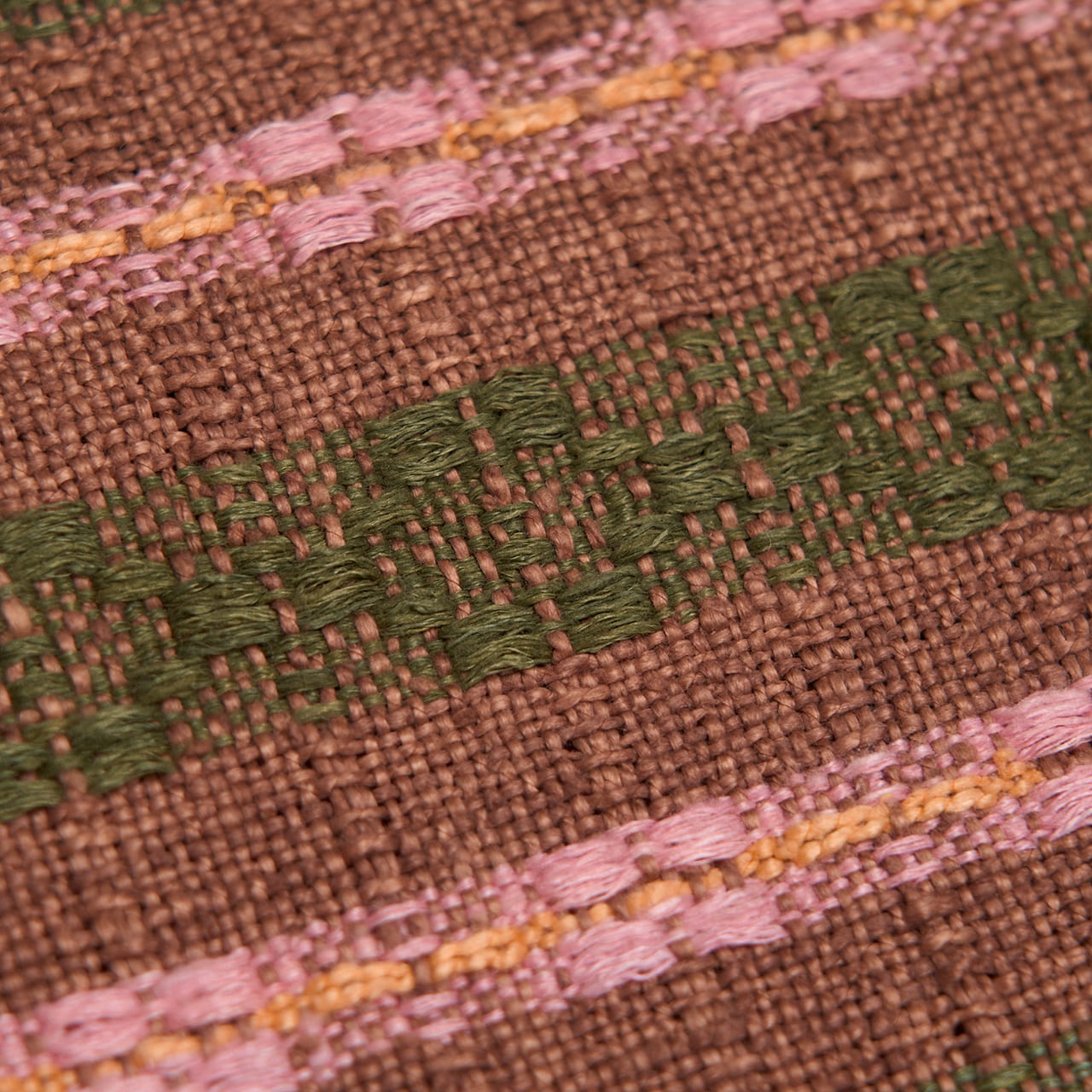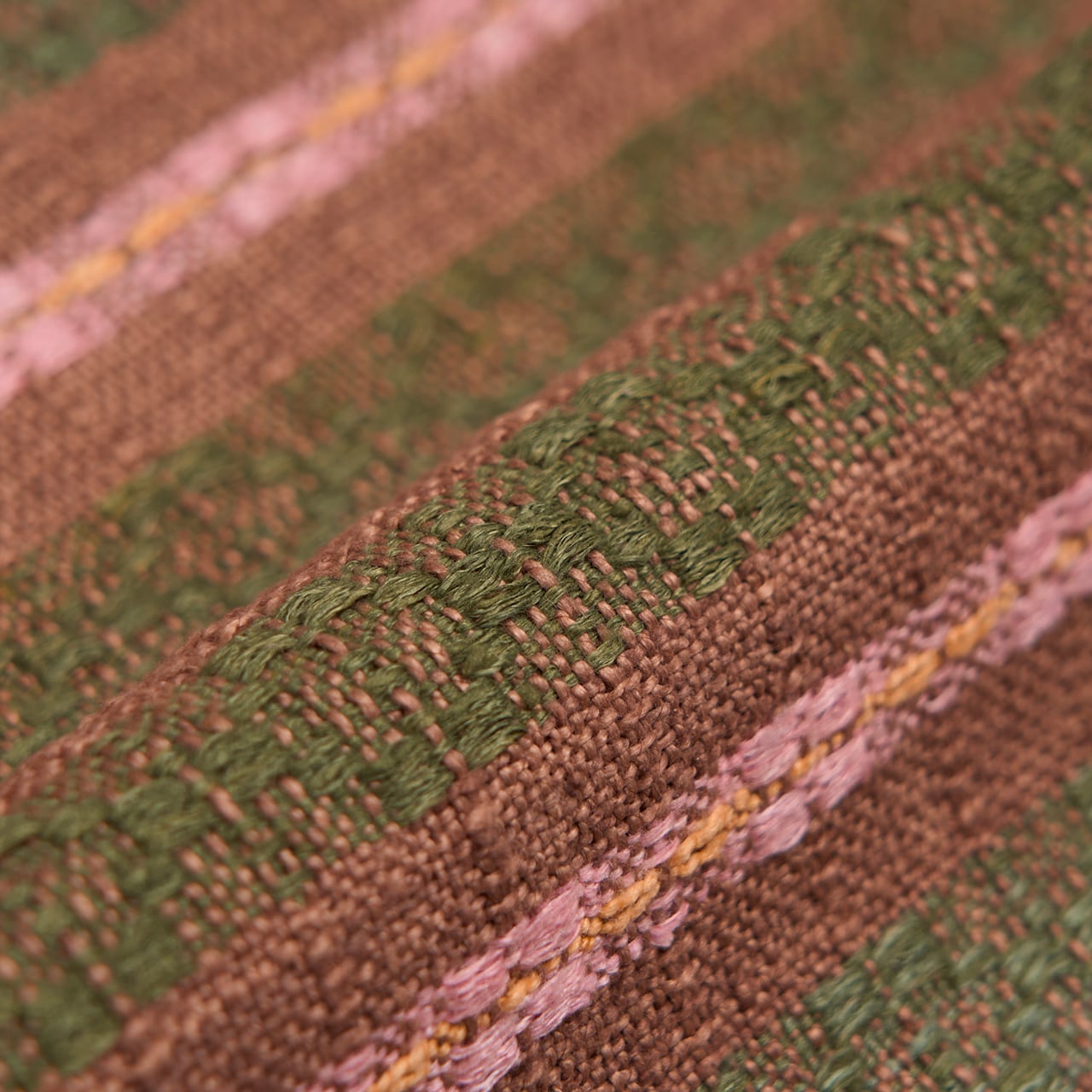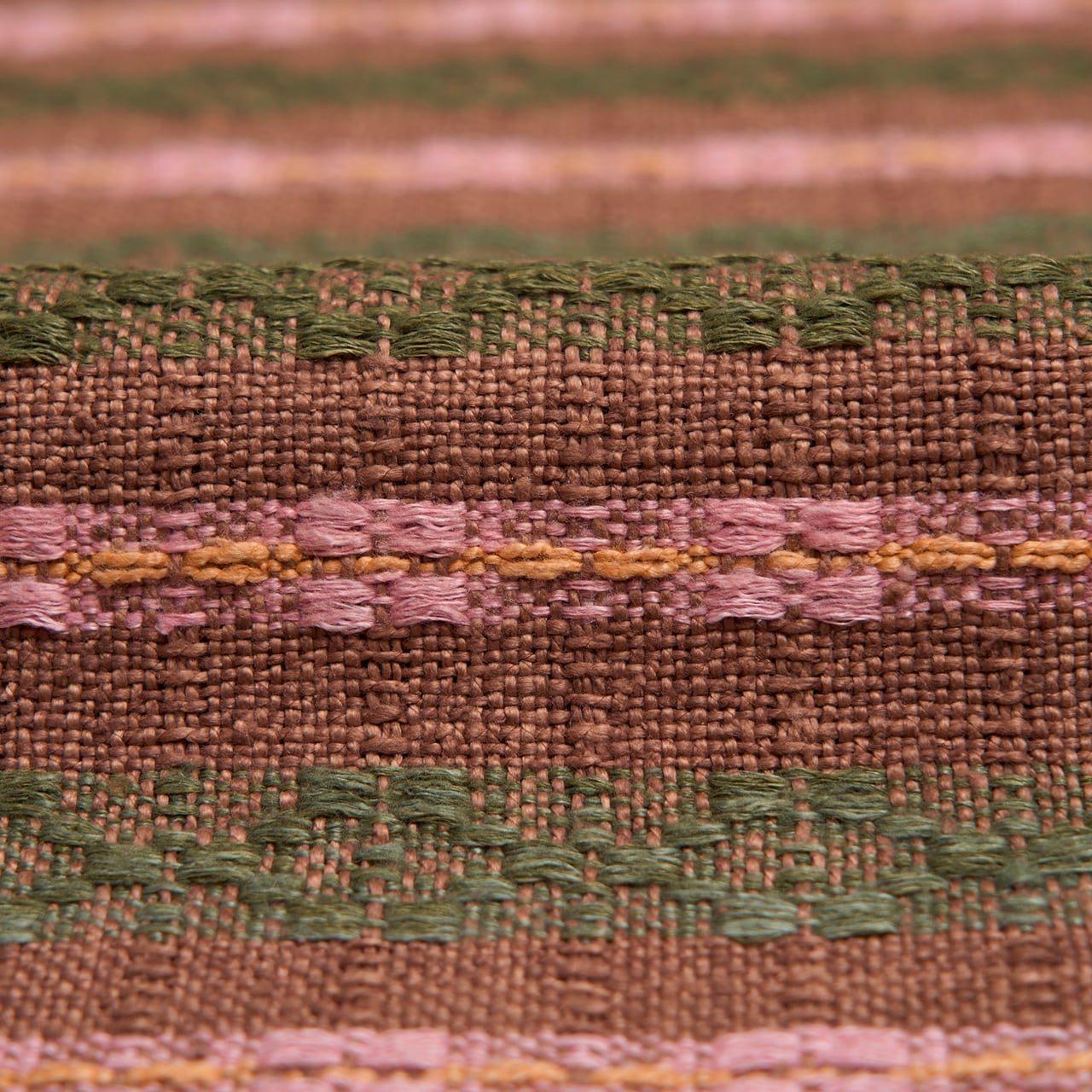 真綿紬のふっくらとした質感の銀煤竹色の薄茶の地に、やや太い縦糸が縞のように織り込まれた変化のある地織りに、横には淡い綺麗なピンク・桃色に淡黄色の糸が渡った花織と、くすんだ緑・虫襖色の花織とが交互に並んで織り出された、手織りの味わいがしっかりと感じられるような素敵な八寸名古屋帯です。