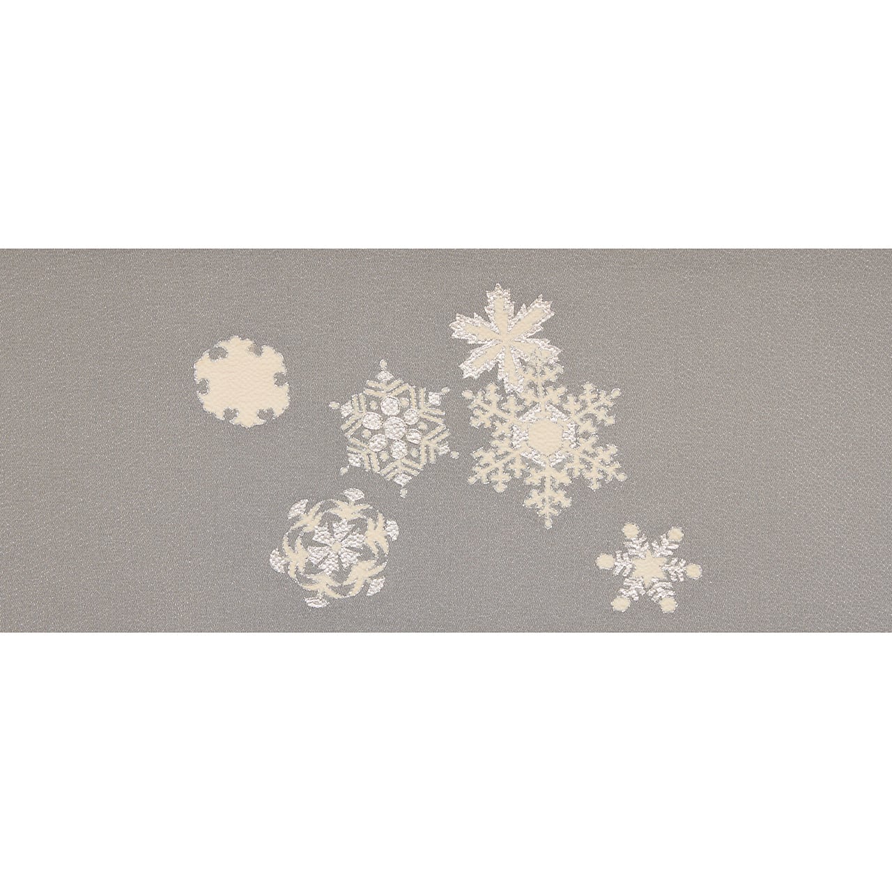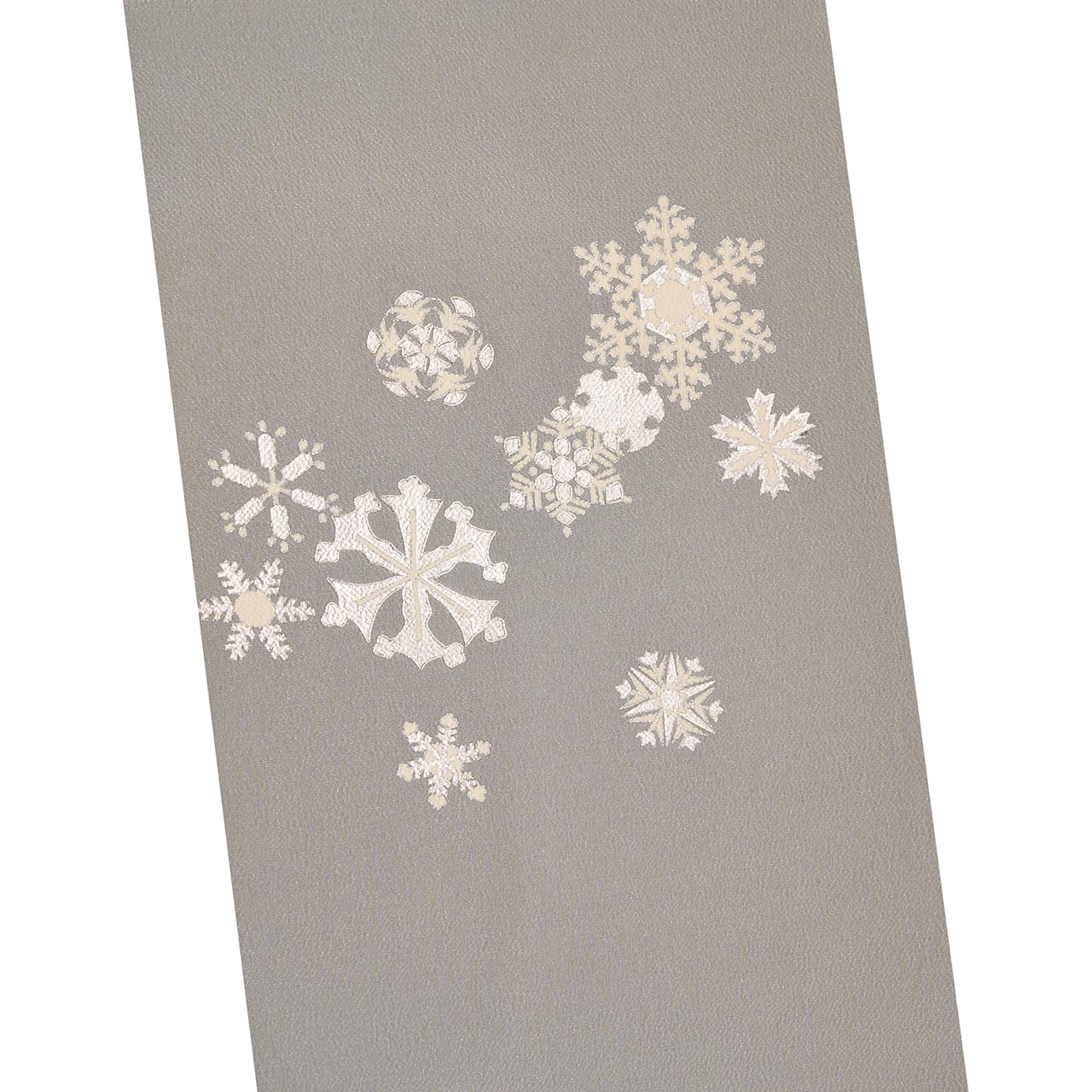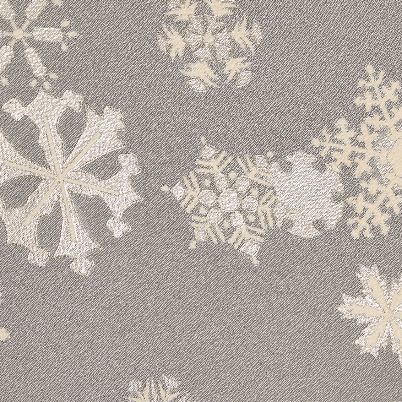 少しシボのある淡いグレー・薄鈍色のちりめんの生地のお太鼓に、いろいろな形をした雪の結晶の模様が白く友禅で染め抜かれ、細やかに胡粉で色付けされたり、銀の摺箔が施されたり、銀駒糸で手刺繍をされたりした、シンプルに見えながらもとても手の込んだお仕事をされた、素敵な冬の九寸名古屋帯です。