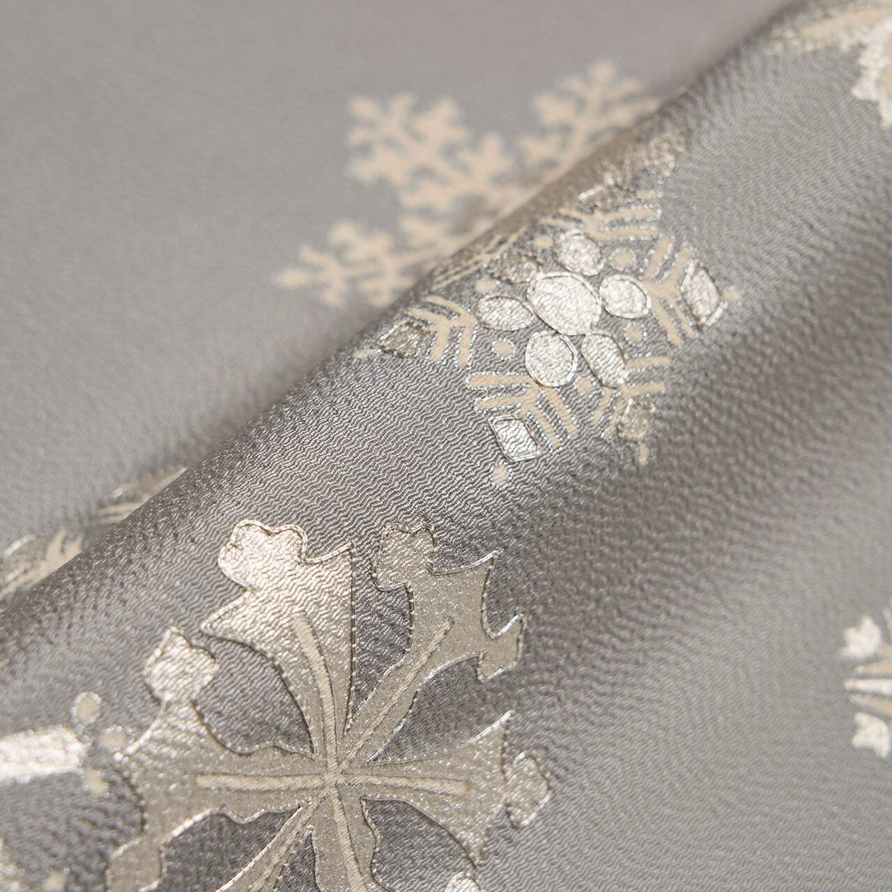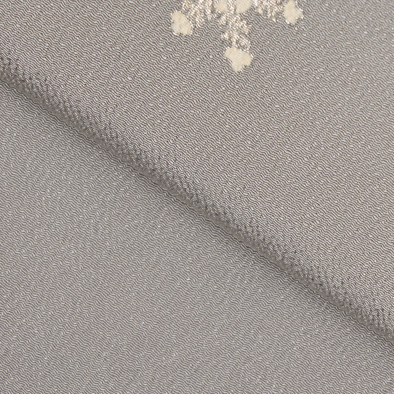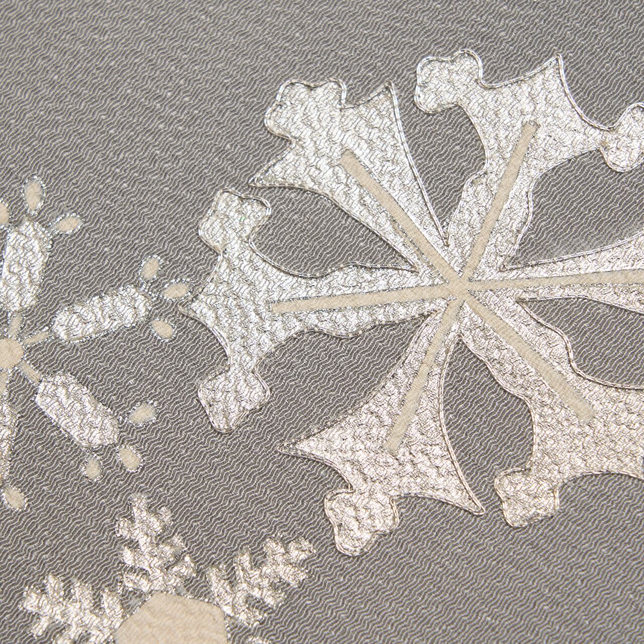 少しシボのある淡いグレー・薄鈍色のちりめんの生地のお太鼓に、いろいろな形をした雪の結晶の模様が白く友禅で染め抜かれ、細やかに胡粉で色付けされたり、銀の摺箔が施されたり、銀駒糸で手刺繍をされたりした、シンプルに見えながらもとても手の込んだお仕事をされた、素敵な冬の九寸名古屋帯です。