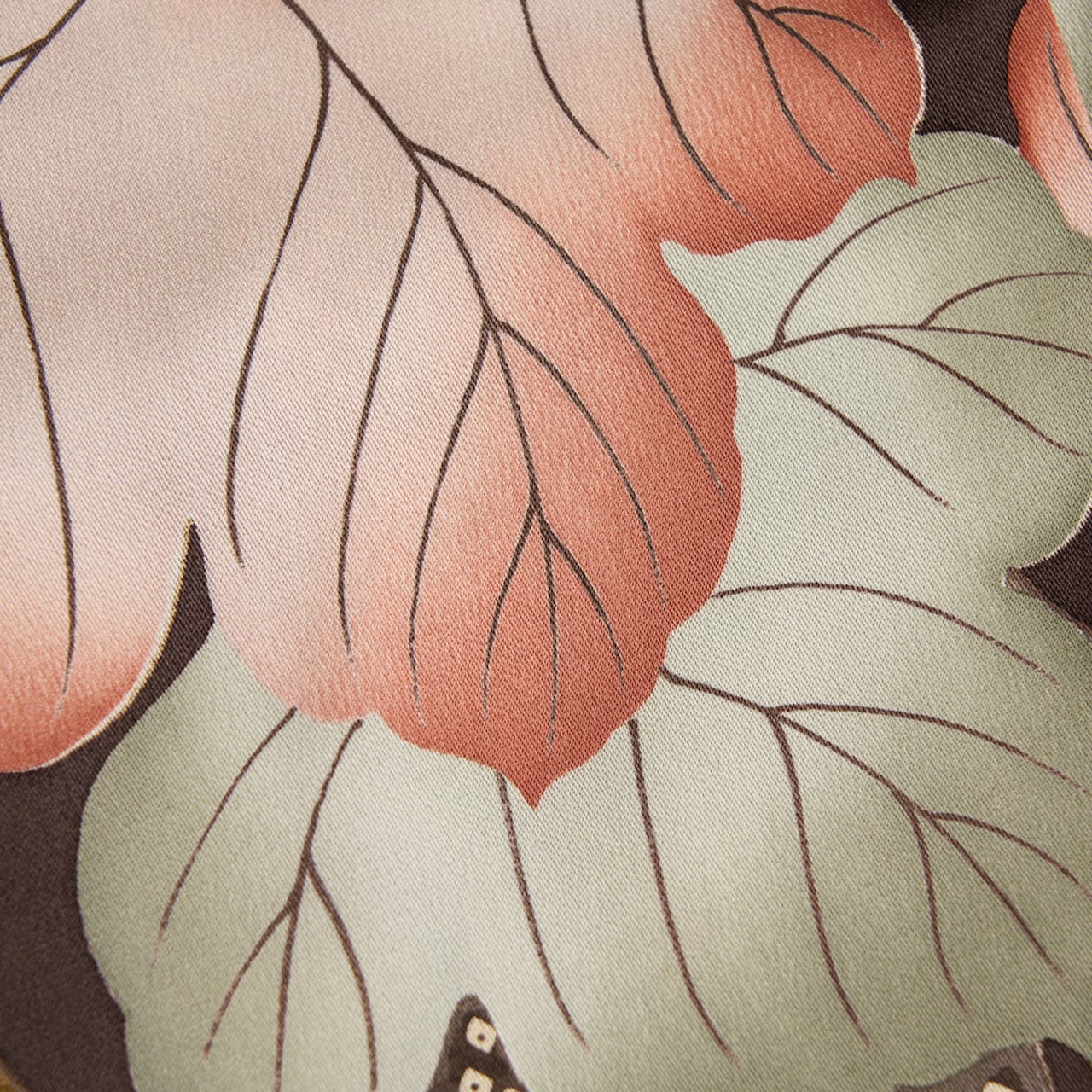 すっくと伸びた竹の幹の清々しさと、はらりとした柔らかいイメージの桐の葉とのコントラストが絶妙で、色合いも、竹はシックな利休色や黄海松茶色の抑えたもの、桐はやや明るめの紅樺色や利休白茶色、青朽葉色などの華やかなものとなっているのも、練られたデザインだと感じられます。