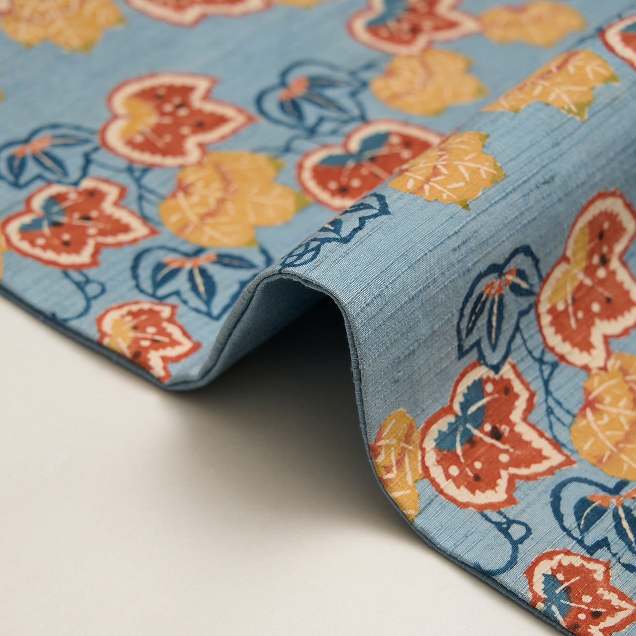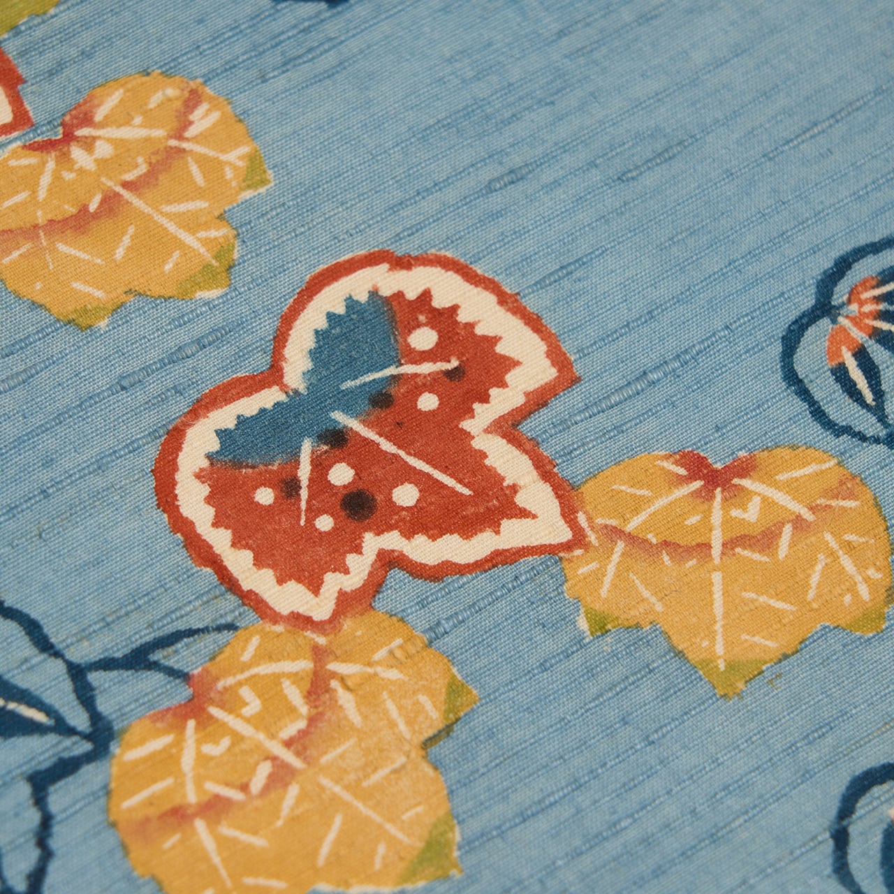 また、全部が紅葉しているといったわけでもなく、藍色の葉もあり、型絵染特有のあまり季節を限定されない描き方で、モチーフ的には春先にも取り入れていただけると思います。