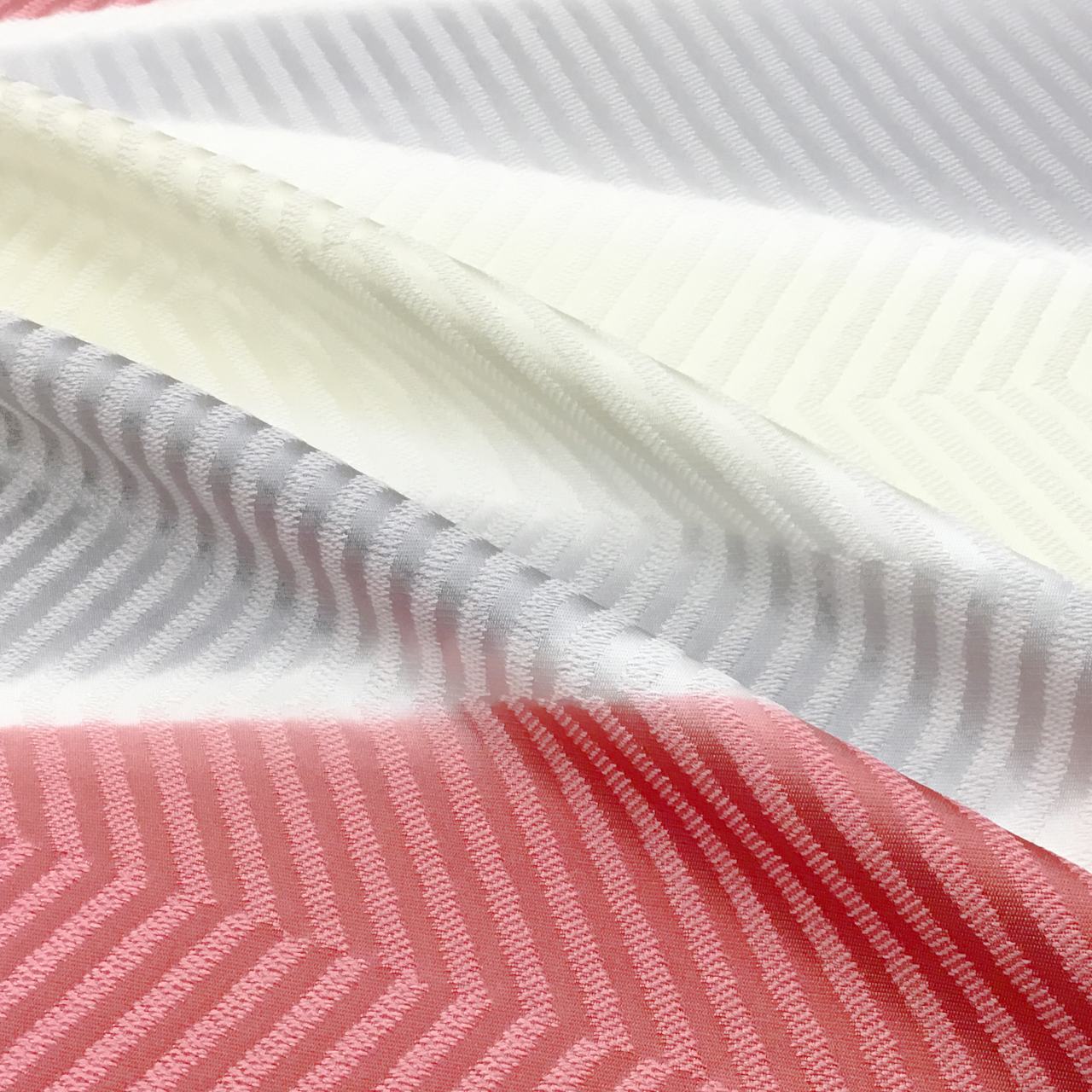 灰青色の地に、真紅色・灰青色・灰白色の三色が斜めに暈し染めされ、さらに防染糸が斜めの切り返し模様として織り込まれています。