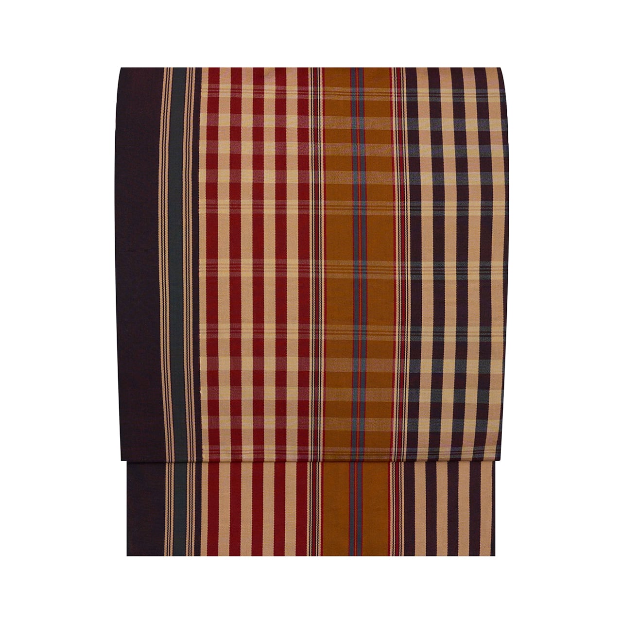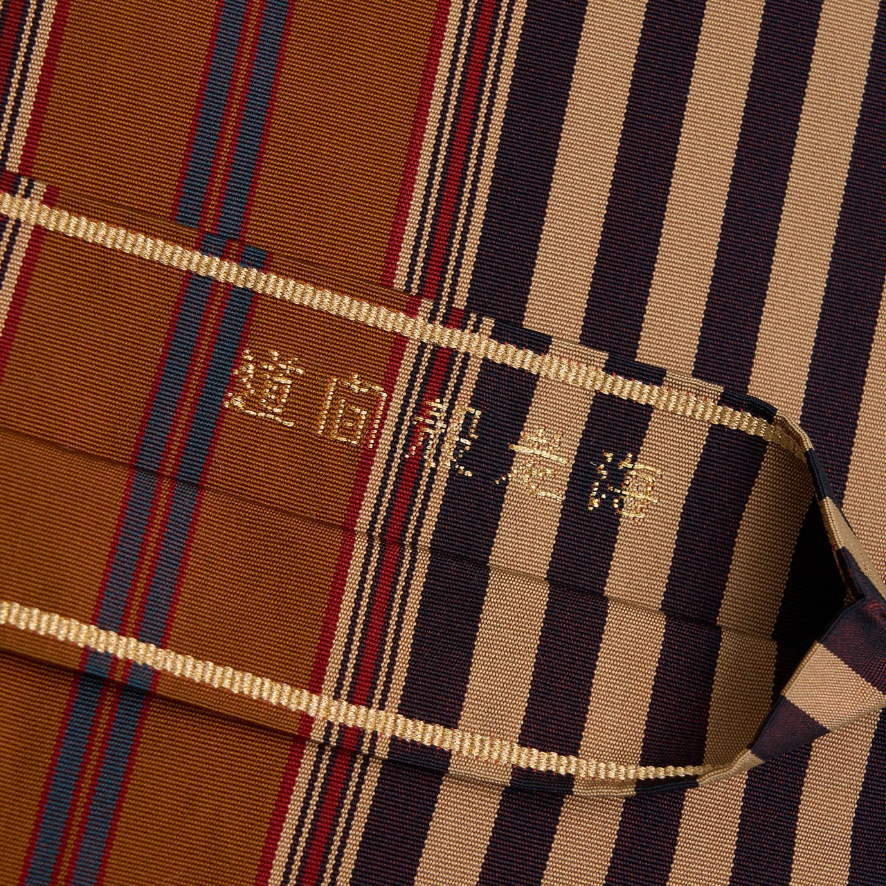 真ん中よりやや右寄りに紅樺色の太い縞が走り、その右側は紫鳶色の濃い縞が入れられ、左側には海老茶・濃紅色の縞が入れられたメリハリのあるものとなっていて、お太鼓にはうっすらと見える横縞が交差するといったお洒落さですが、そのお洒落な縞模様と奥ゆかしい光沢とで、なんともいえない素敵な佇まいとなっています。