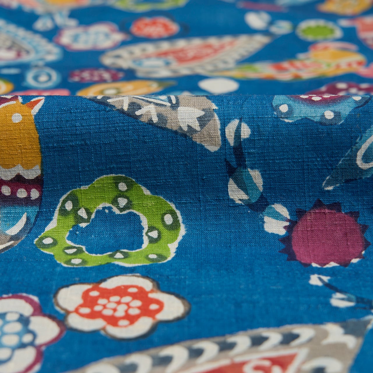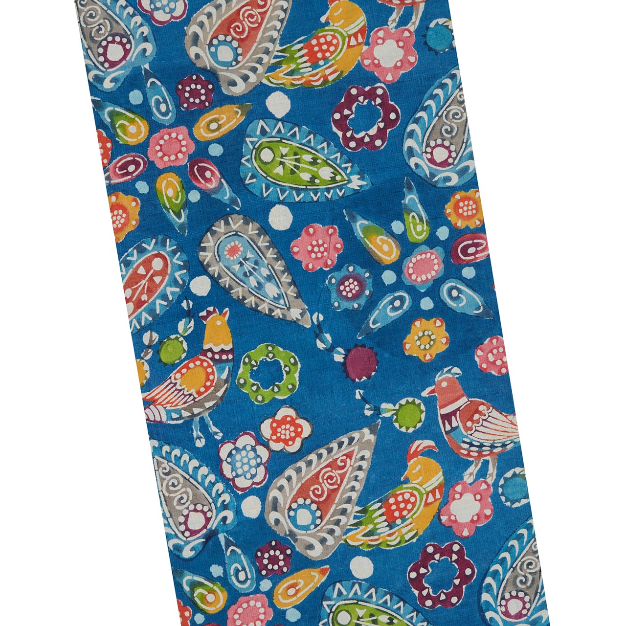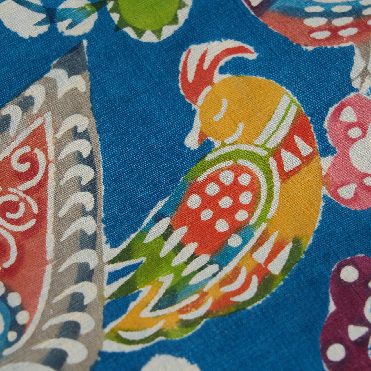 緯糸に節の見られる座繰りのしなやかな紬地が明るい藍・紺鼠色に染められ、少し大きめのペイズリーがお花のような形に集まったもの、小さめのドロップ型の模様が並んでやはりお花の形を表したもの、その間に小さなお花などが色とりどりに染められ、さらにその傍らに綺麗な色使いの小鳥の姿があるといった楽しい模様が、型絵染で染められた素敵な九寸名古屋帯です。