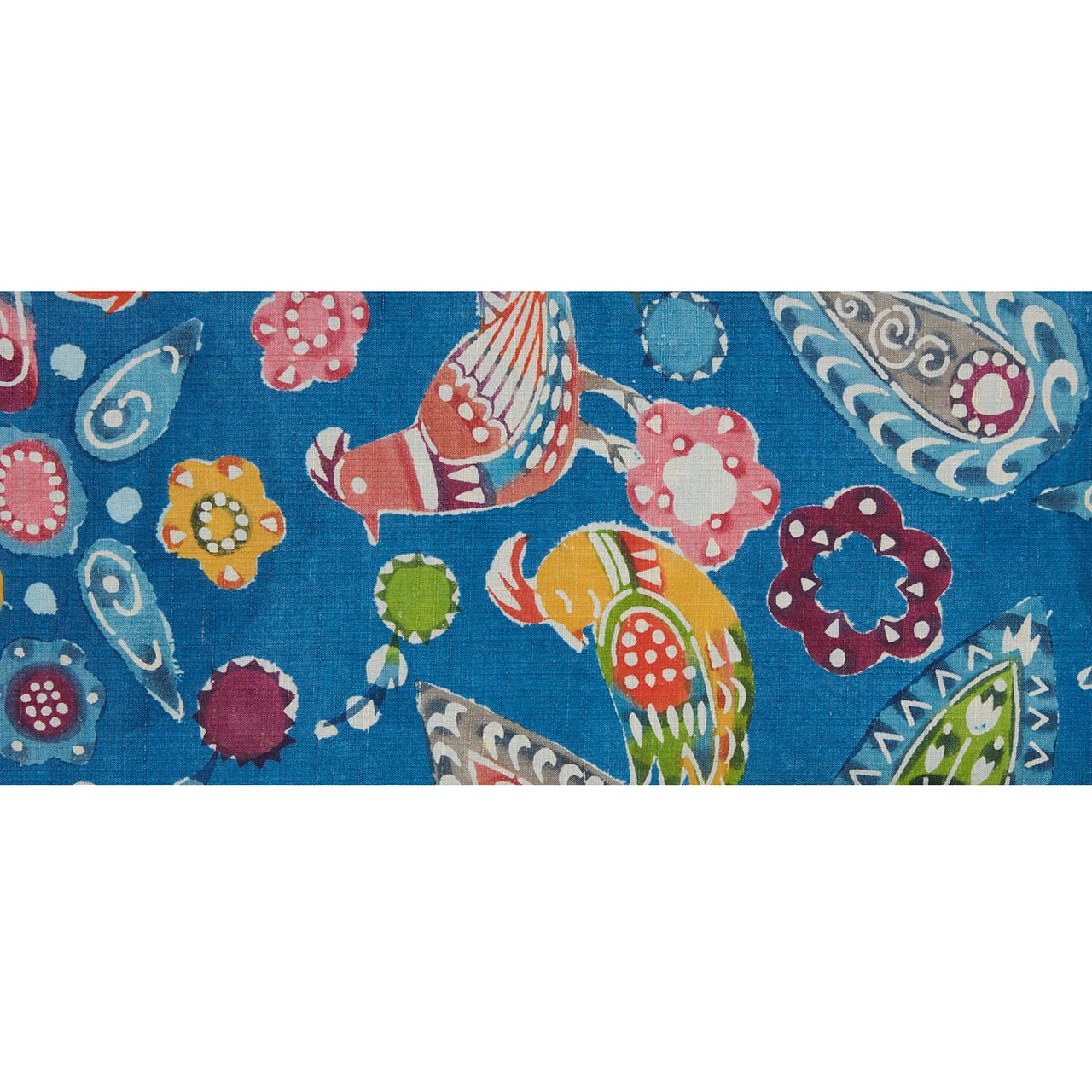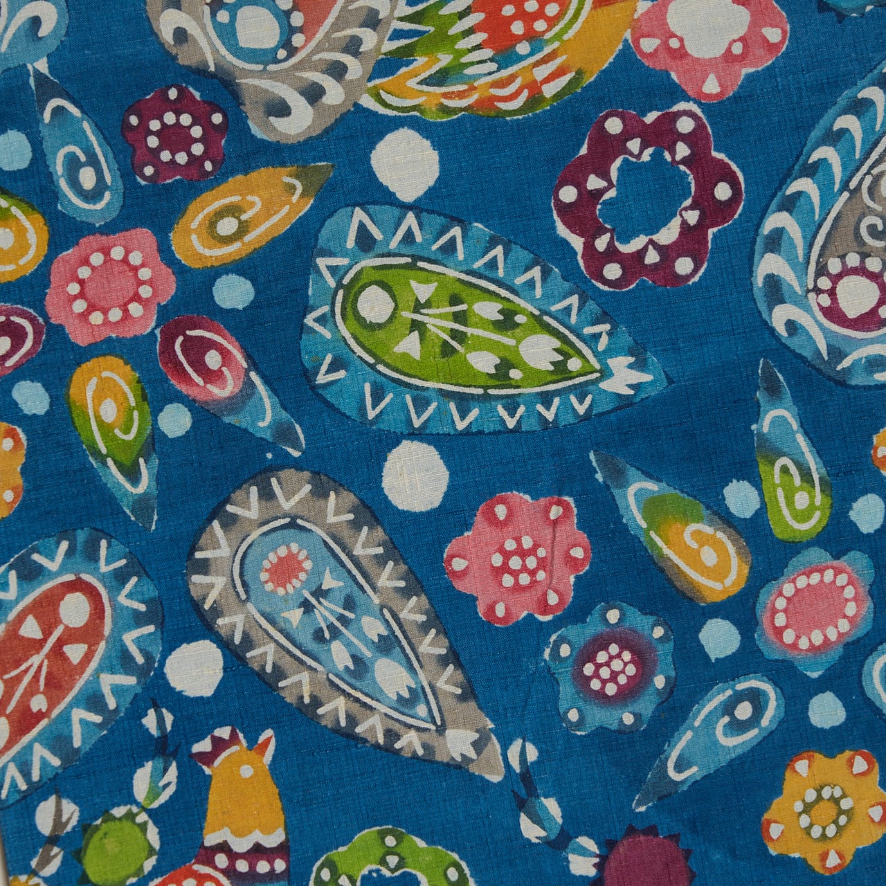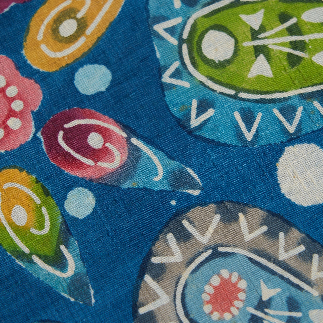 この少し不器用な感じの模様の輪郭や、友禅染ではありえないような色使いなどには、型絵染ならではの面白さが感じられます。