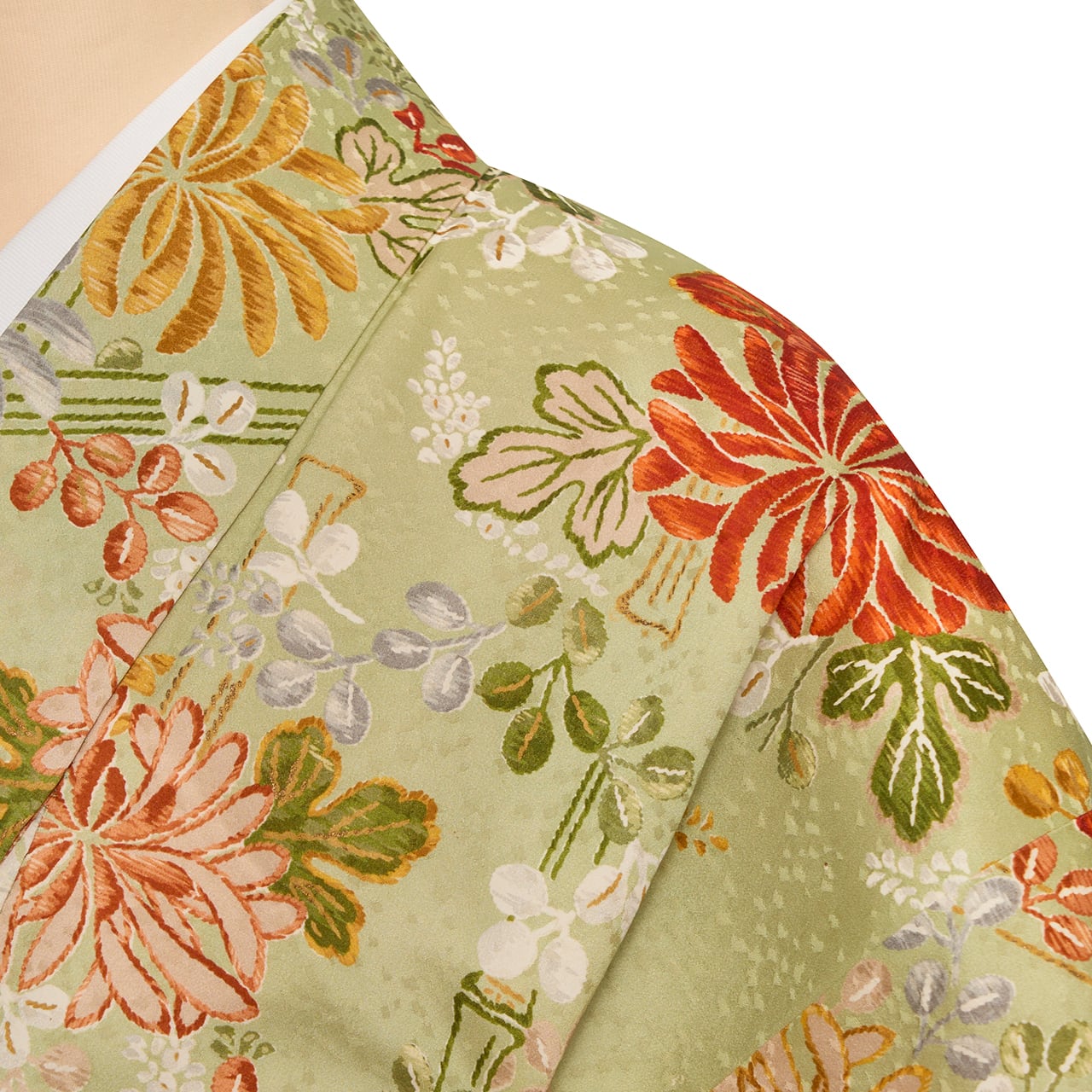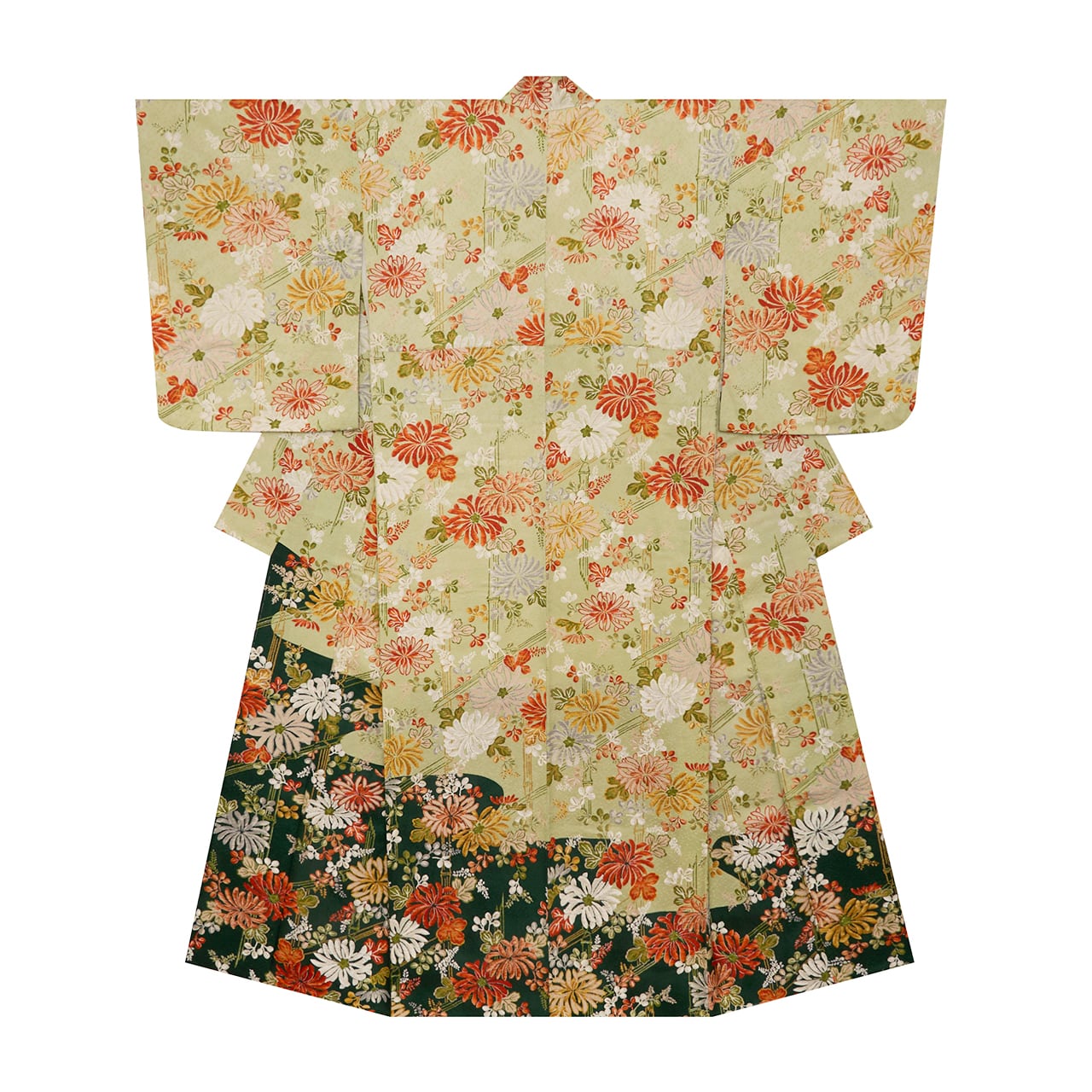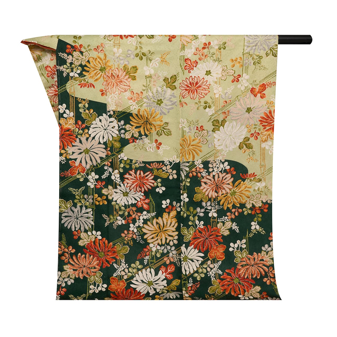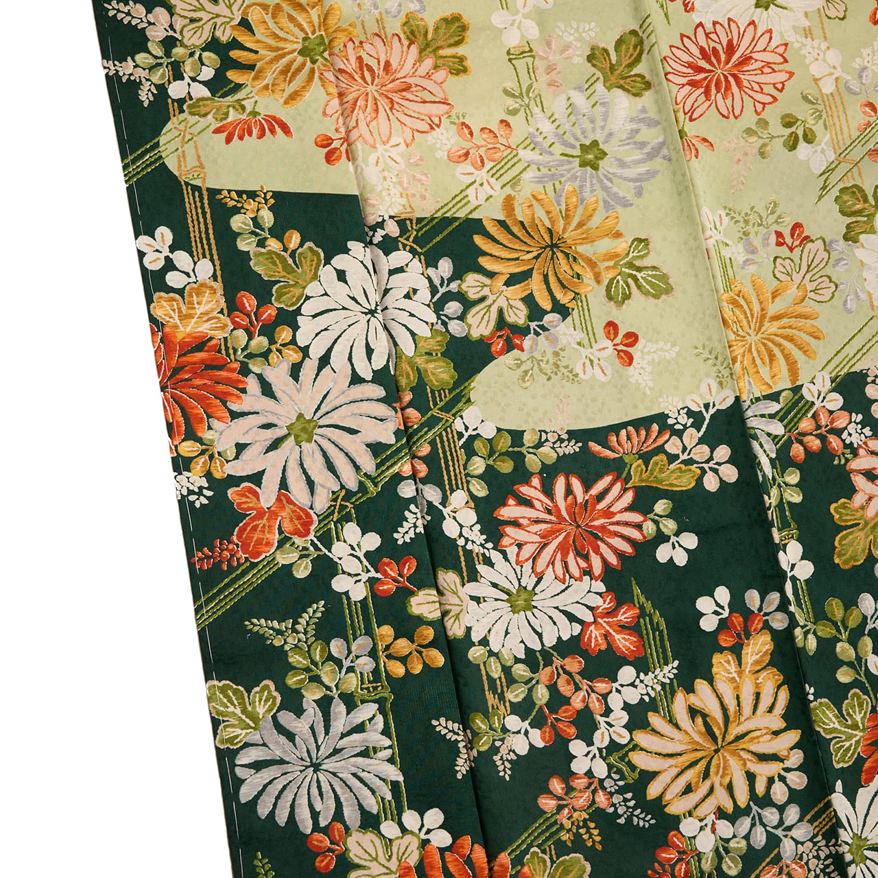 小さな水玉のような、霰文のような地模様のある重めの紋意匠の生地が、淡い青磁色のような薄緑・山葵色に染められ、上前から下前に向かって霞の形に濃い深緑・天鵞絨色に染め分けられ、全体に菊のお花がたくさん染められた、とても華やかな多ち花さんの訪問着のお着物です。